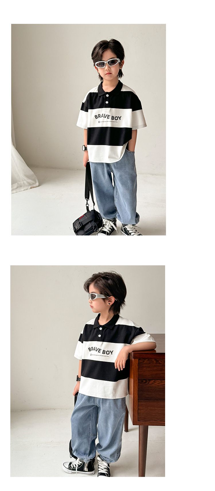 Haima의 2025 새 여름 스타일 소년 한국 스타일 스트라이프 반팔 티셔츠 여름 폴로 셔츠 유행 어린이스토어 가기