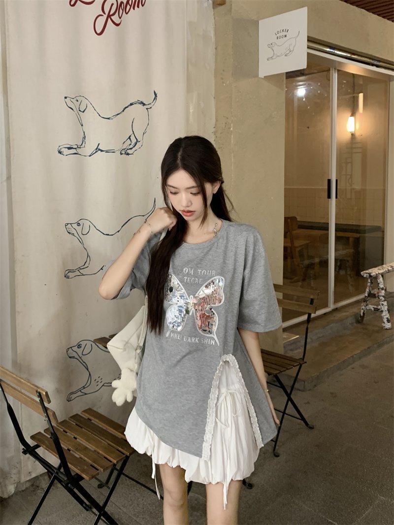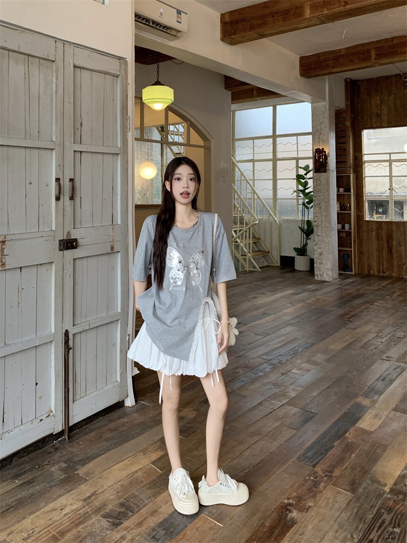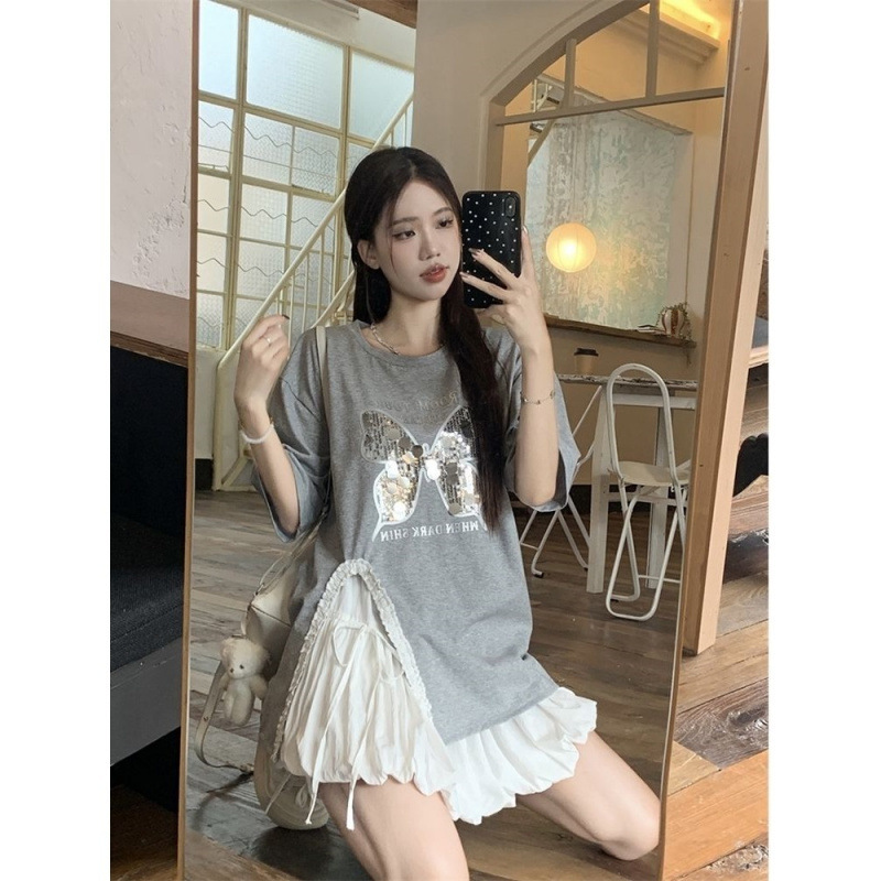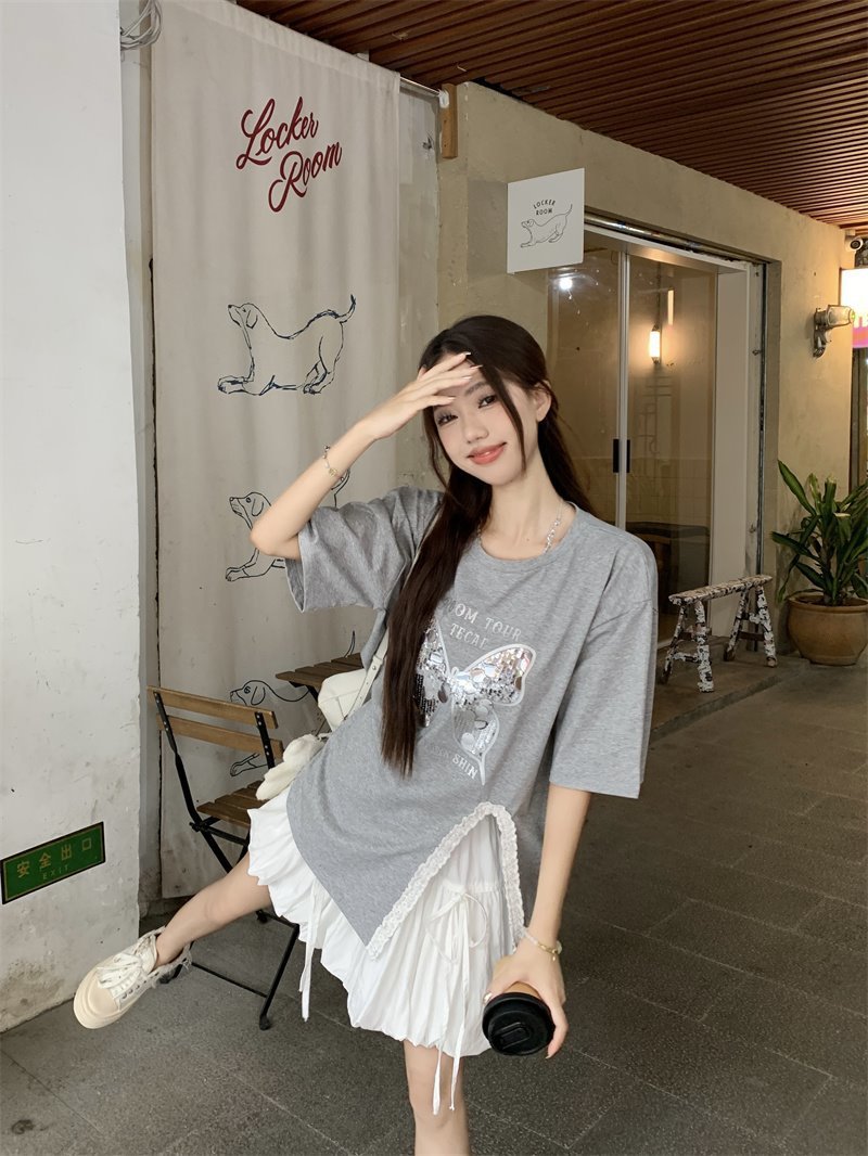 귀 슬릿 나비 속편 디자인 반팔 티셔츠 하이 웨이스트 A 라인 반쪽 치마 여성 여름 패션 세트스토어 가기