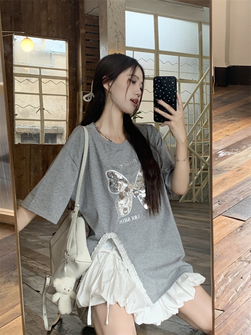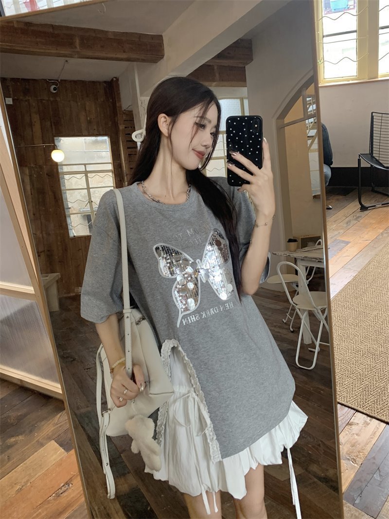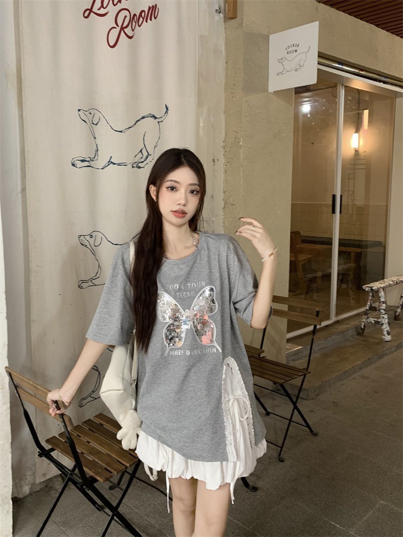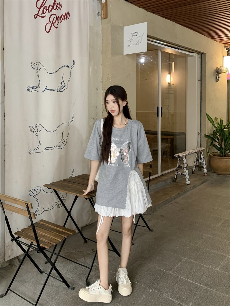 귀 슬릿 나비 속편 디자인 반팔 티셔츠 하이 웨이스트 A 라인 반쪽 치마 여성 여름 패션 세트스토어 가기