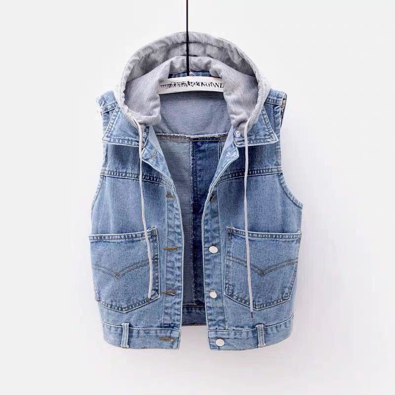 데님 조끼 여자 쇼트 2025 봄 · 가을 새 한국식 올매치 후드형 대형 포켓 조끼 민소매 조끼 탑스토어 가기