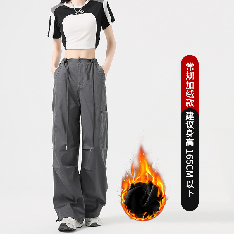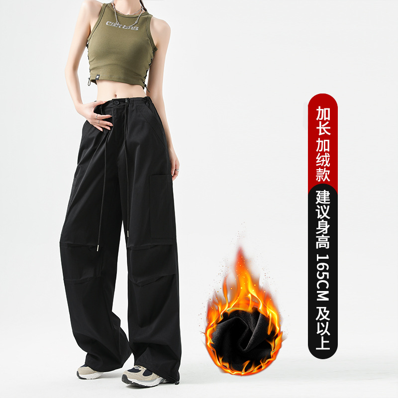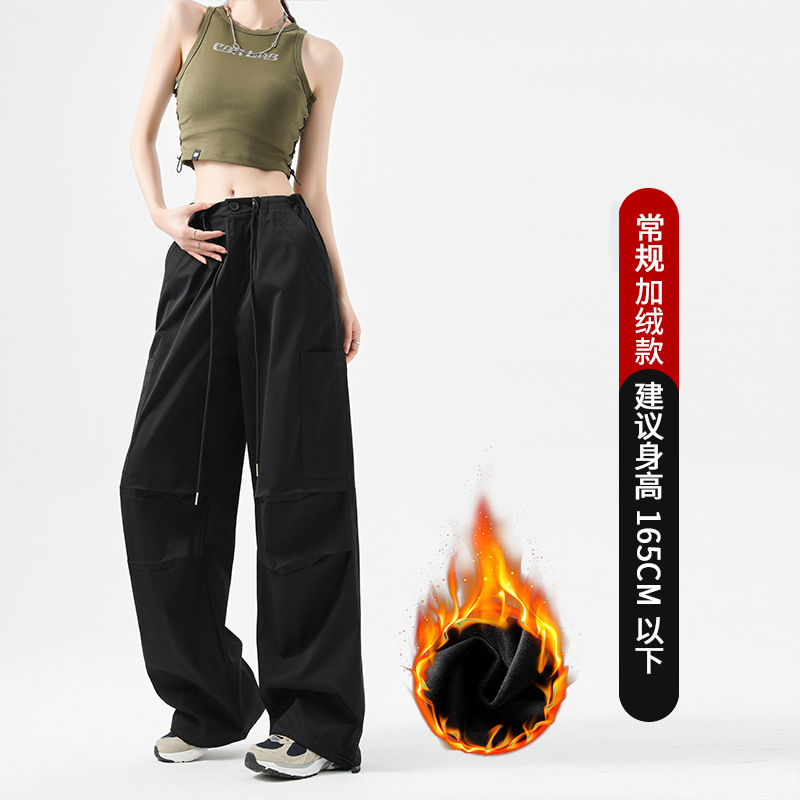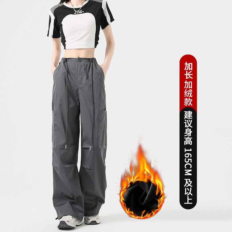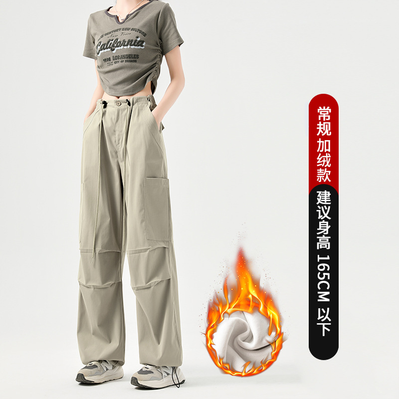 미국 스타일 작업복 바지 여성용 가을 겨울용 플리스 안감 두꺼운 하이웨이스트 루즈핏 조임끈 포켓 스포츠 등산 캐주얼 바지 여성용스토어 가기