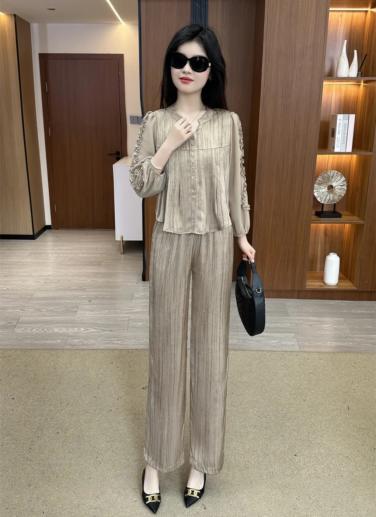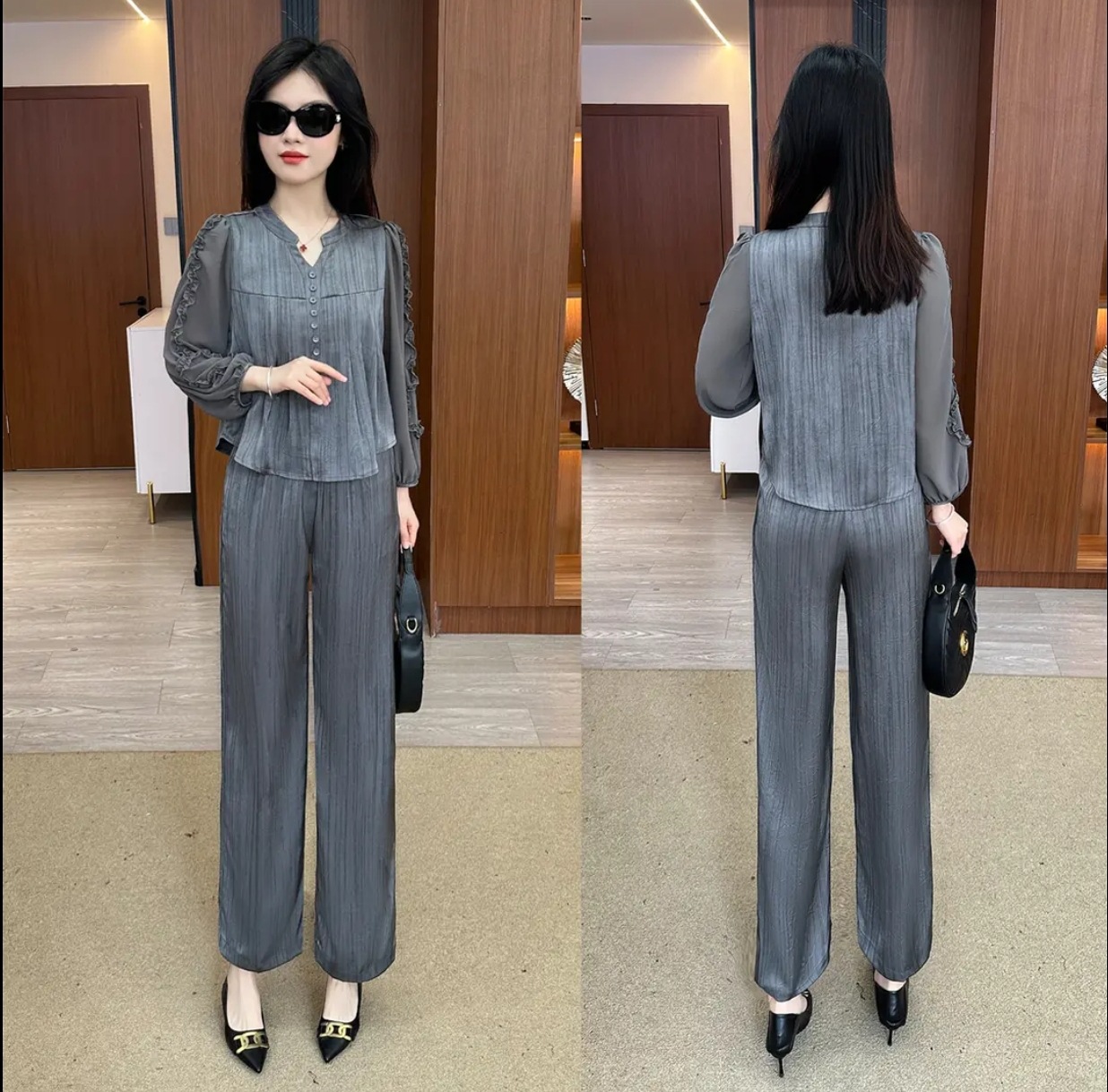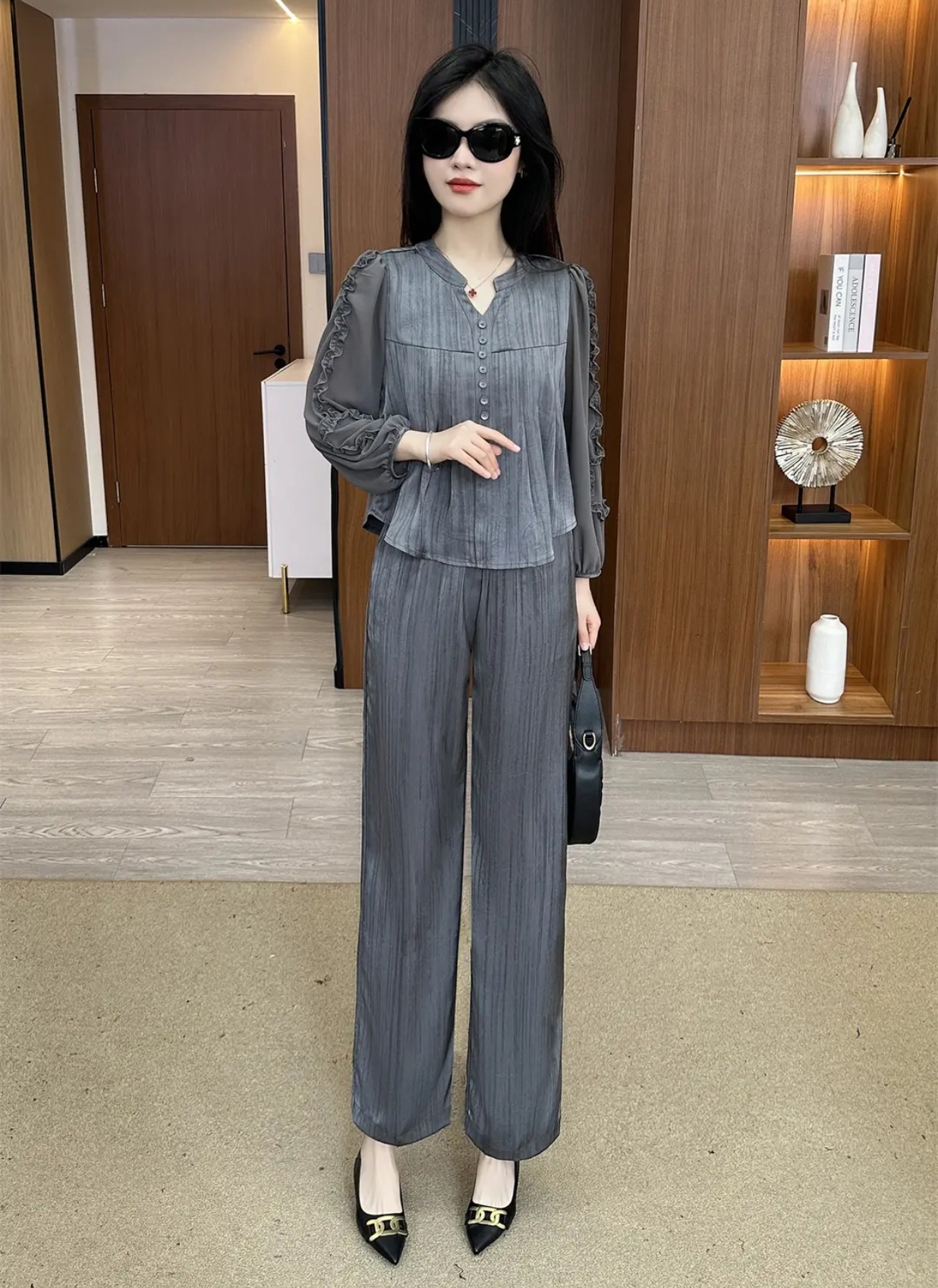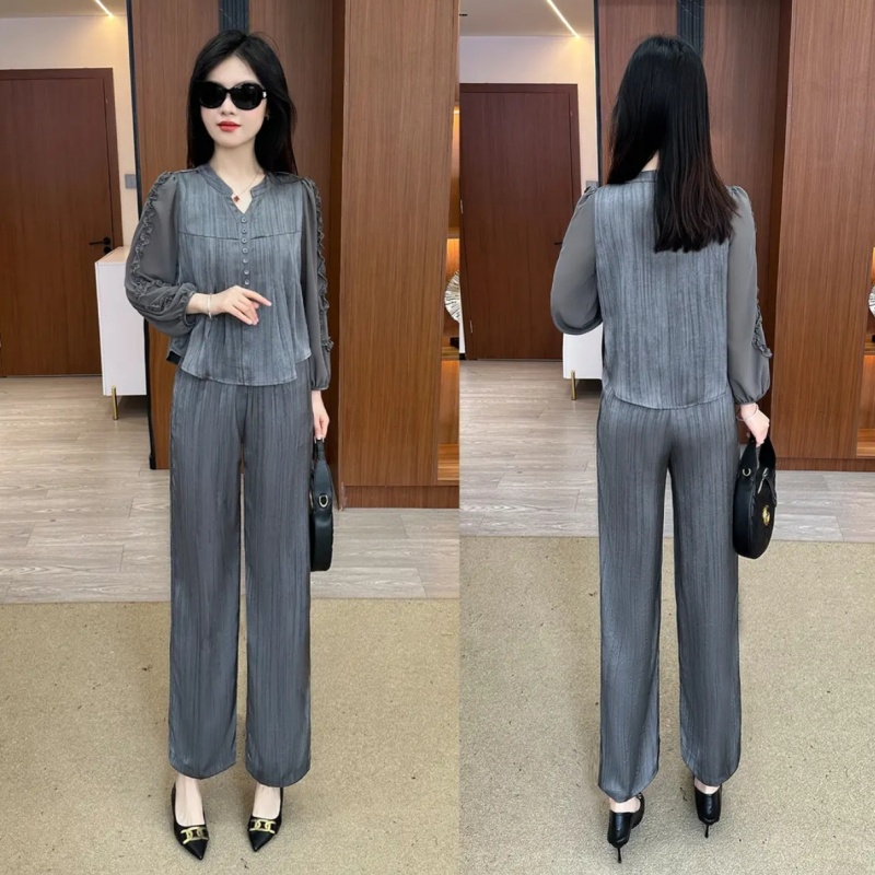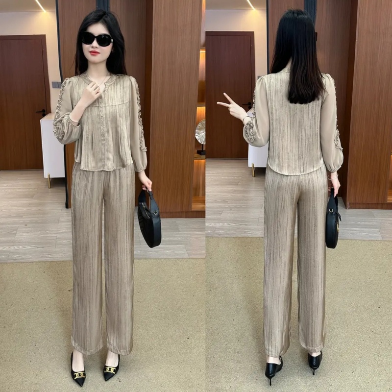 아이스 실크 패션 세트 여성의 봄과 가을 새로운 느슨한 배꼽 커버 V 넥 최고 캐주얼 바지 세련된 투피스 세트