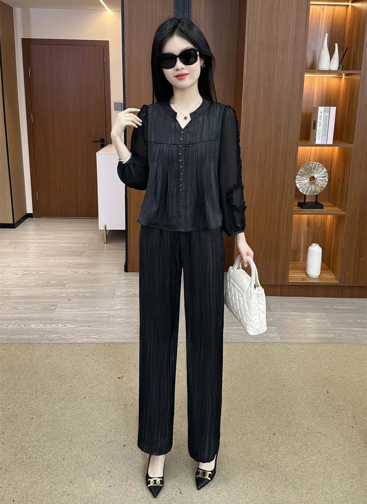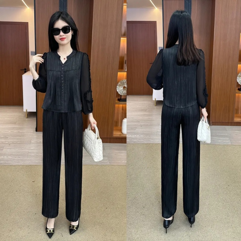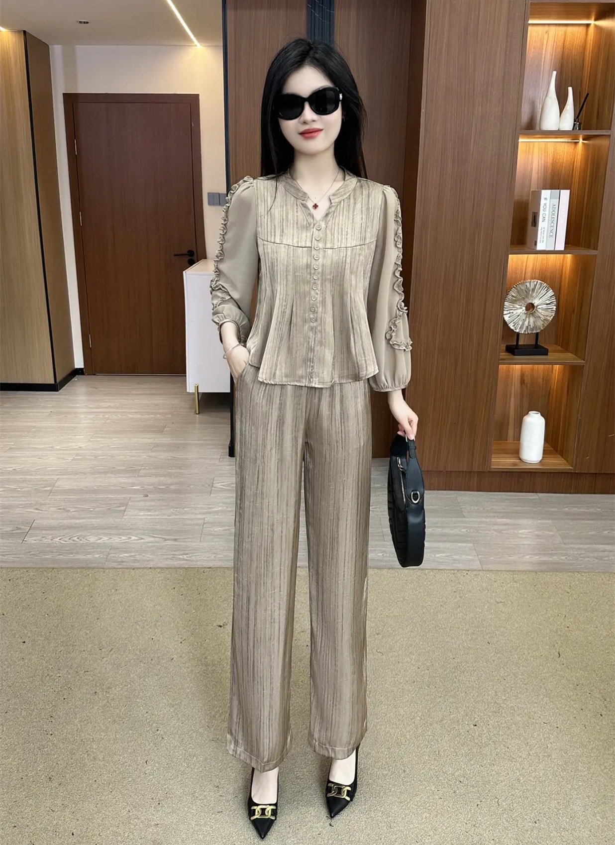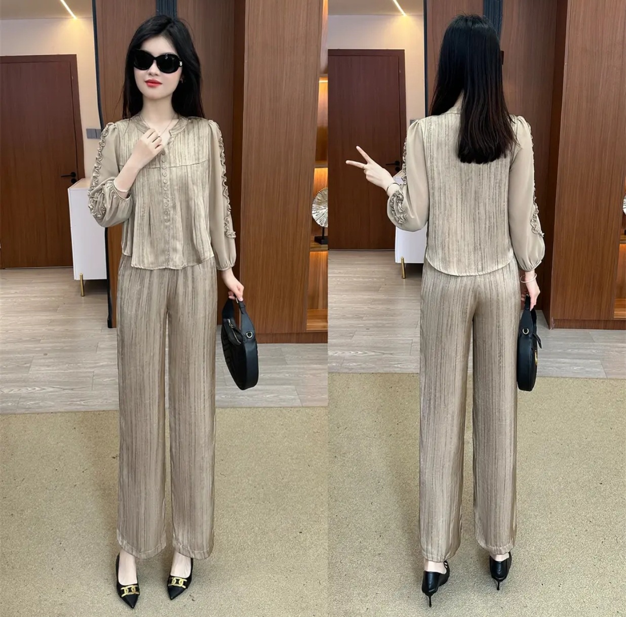 아이스 실크 패션 세트 여성의 봄과 가을 새로운 느슨한 배꼽 커버 V 넥 최고 캐주얼 바지 세련된 투피스 세트