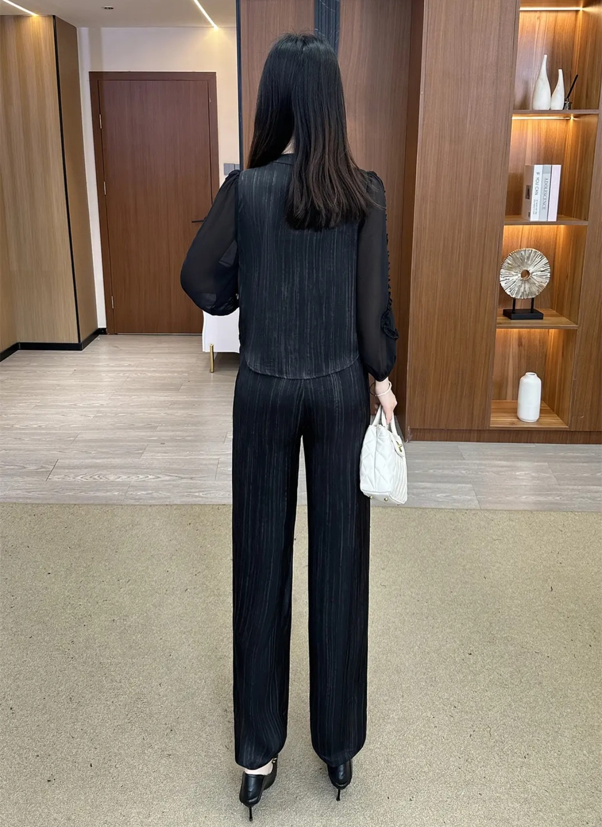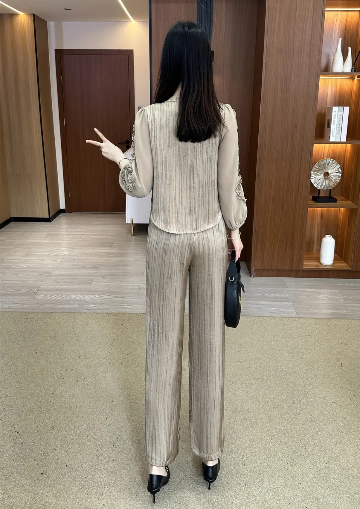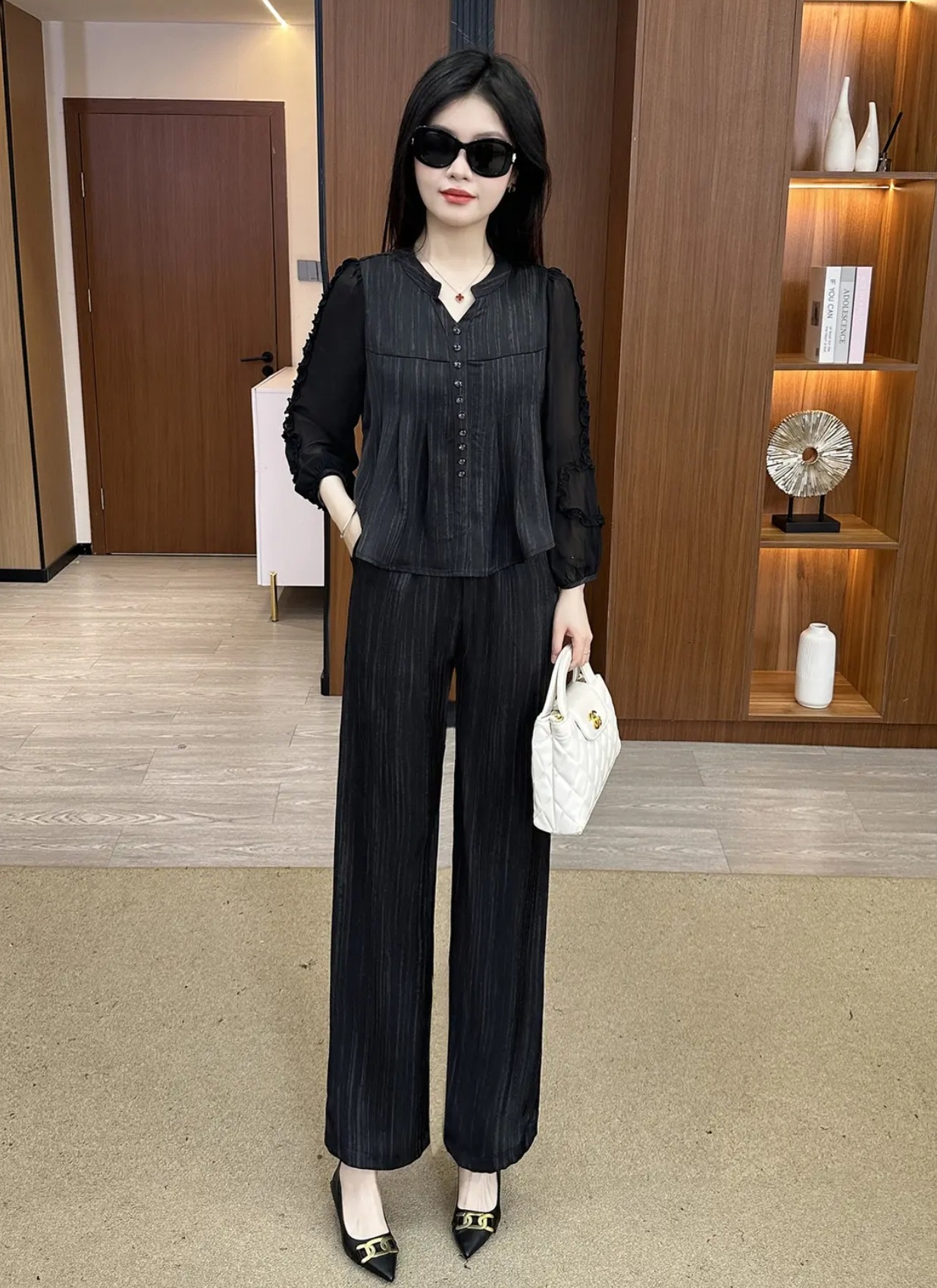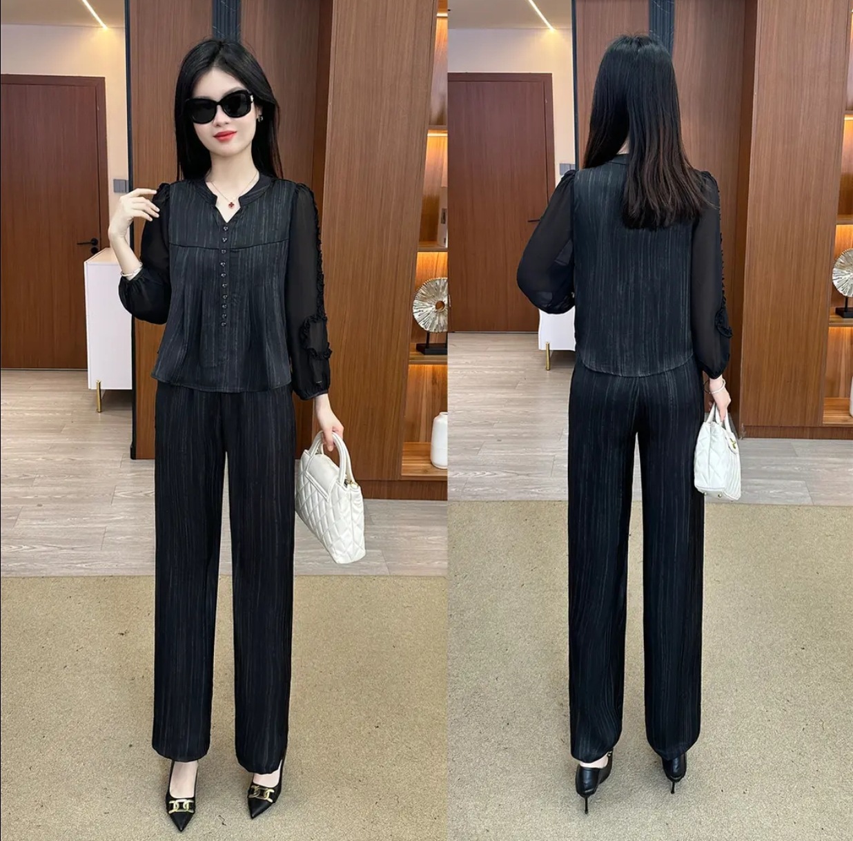 아이스 실크 패션 세트 여성의 봄과 가을 새로운 느슨한 배꼽 커버 V 넥 최고 캐주얼 바지 세련된 투피스 세트