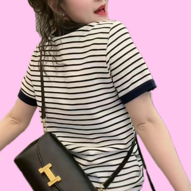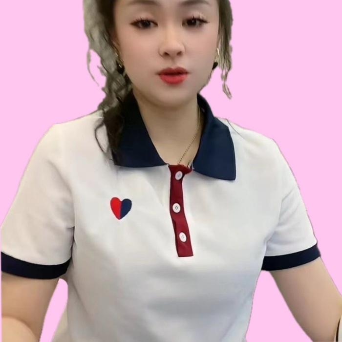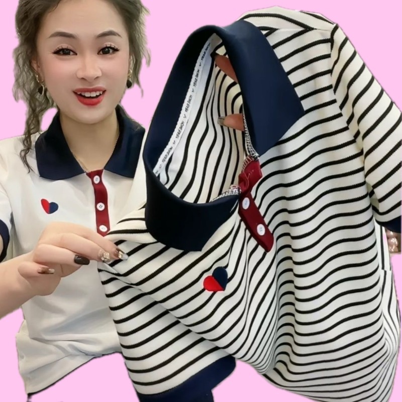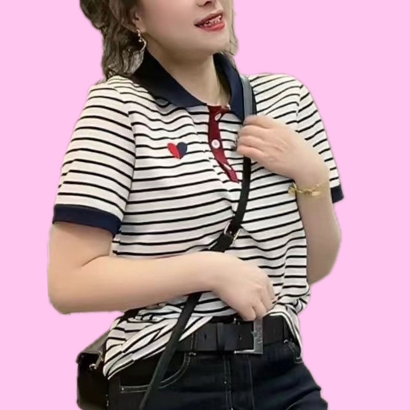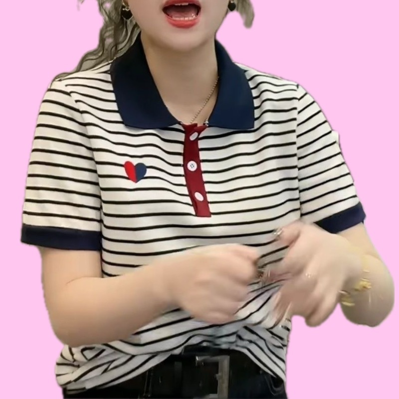 2025 여름 새로운 폴로 넥 우아한 통근 패션 간단한 캐주얼 편안한 줄무늬 명암 컬러 자수 티셔츠