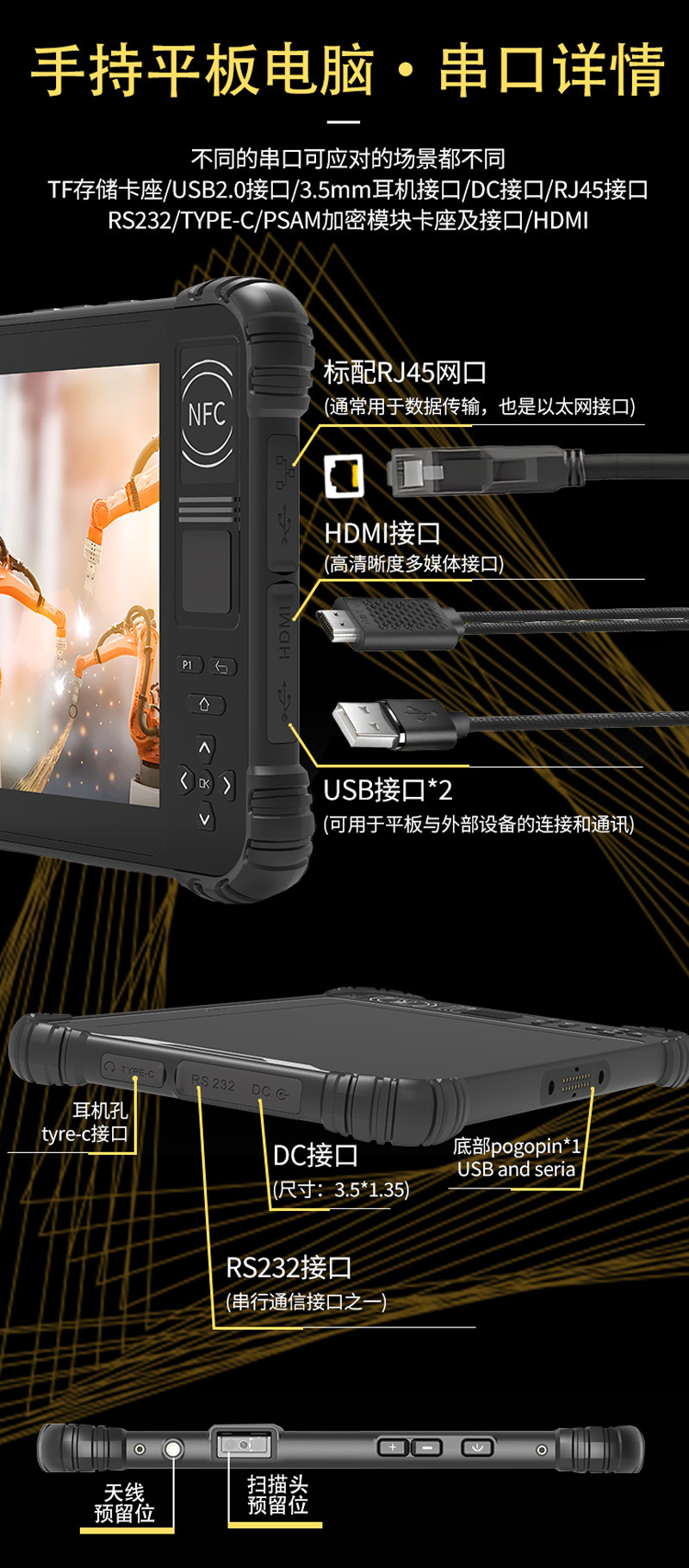 12.输入/输出接口:1*DC口,1*TYPE-C USB接口,1*内置10M/100M RJ45有线网口,2*USB2.0母口,1*RS232串口,1*耳机孔,1*SIM卡,1*TF卡,1*HDMI接口,1*背部16频POGO-PIN扩展口,1*底部8频POGO-PIN扩展口;