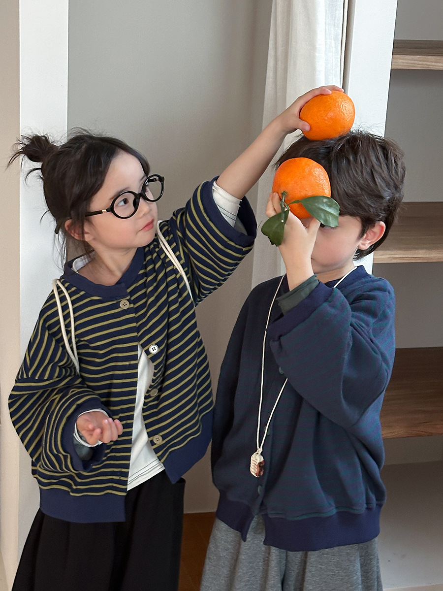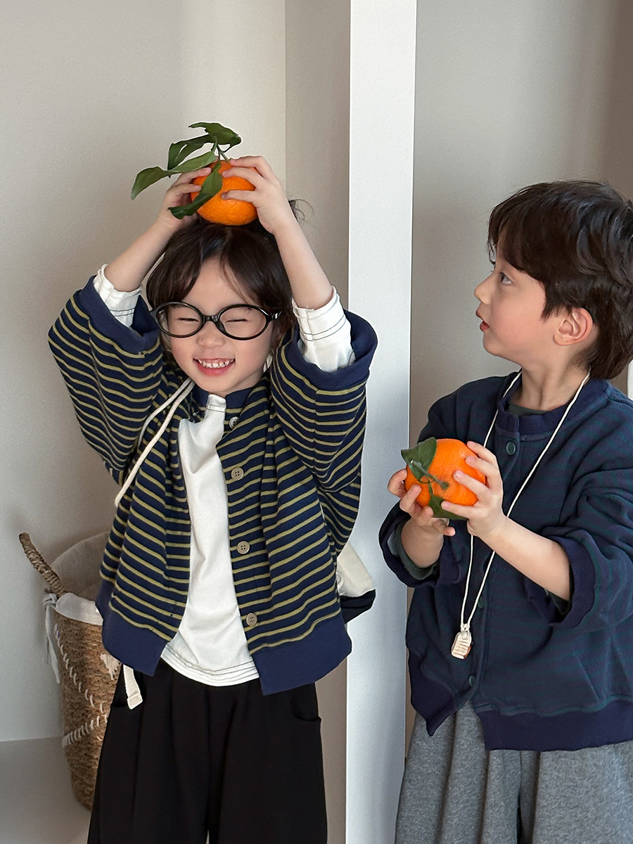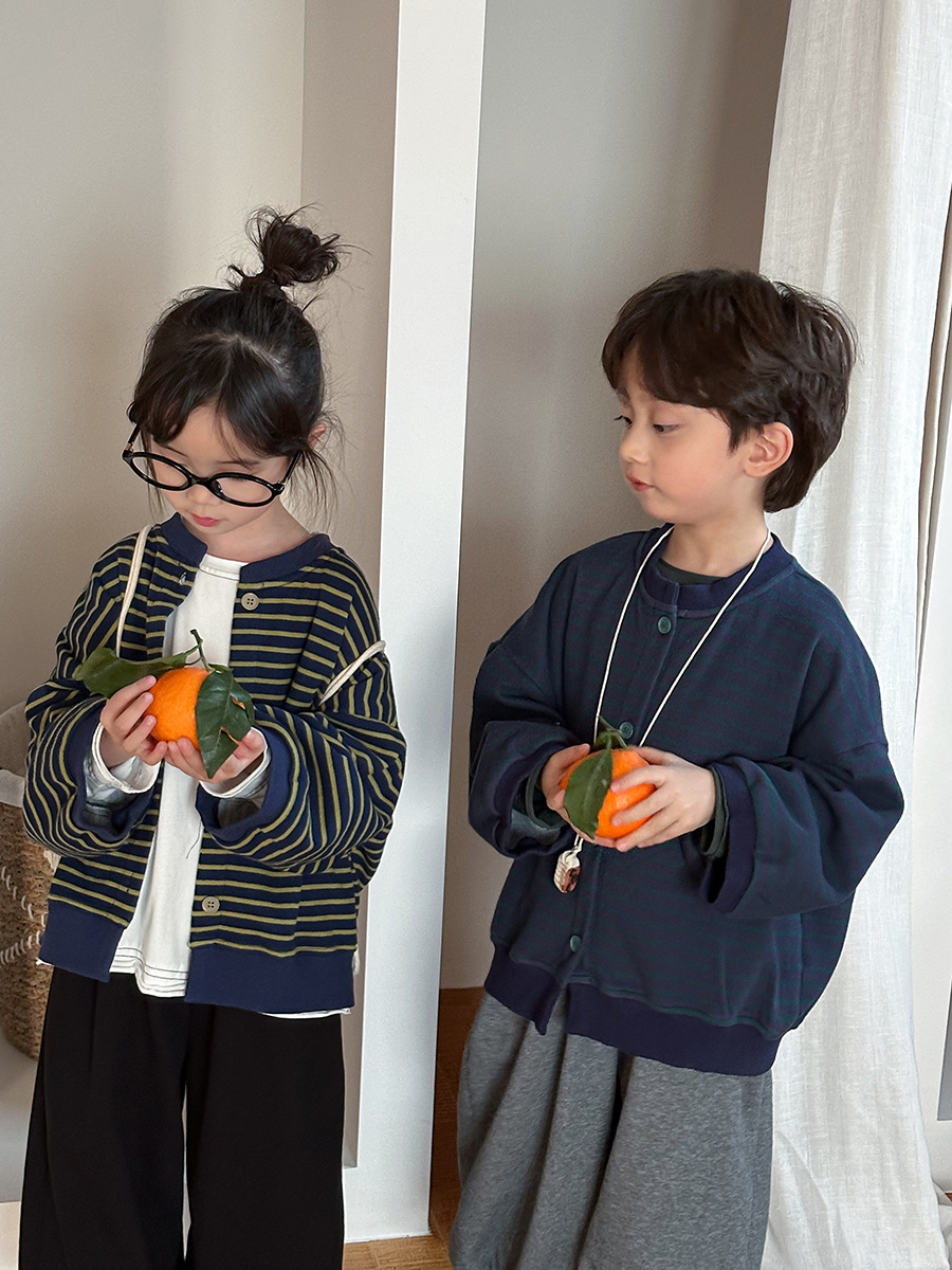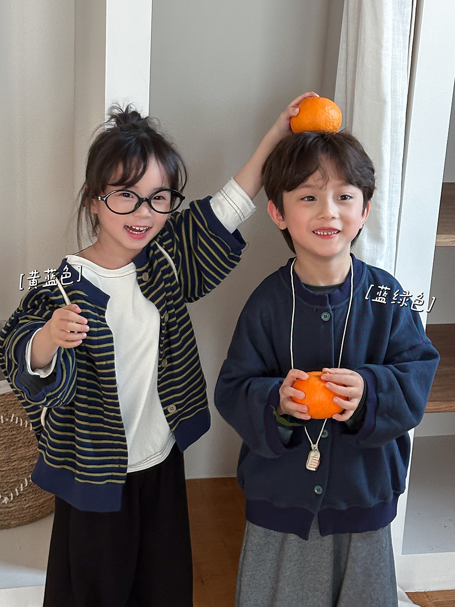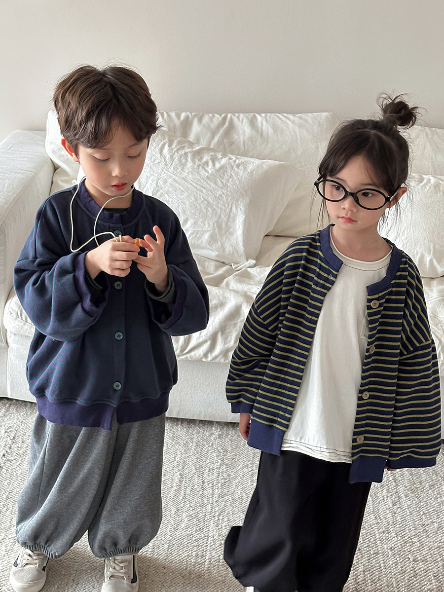 Jiaye 어린이 제품 2025 어린이 가을 새로운 줄무늬 니트 재킷 남성과 여성의 아기 유행 느슨한 재킷 카디건스토어 가기