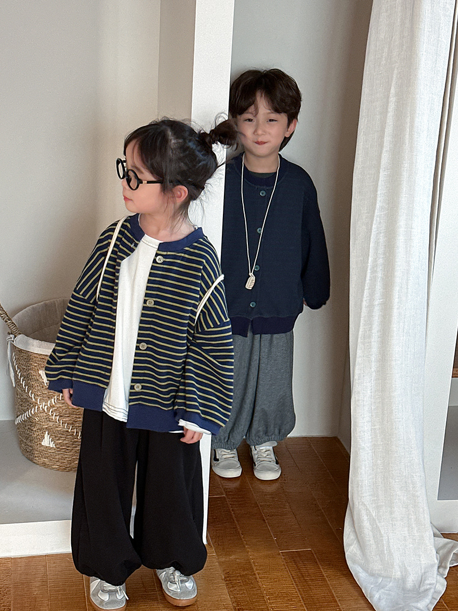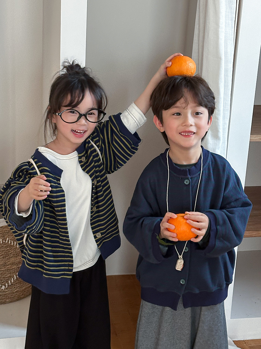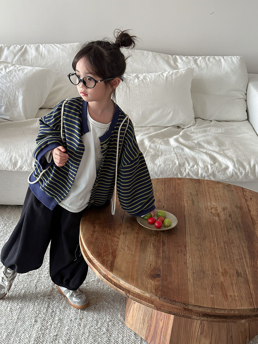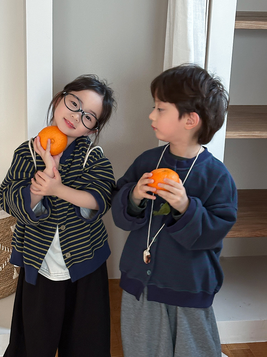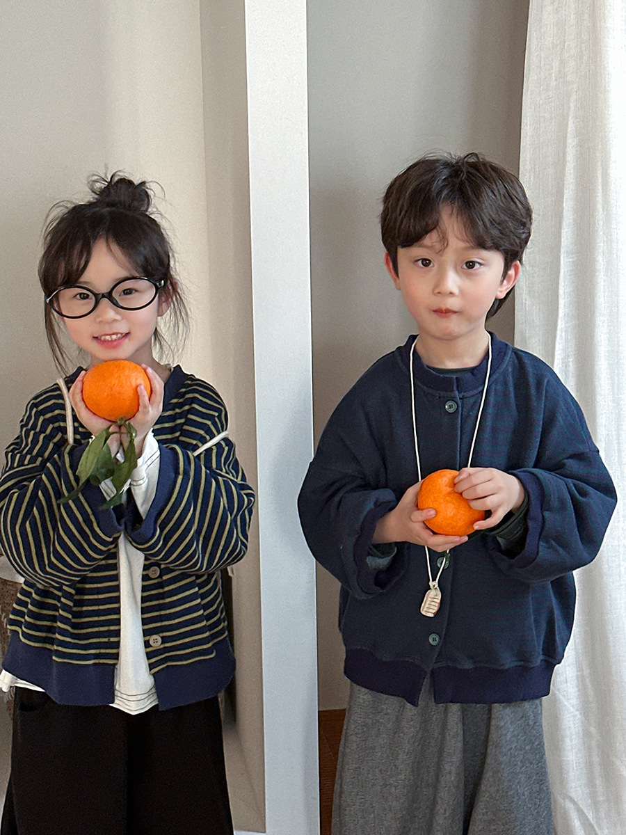 Jiaye 어린이 제품 2025 어린이 가을 새로운 줄무늬 니트 재킷 남성과 여성의 아기 유행 느슨한 재킷 카디건스토어 가기
