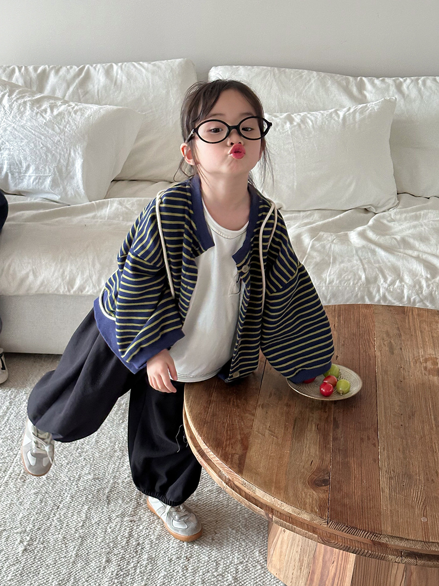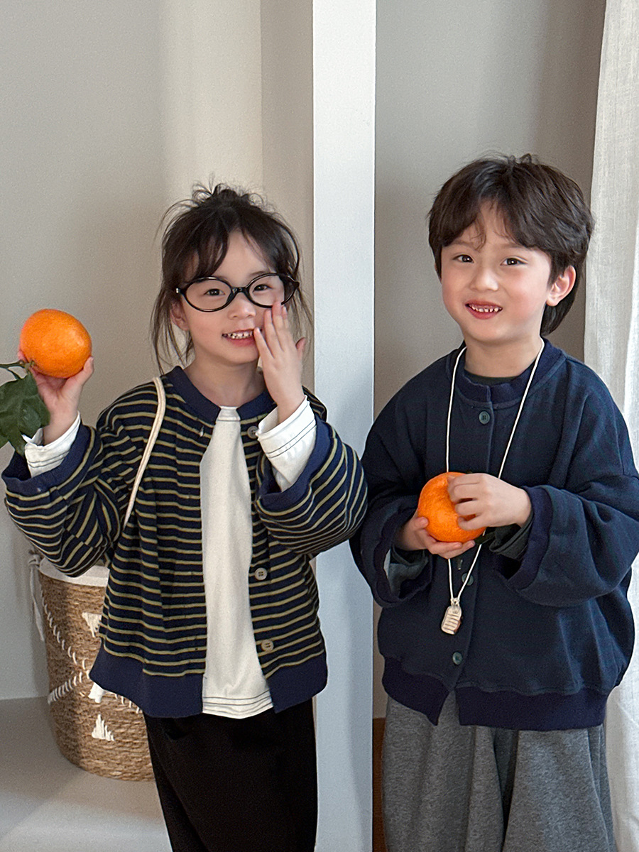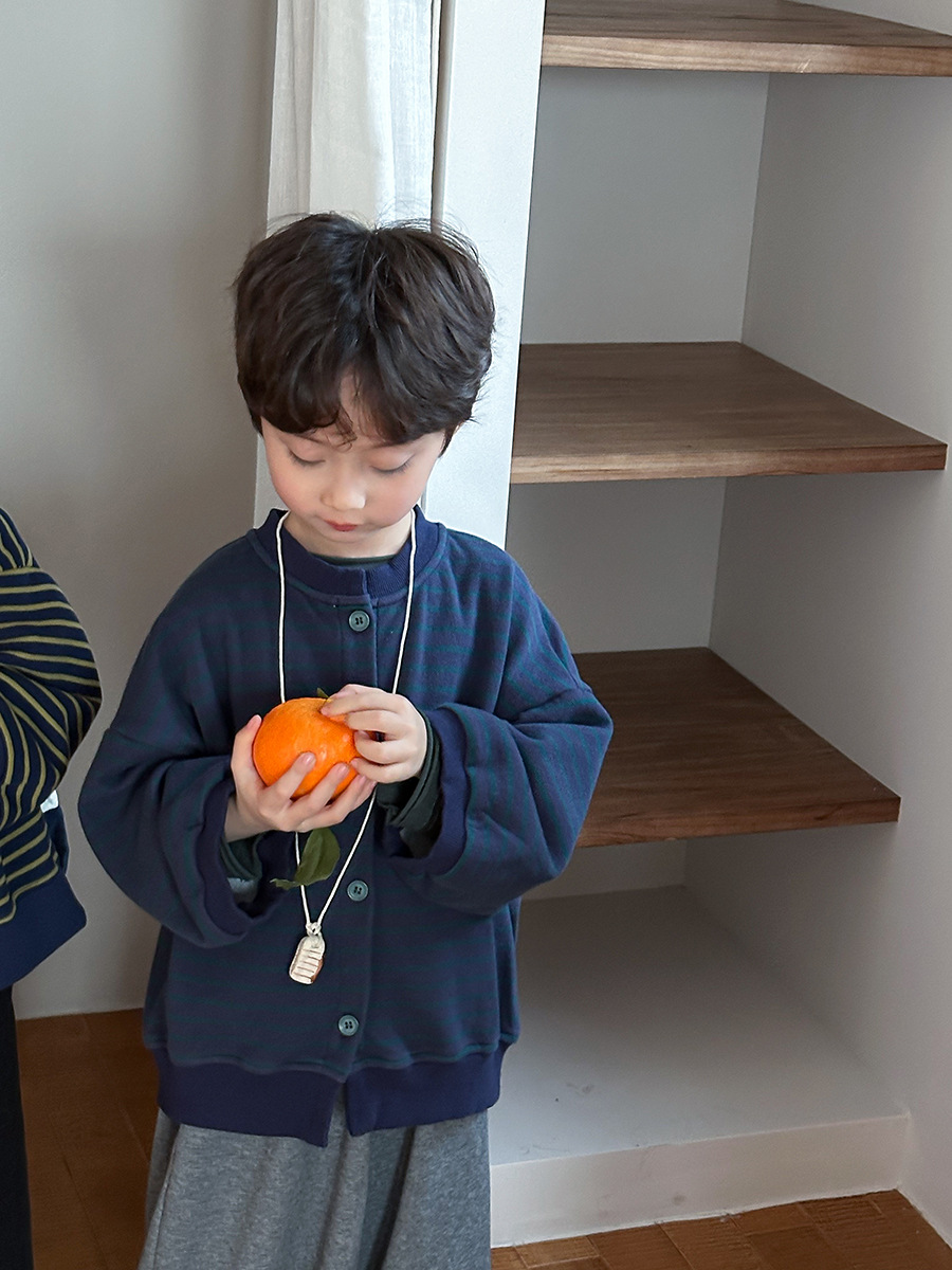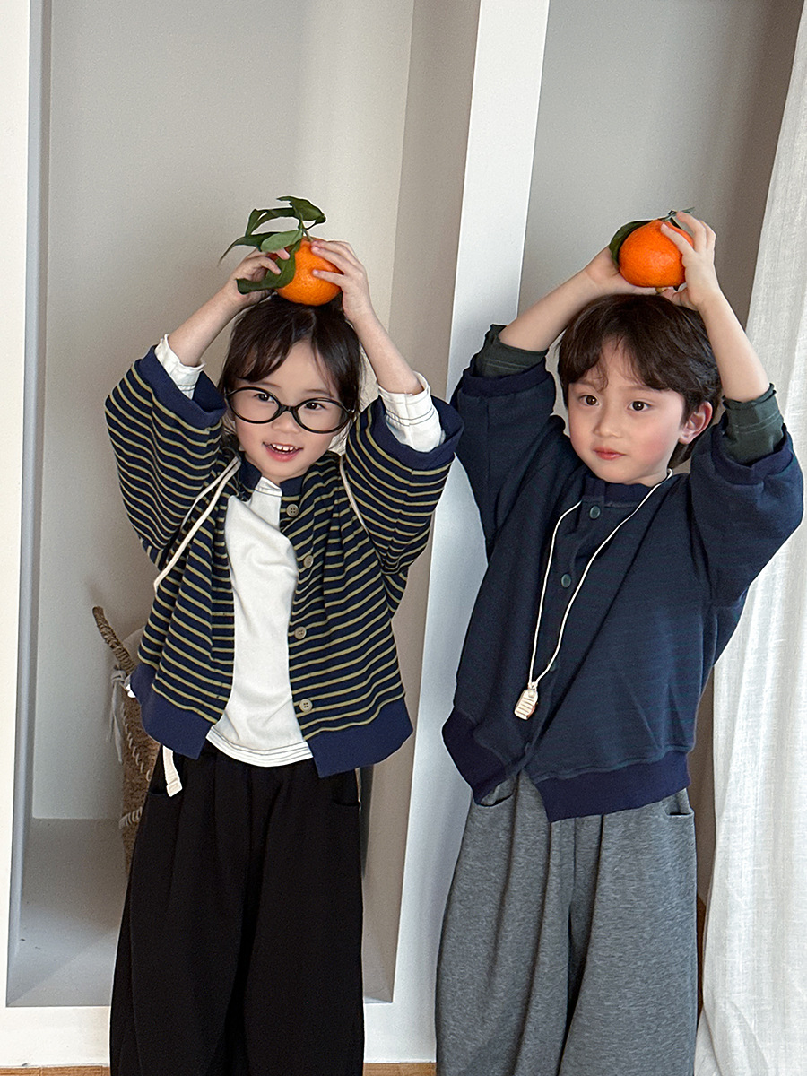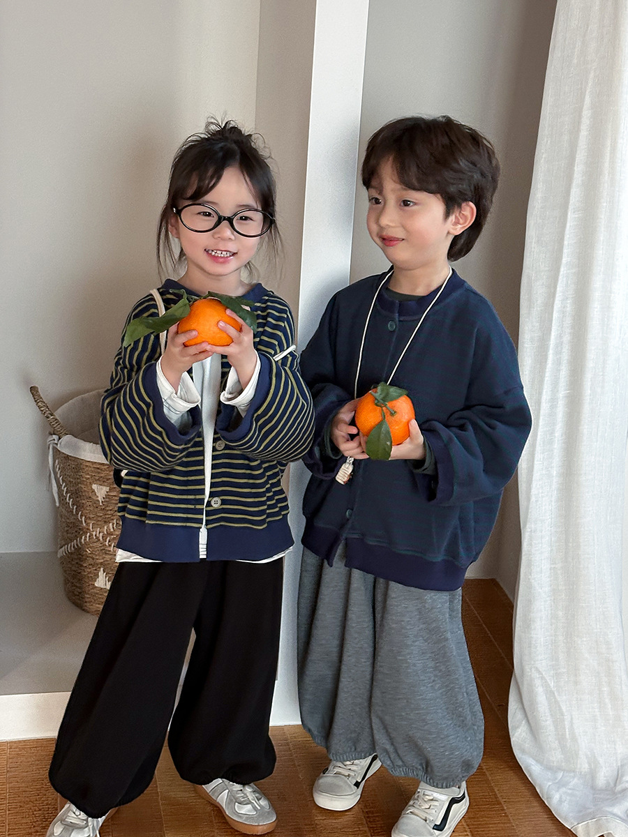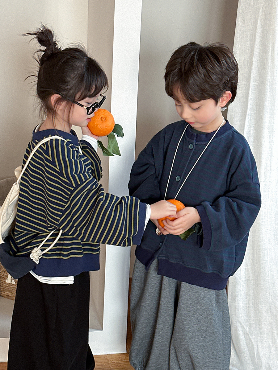 Jiaye 어린이 제품 2025 어린이 가을 새로운 줄무늬 니트 재킷 남성과 여성의 아기 유행 느슨한 재킷 카디건스토어 가기