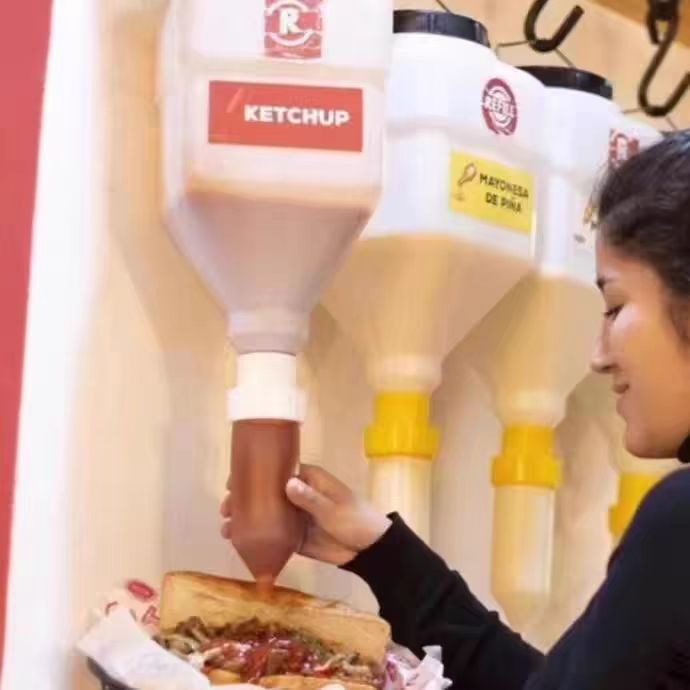 상업용 매달린 스퀴즈 소스 병 수직 소스 버킷 대용량 식품 등급 토마토 샐러드 소스 스퀴즈 병 소스 펌프