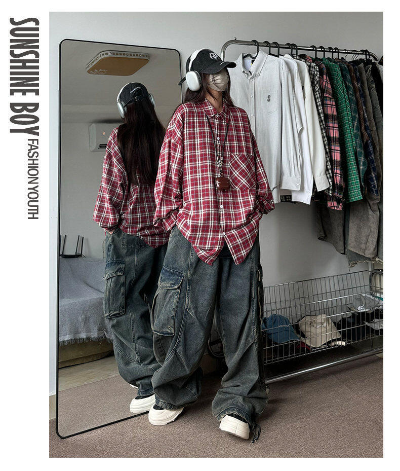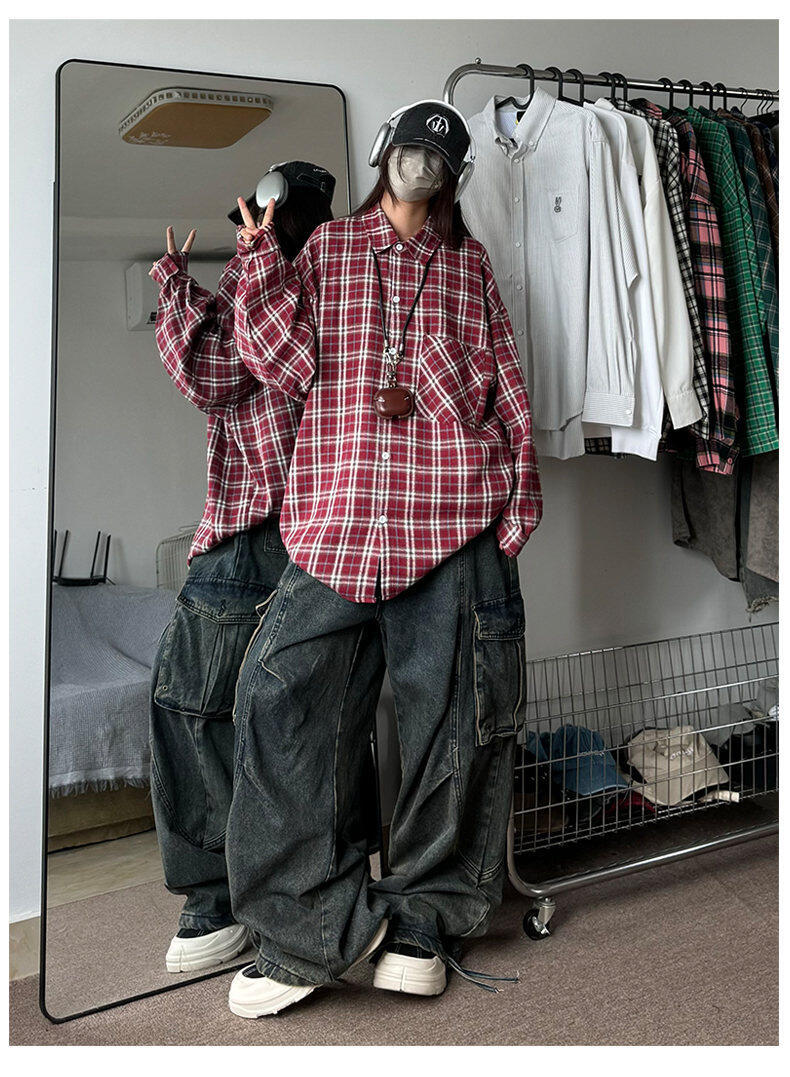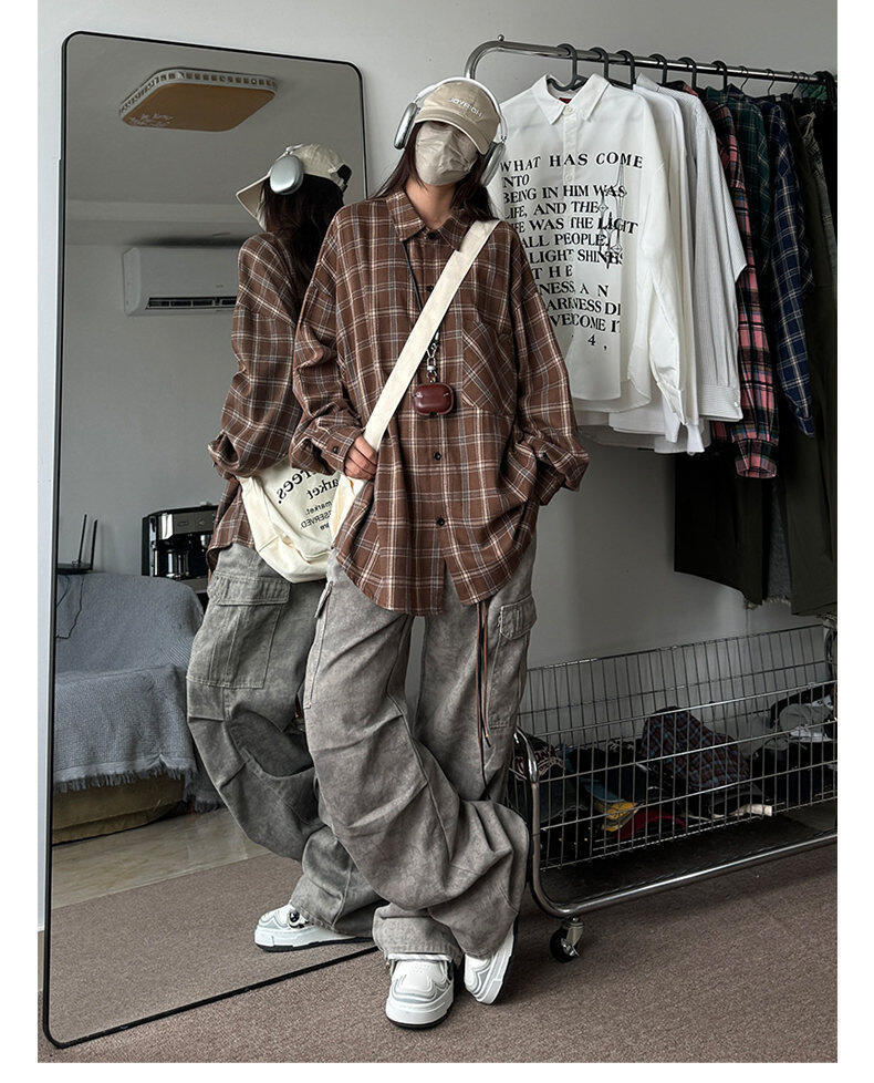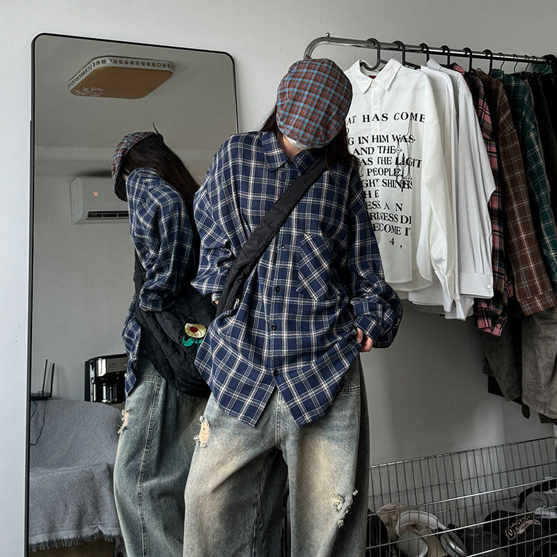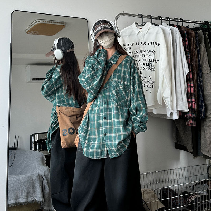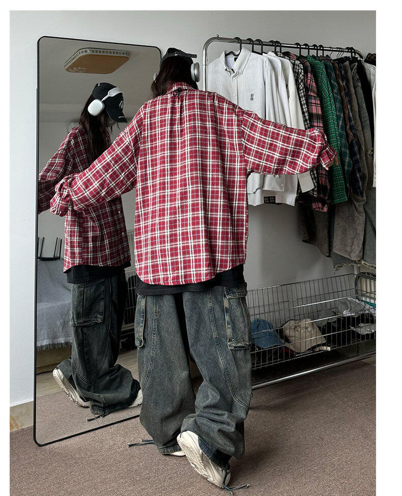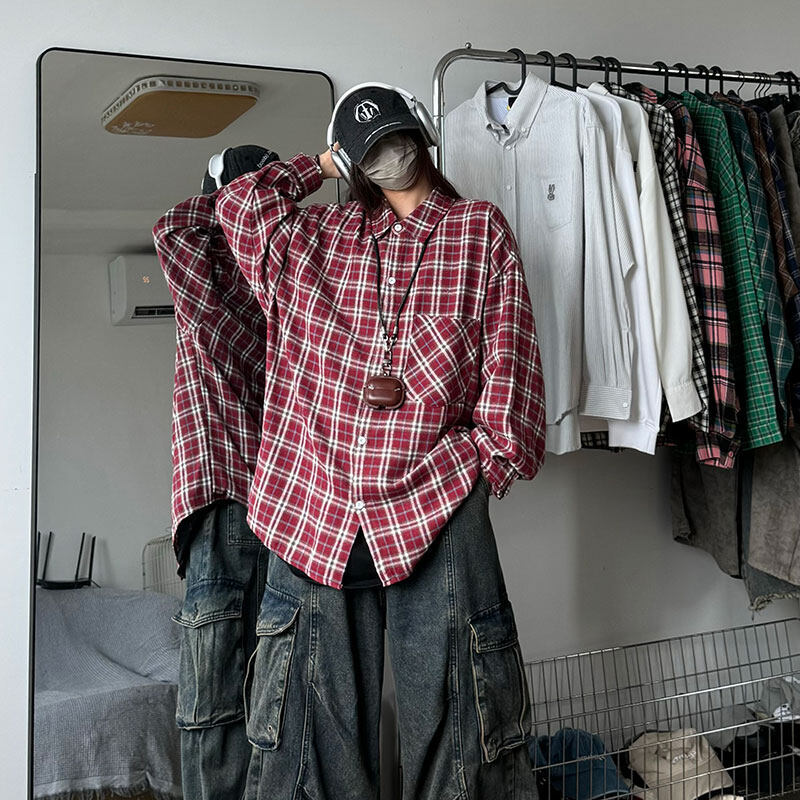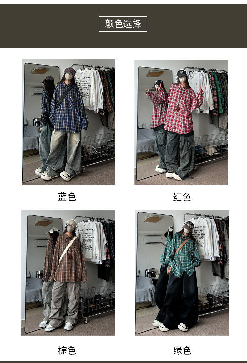 남성용 셔츠 봄 신상 홍콩 스타일 루즈핏 기모 대형 체크 셔츠 학생용 심플 캐주얼 긴팔 자켓스토어 가기
