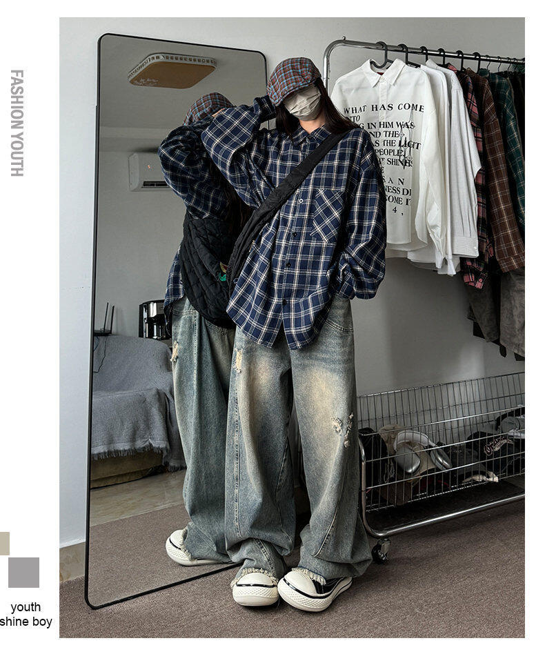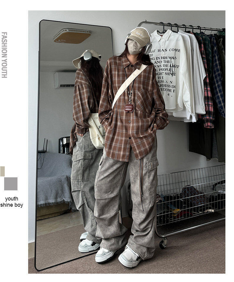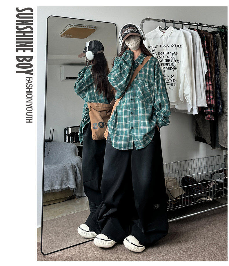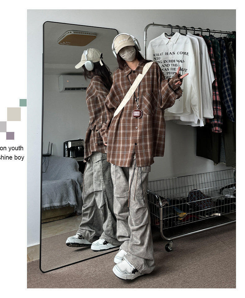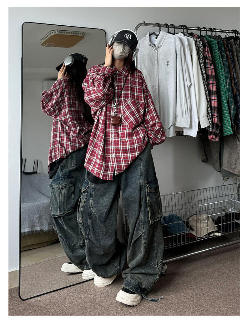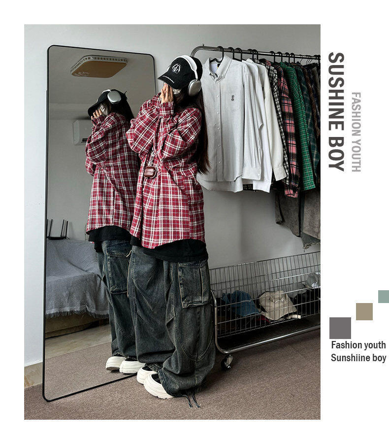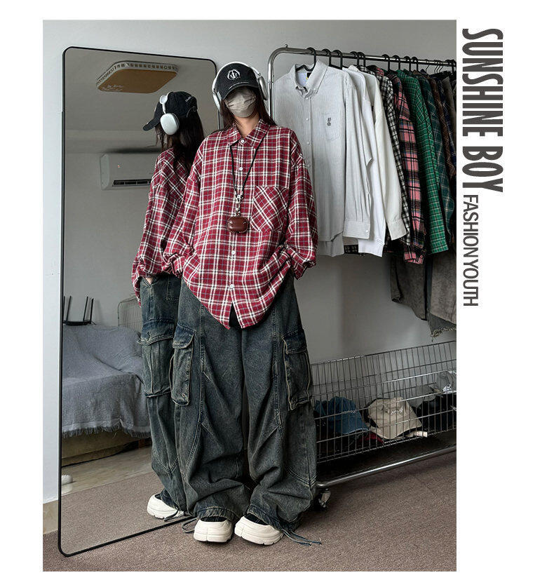 남성용 셔츠 봄 신상 홍콩 스타일 루즈핏 기모 대형 체크 셔츠 학생용 심플 캐주얼 긴팔 자켓스토어 가기
