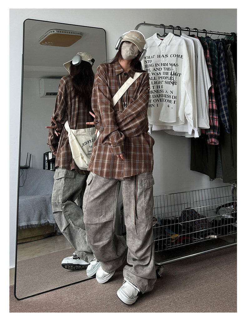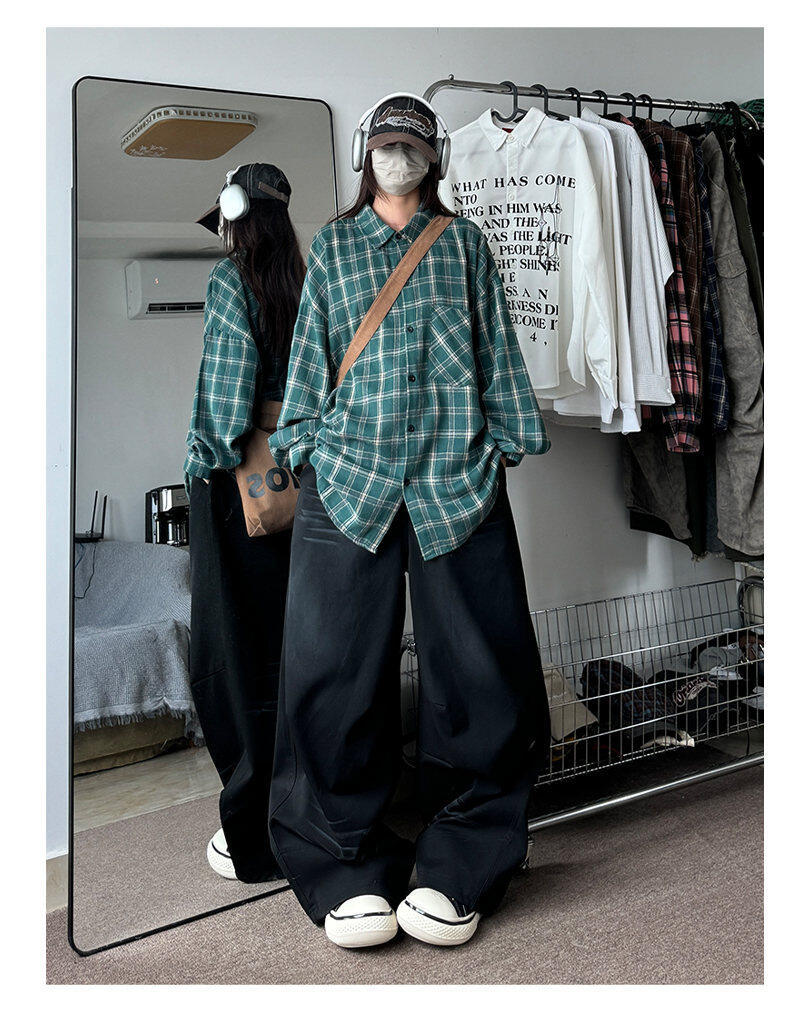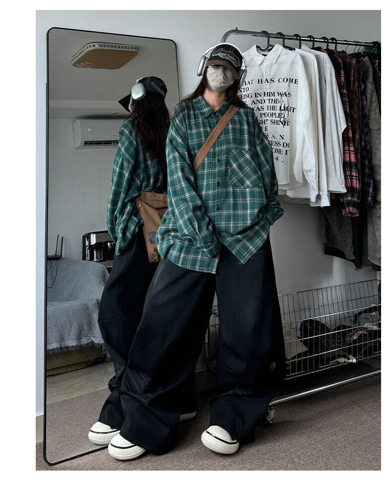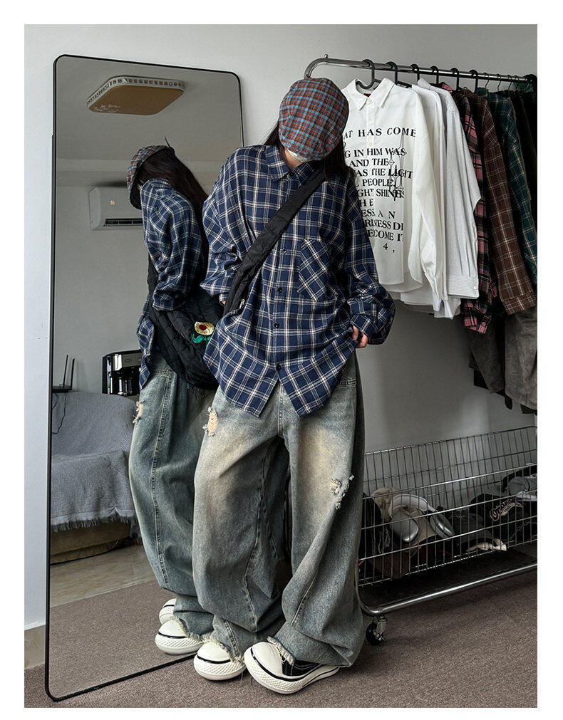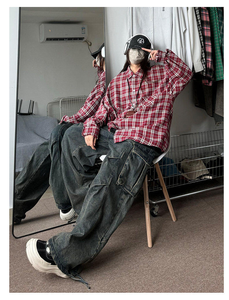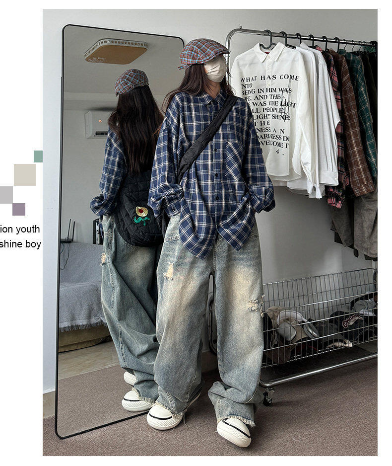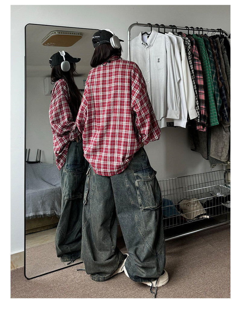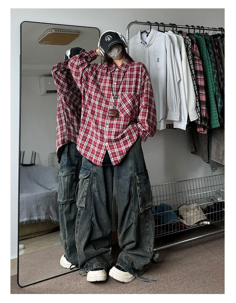 남성용 셔츠 봄 신상 홍콩 스타일 루즈핏 기모 대형 체크 셔츠 학생용 심플 캐주얼 긴팔 자켓스토어 가기