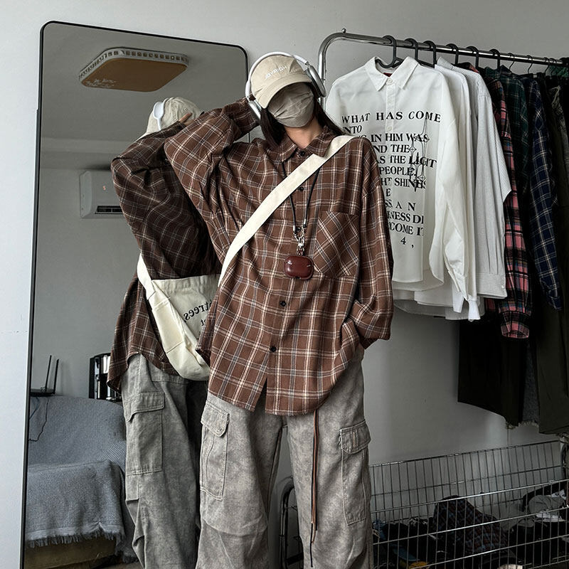 남성용 셔츠 봄 신상 홍콩 스타일 루즈핏 기모 대형 체크 셔츠 학생용 심플 캐주얼 긴팔 자켓