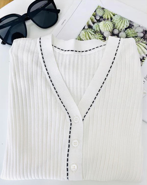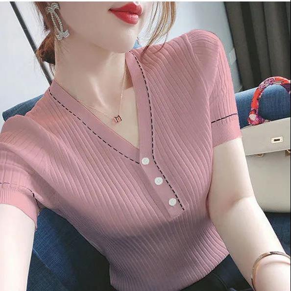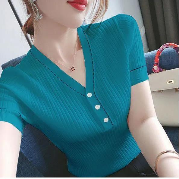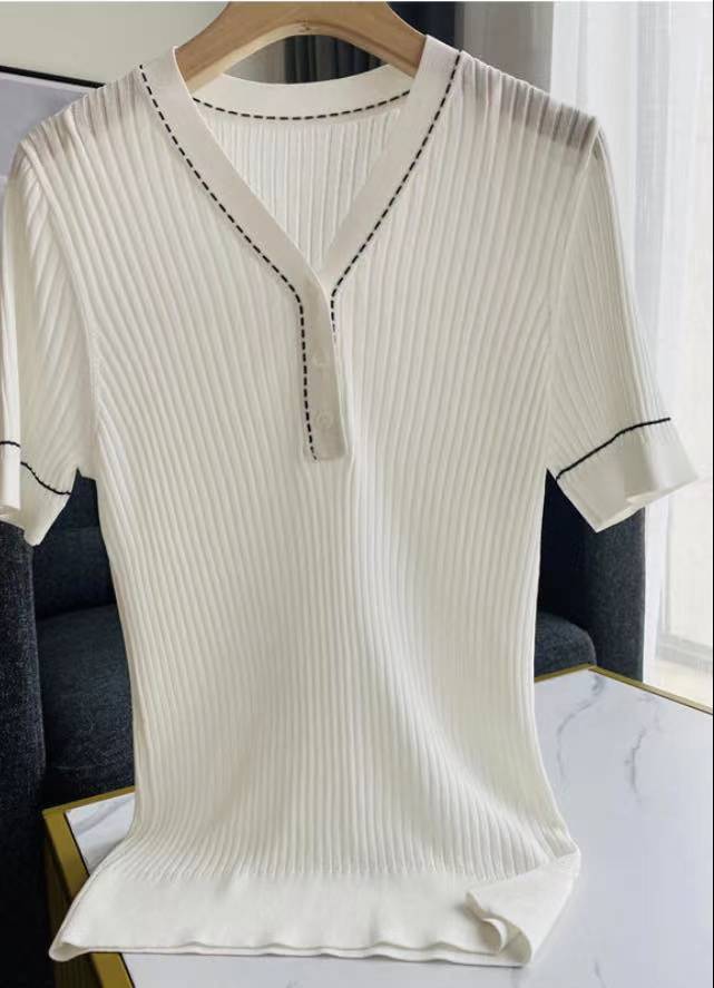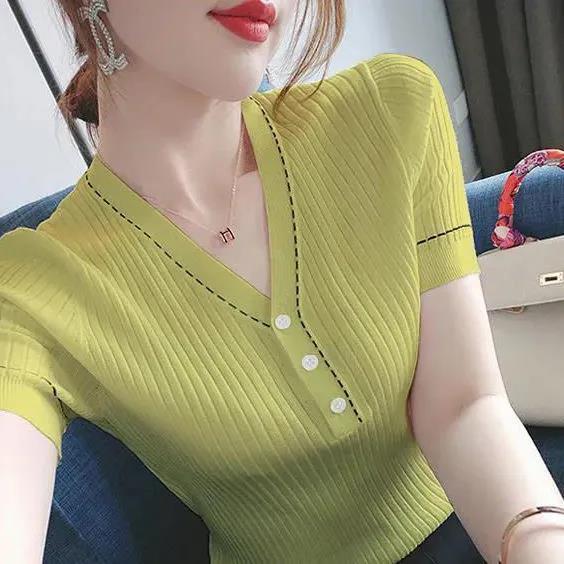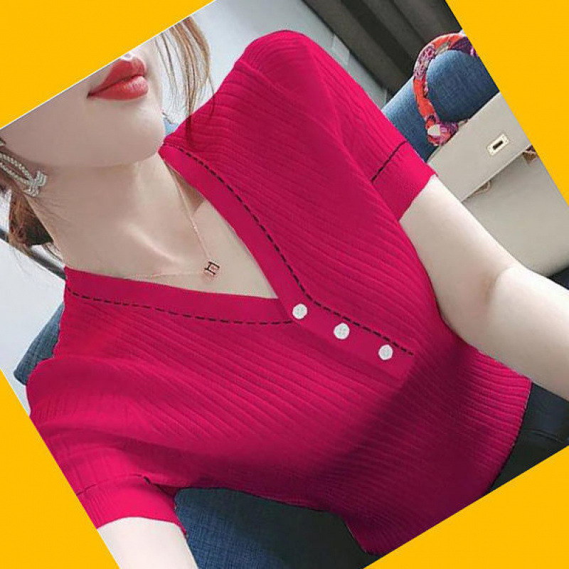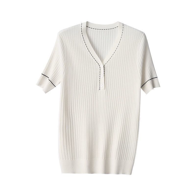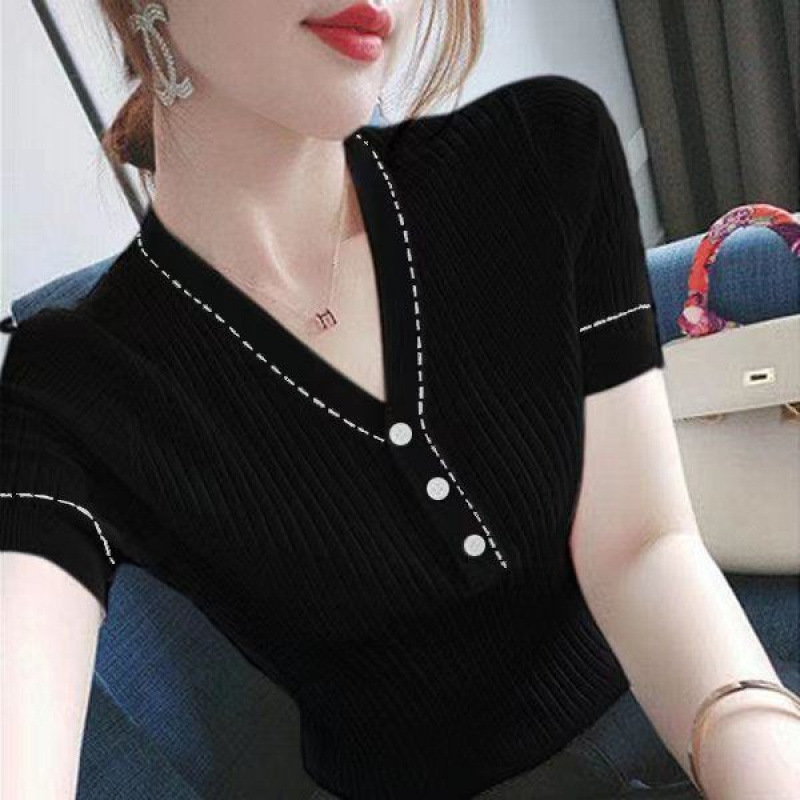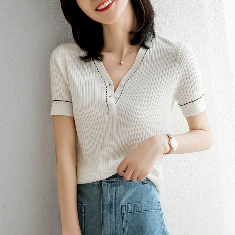 브이넥 반소매 아이스실크 티셔츠 여자 여름 새 한국식 올매치 슬림-핏 슬리밍 버튼 스티칭 니트웨어 탑