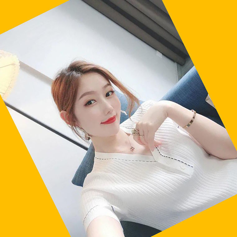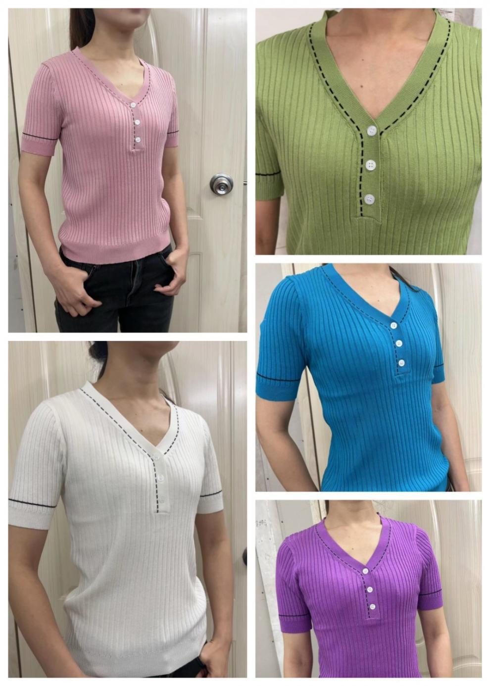 브이넥 반소매 아이스실크 티셔츠 여자 여름 새 한국식 올매치 슬림-핏 슬리밍 버튼 스티칭 니트웨어 탑스토어 가기