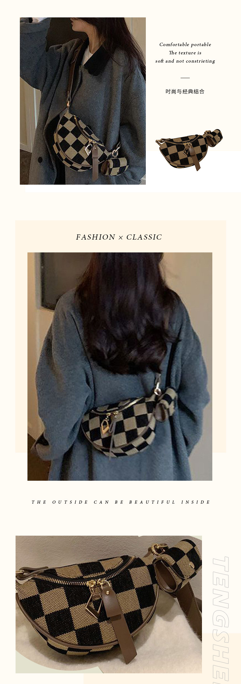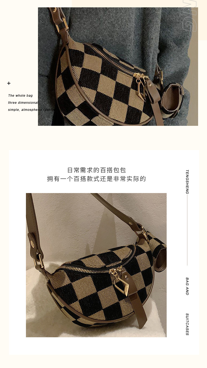 바둑판 가슴 가방 여성의 2025 봄 새로운 패션 대비 컬러 체크 무늬 허리 가방 우아한 통근 싱글 어깨 크로스 바디 백