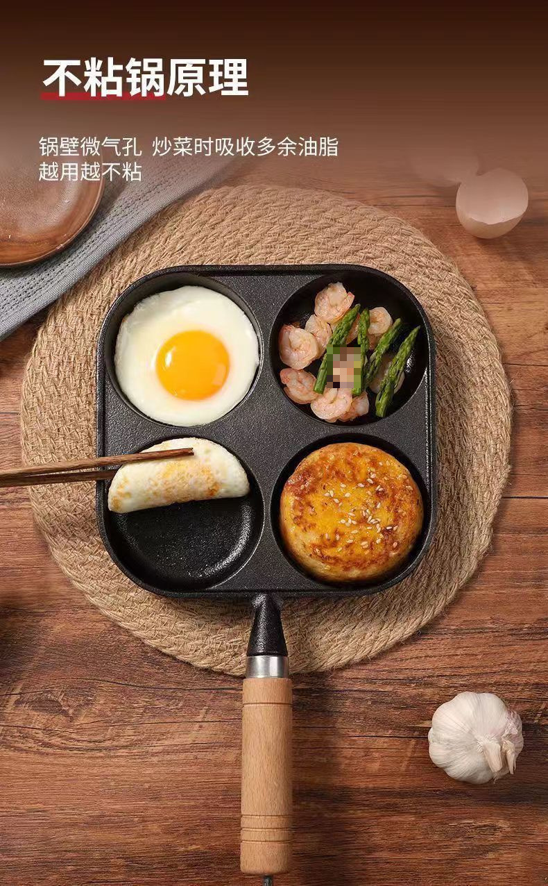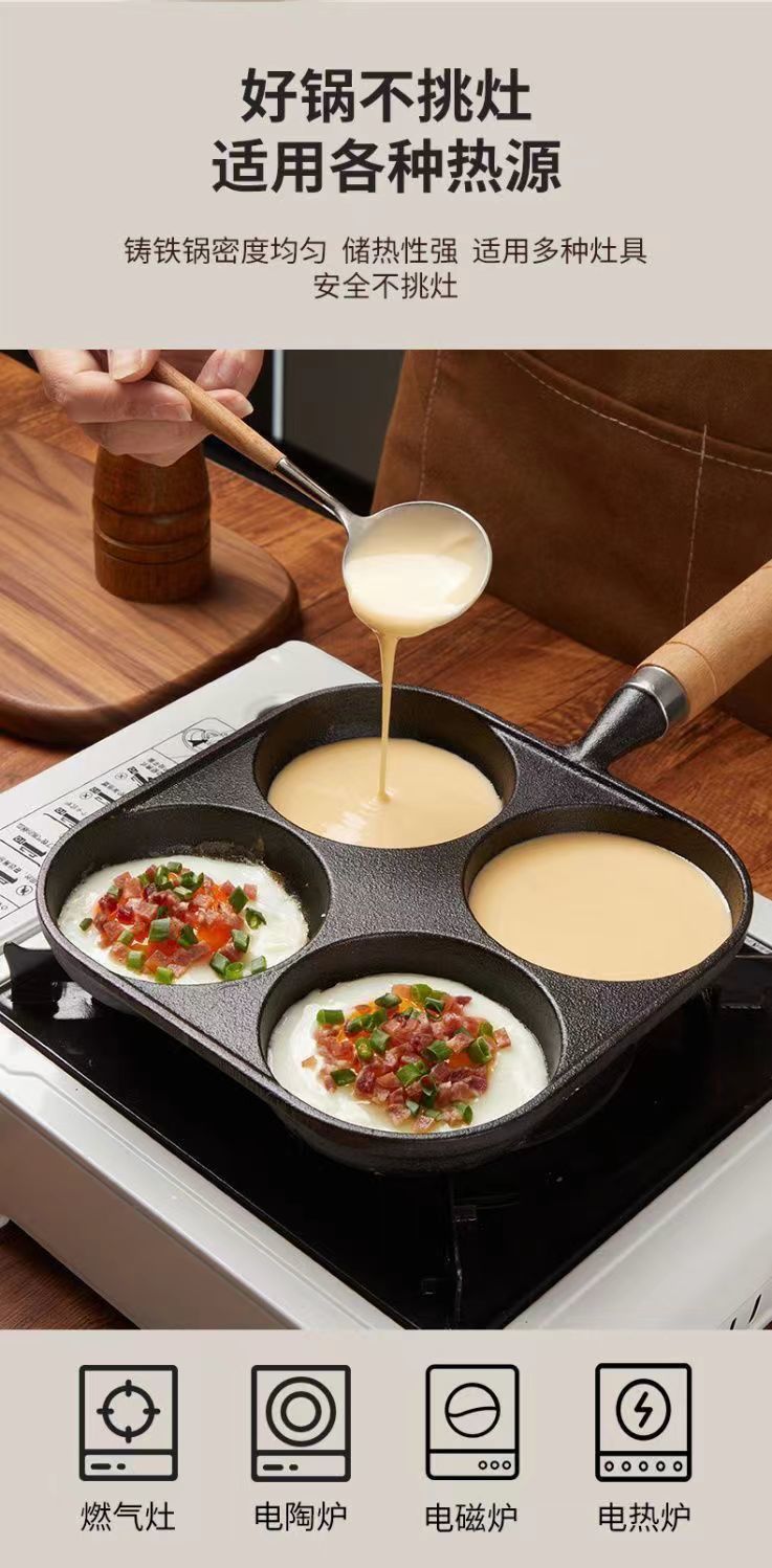 주철 4 홀 튀긴 계란 팬 계란 햄버거 팬 코팅되지 않은 계란 인공물 계란 만두 팬 비 스틱 팬 프라이팬