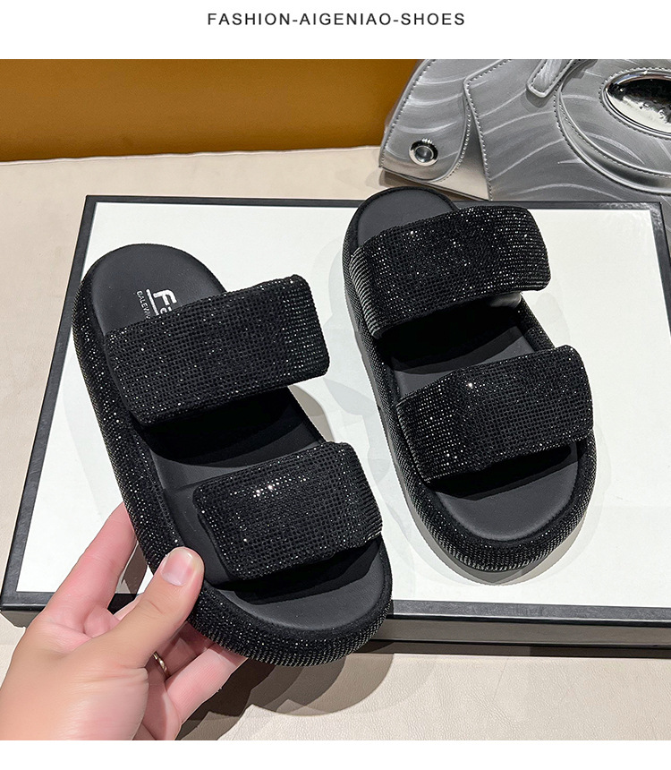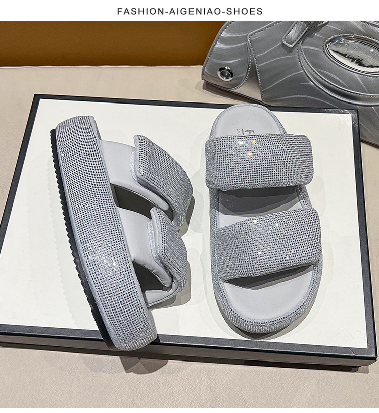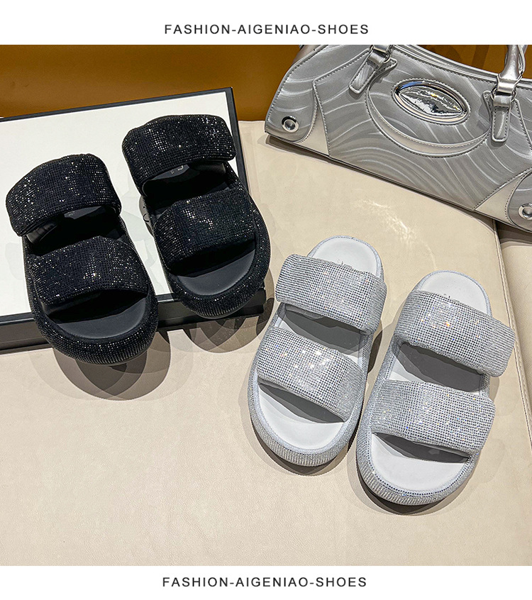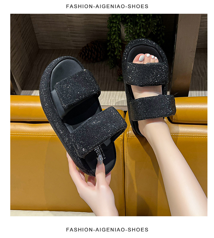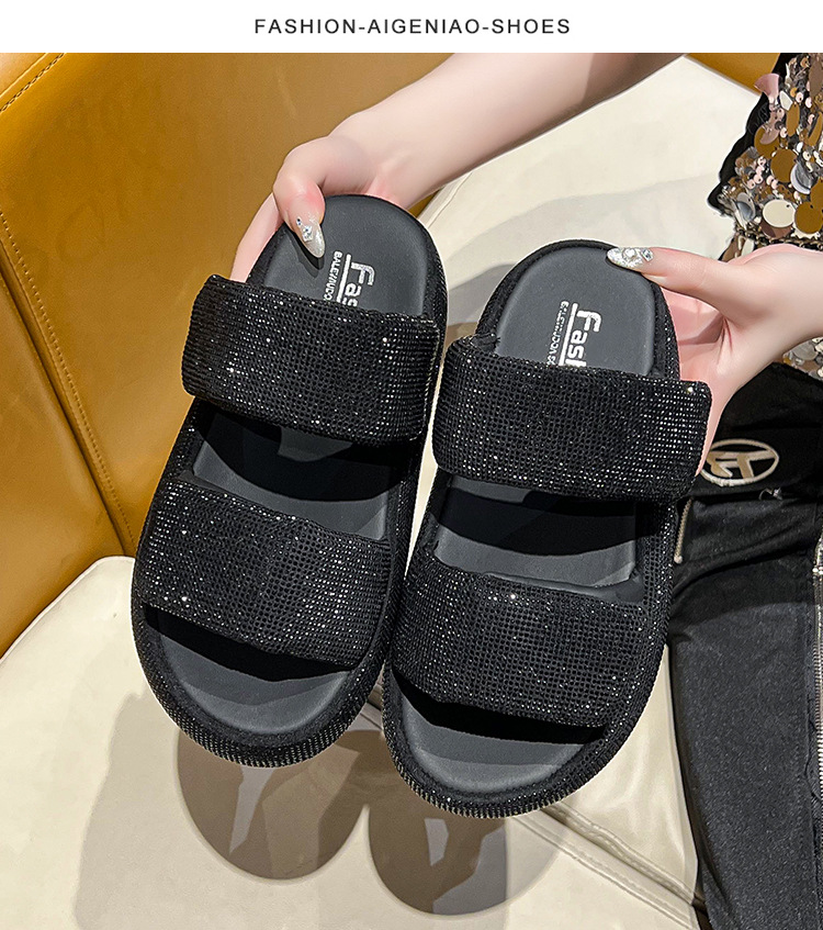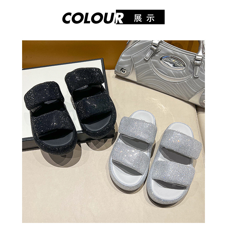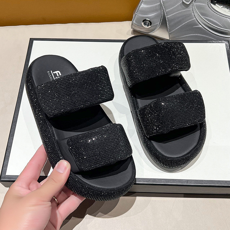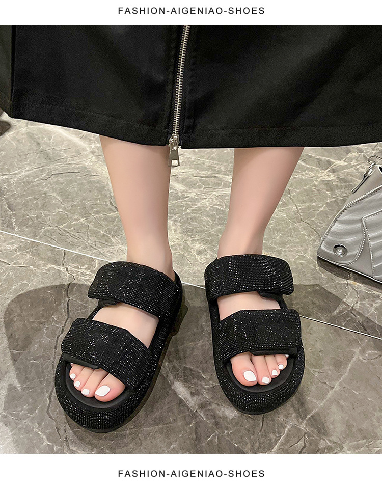 2025 년 여름 새로운 라인 스톤 한 단어 벨크로 두꺼운 바닥 올 매치 고급 오픈 토 비치 샌들 아우터웨어 슬리퍼