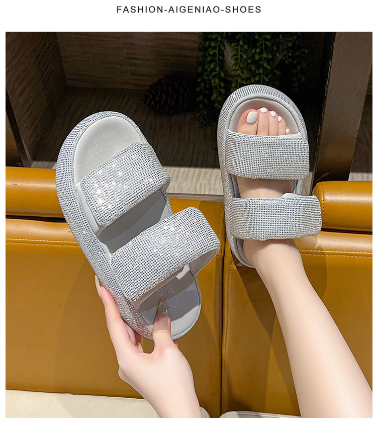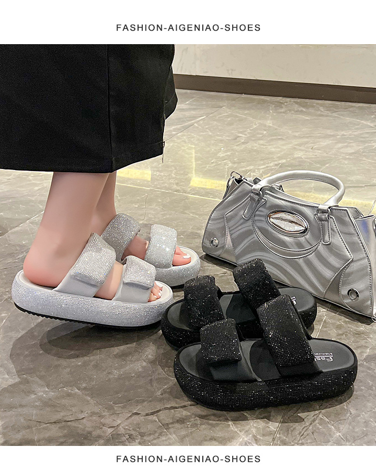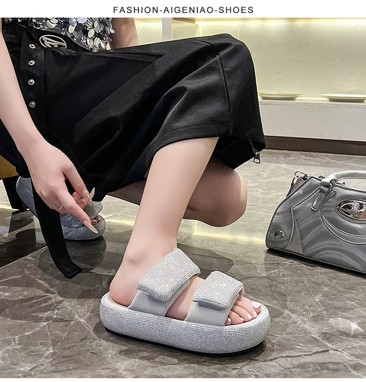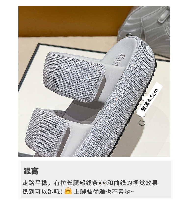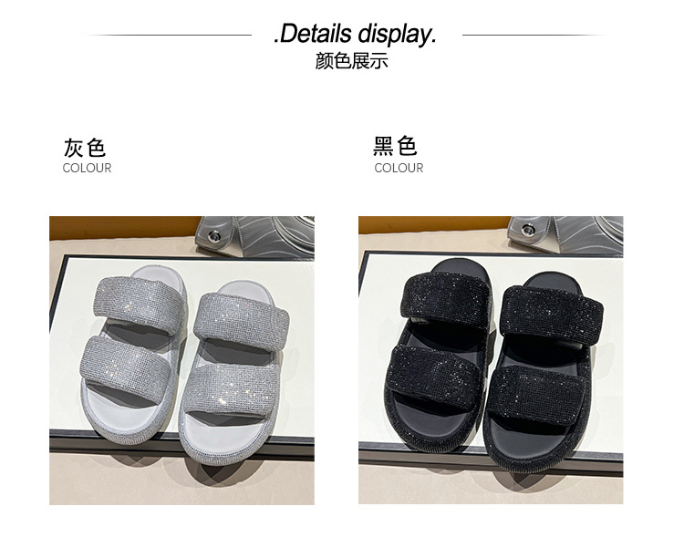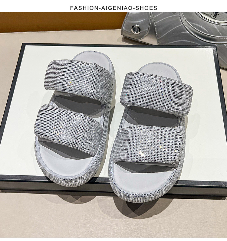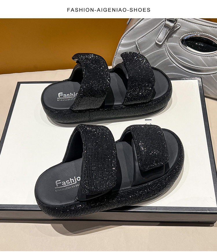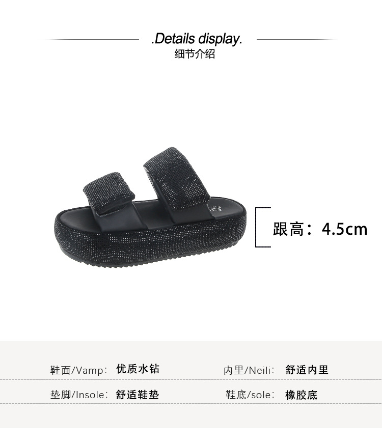 2025 년 여름 새로운 라인 스톤 한 단어 벨크로 두꺼운 바닥 올 매치 고급 오픈 토 비치 샌들 아우터웨어 슬리퍼