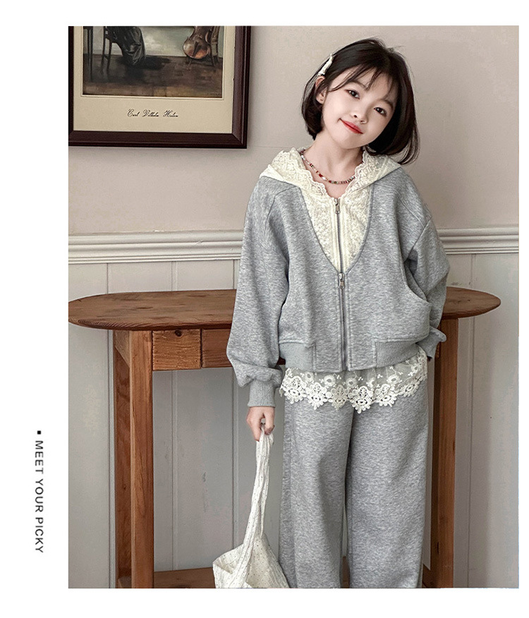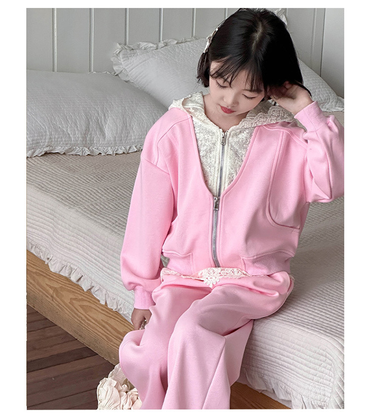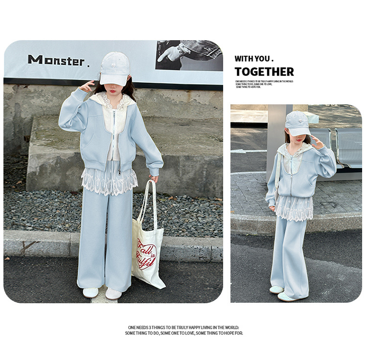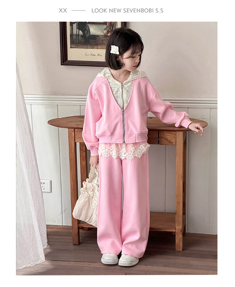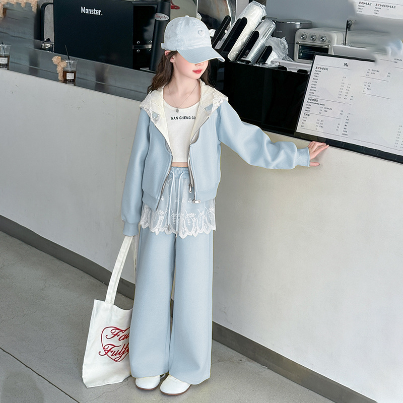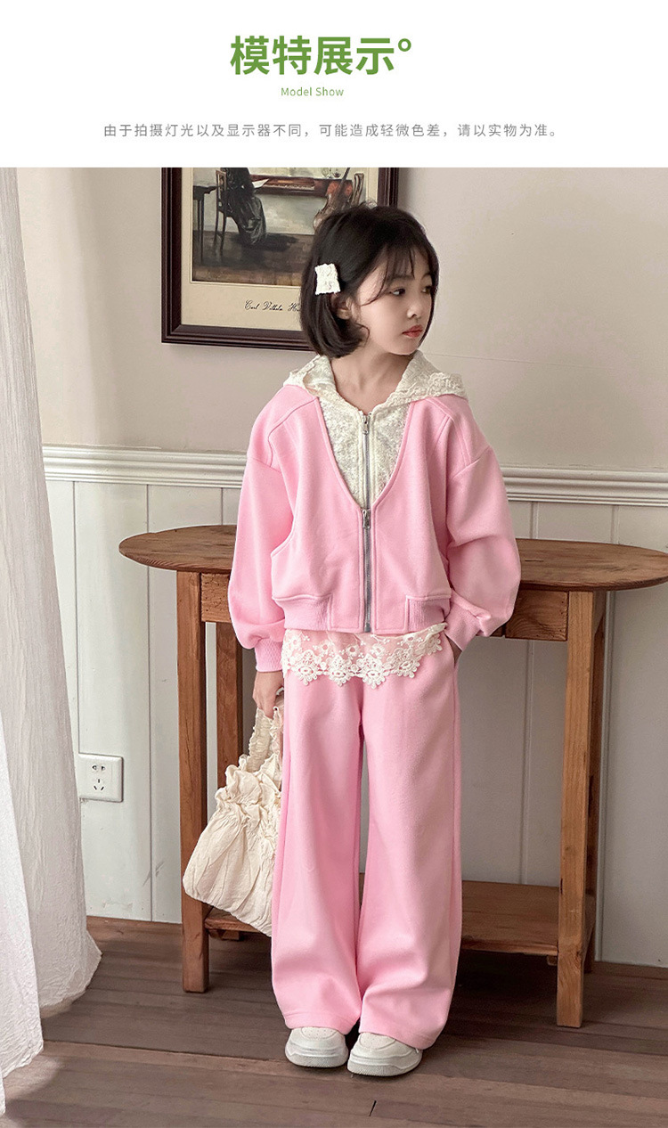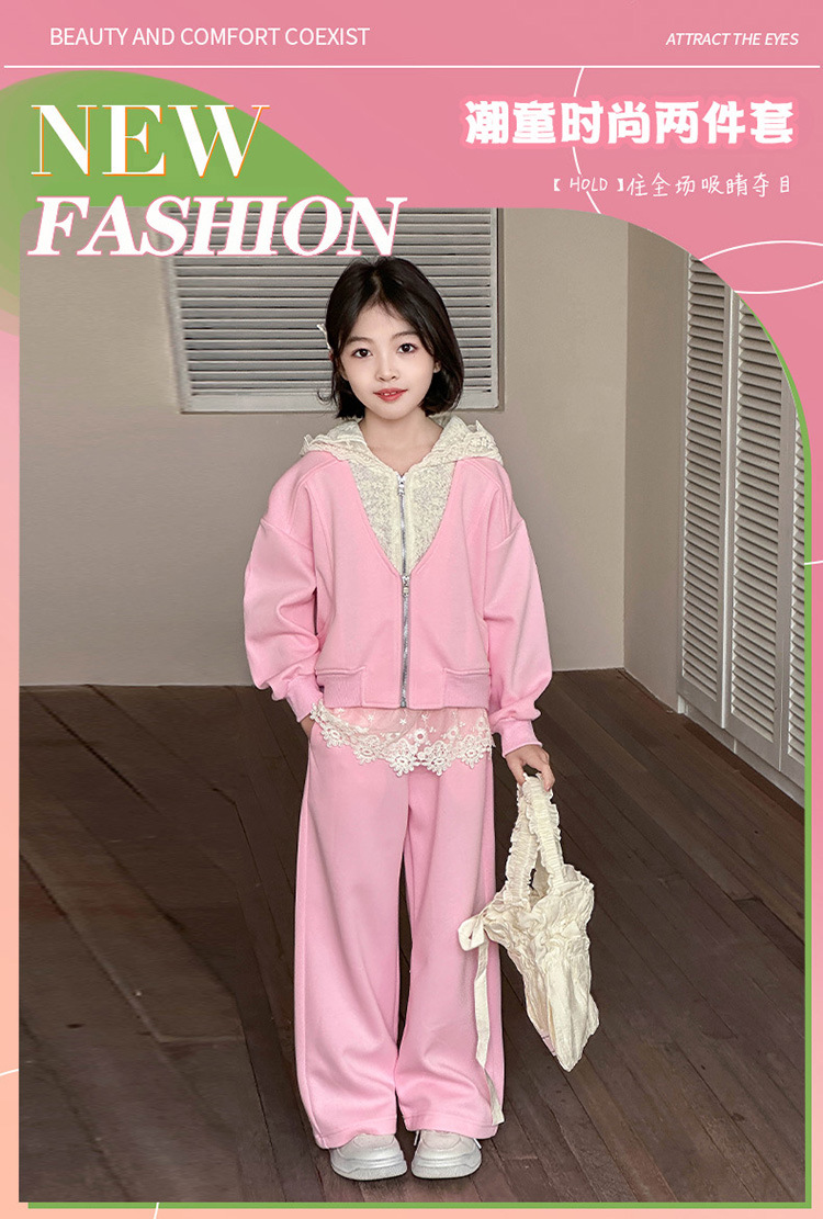 소녀 레이스 스티칭 세트 2025 봄 새로운 어린이 인터넷 인기 유행 레이스 캡 캐주얼 바지 투피스 세트스토어 가기