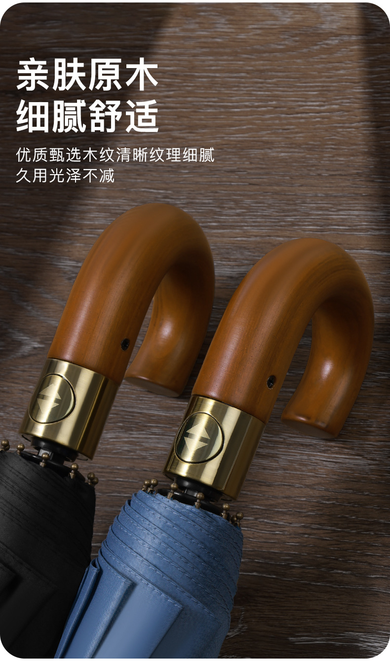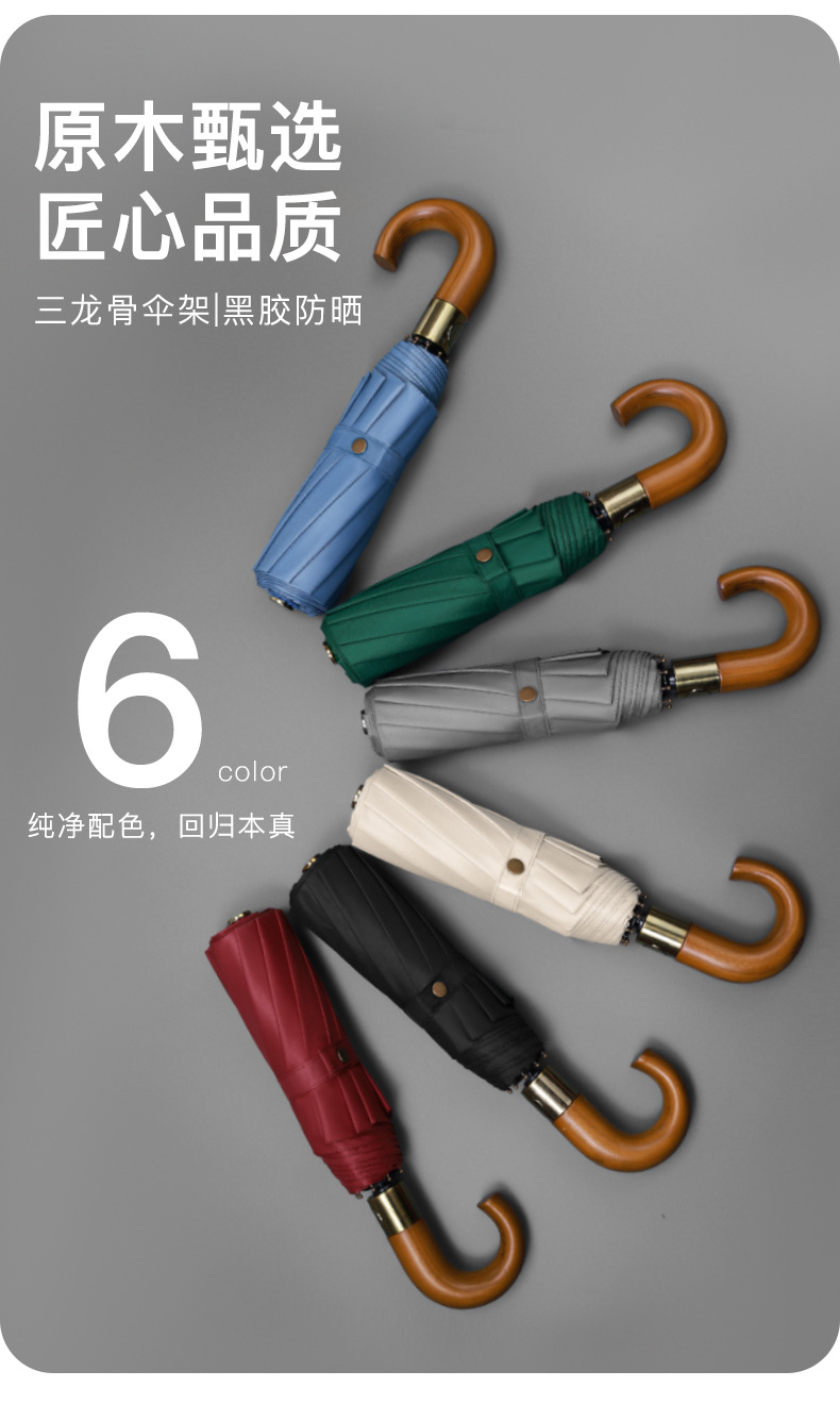 자동 후크 나무 손잡이 우산 사업 남자의 우산 자외선 방지 및 비 방지 이중 목적 접히는 우산 솔리드 우드 3 배 우산