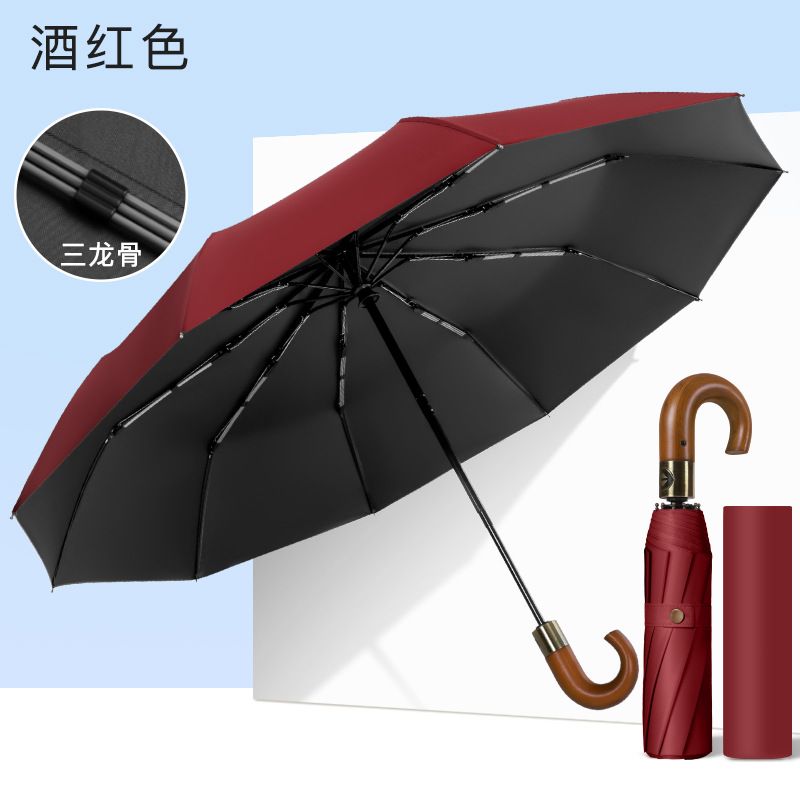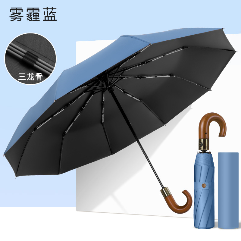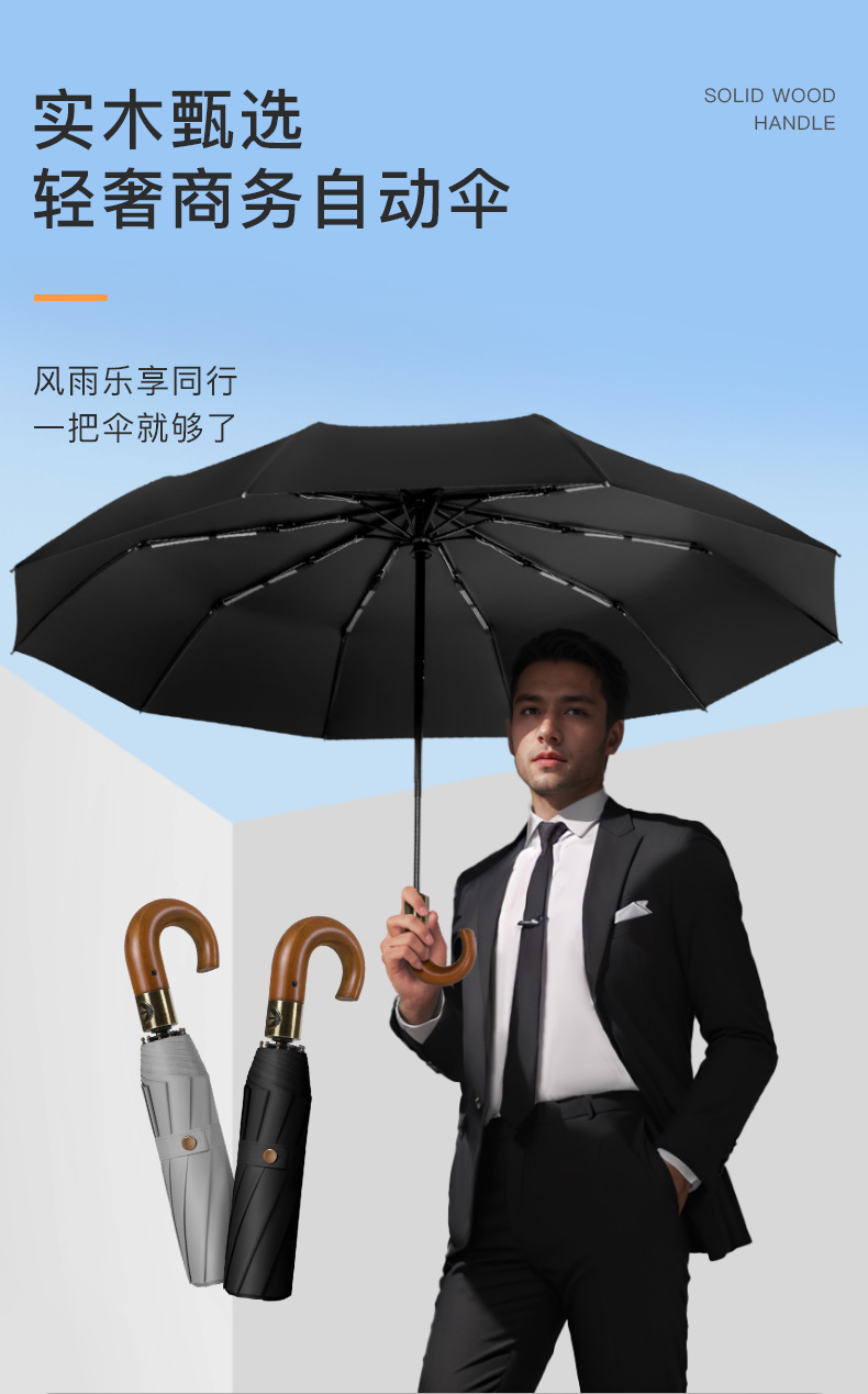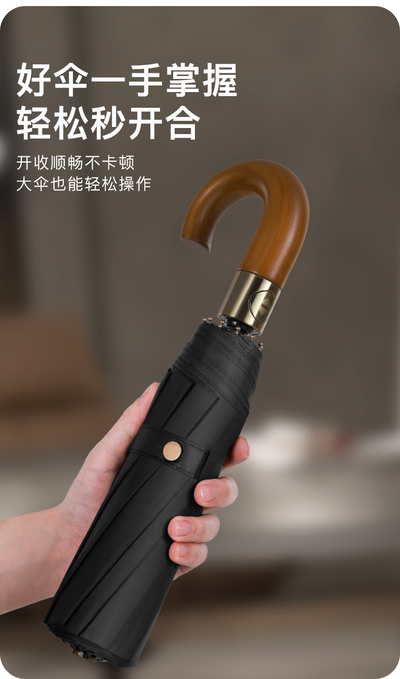 자동 후크 나무 손잡이 우산 사업 남자의 우산 자외선 방지 및 비 방지 이중 목적 접히는 우산 솔리드 우드 3 배 우산스토어 가기