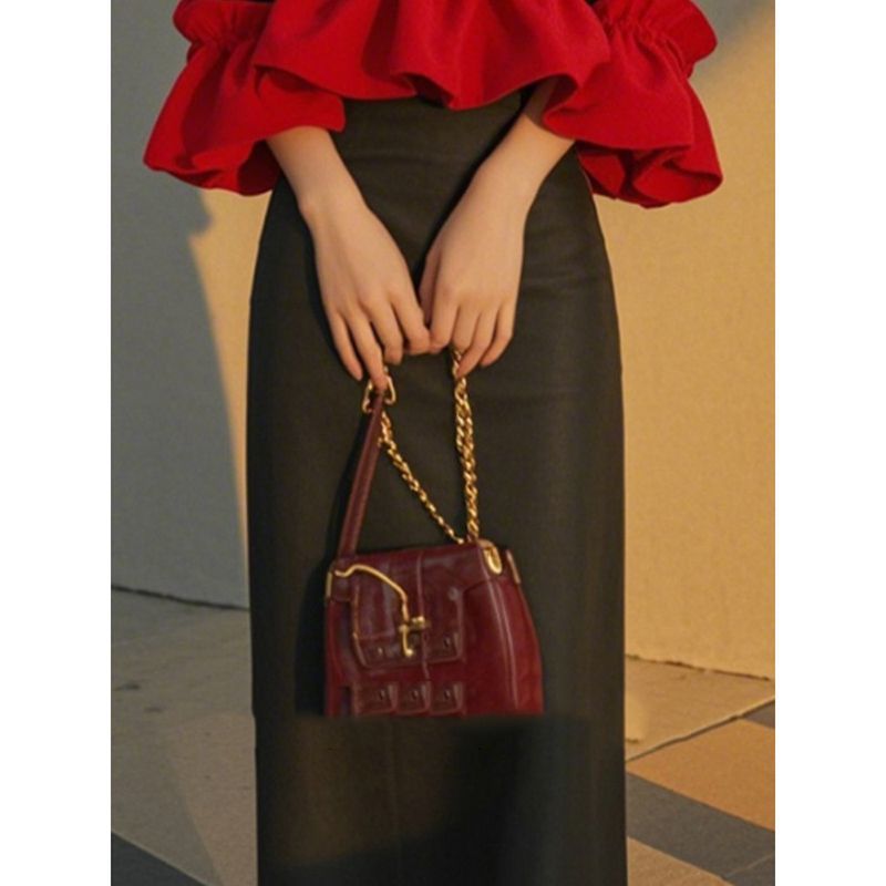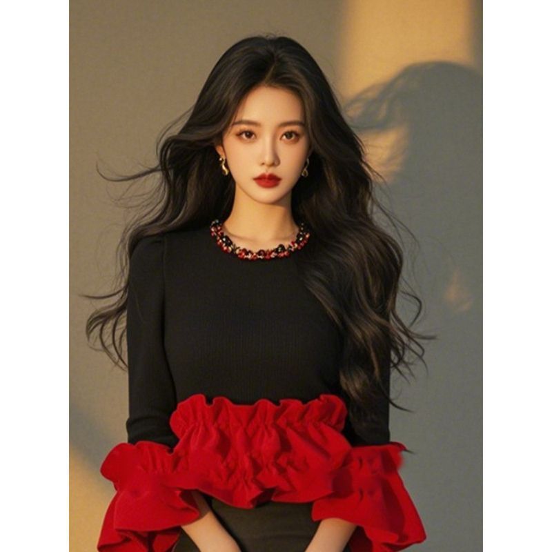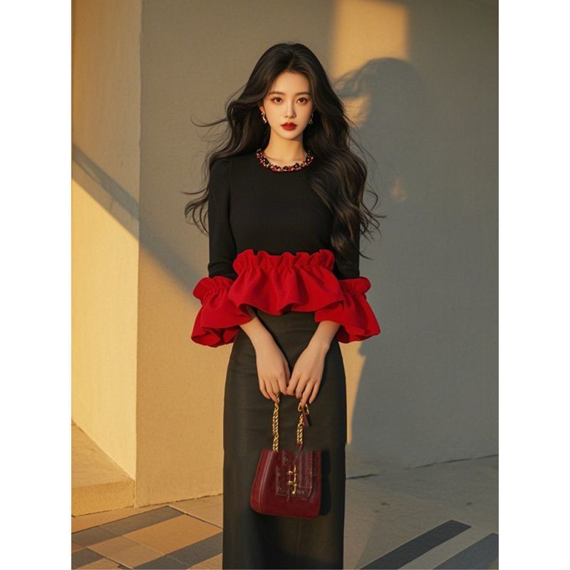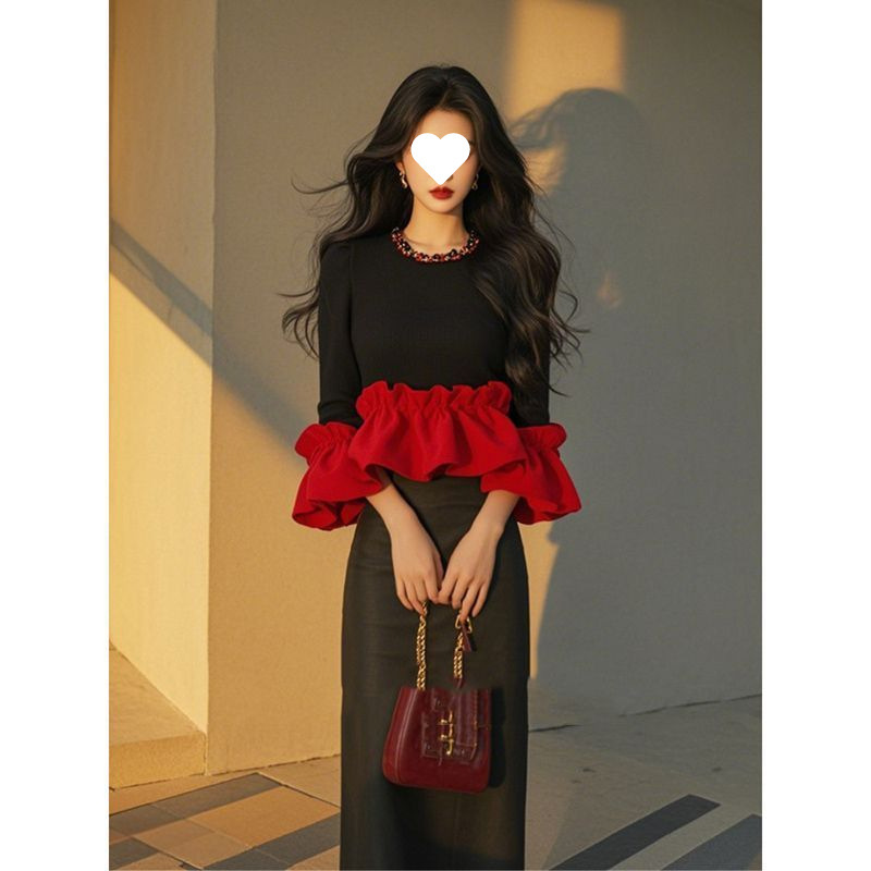 御姐独特绝美小套装黑红荷叶边设计感上衣气质半身裙两件套女春季