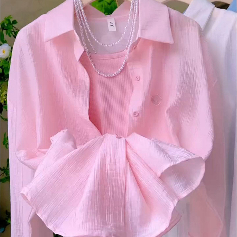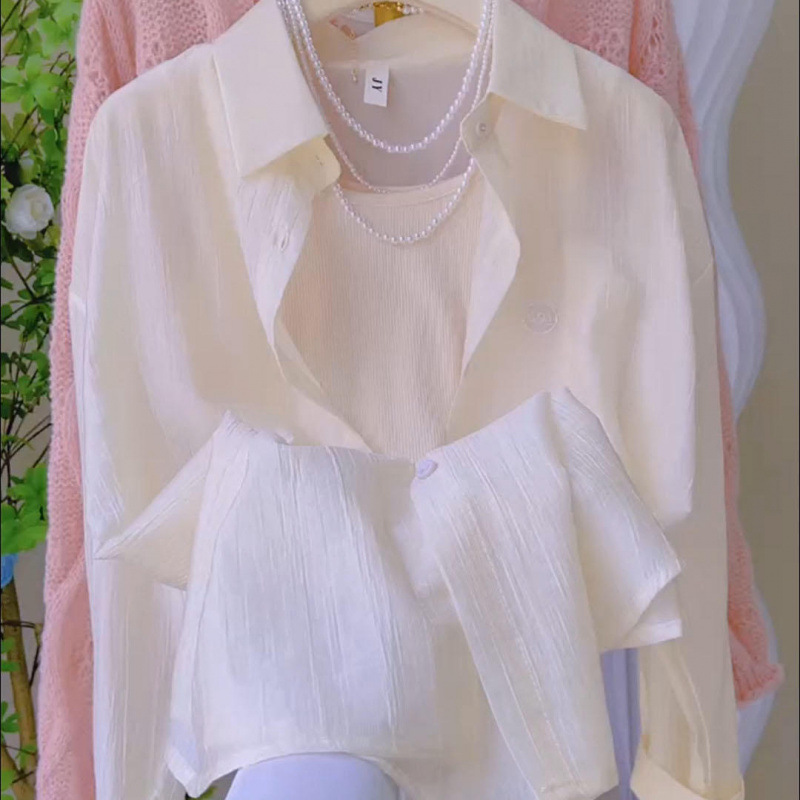 칼라 긴팔 플리츠 썬 셔츠 여성 2025 년 여름 패션 웨스턴 스타일 올 매치 자수 얇은 카디건 재킷