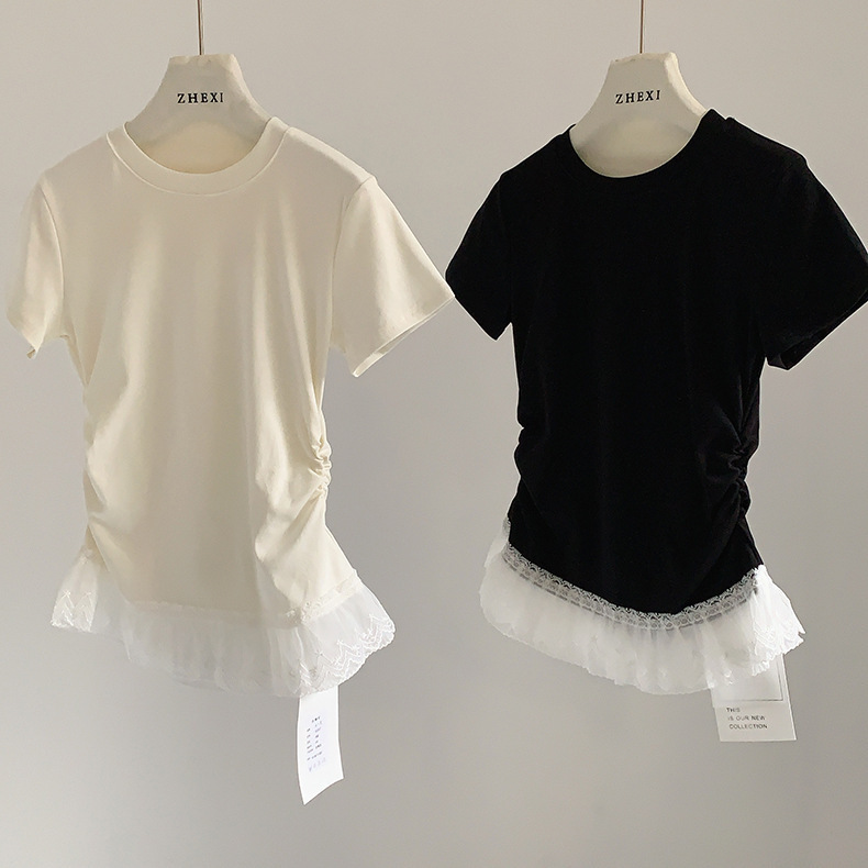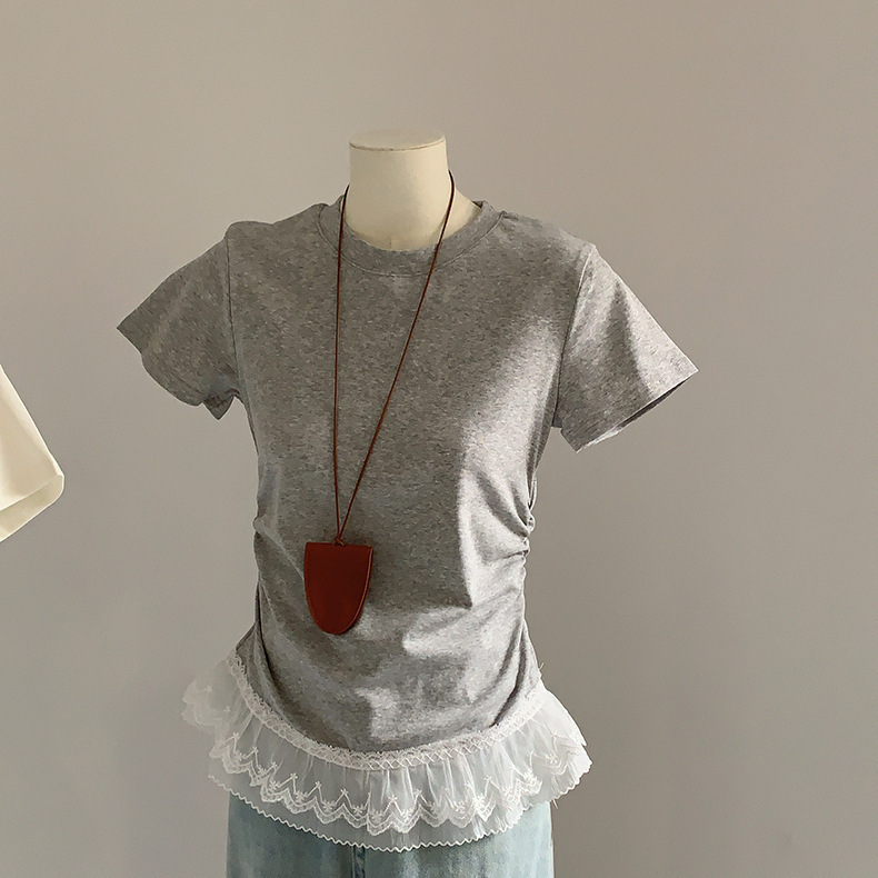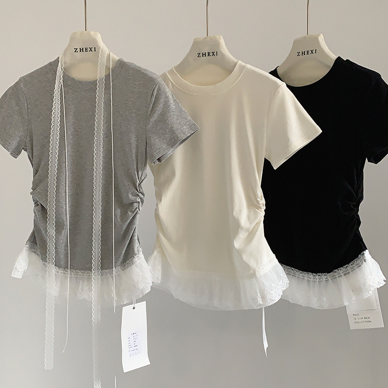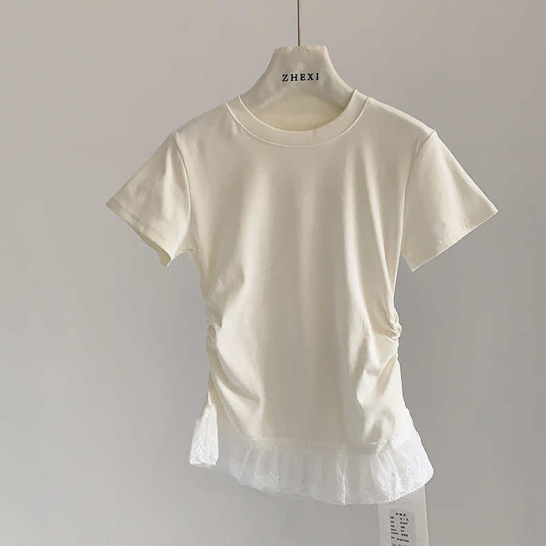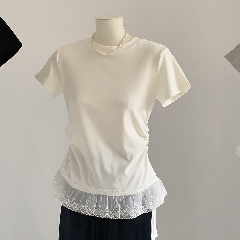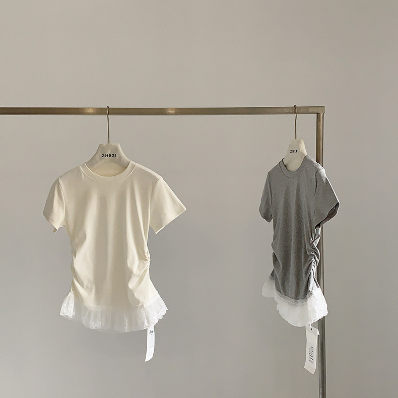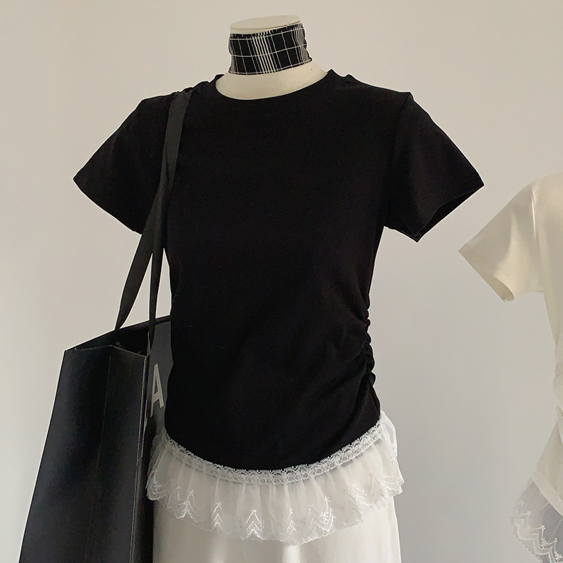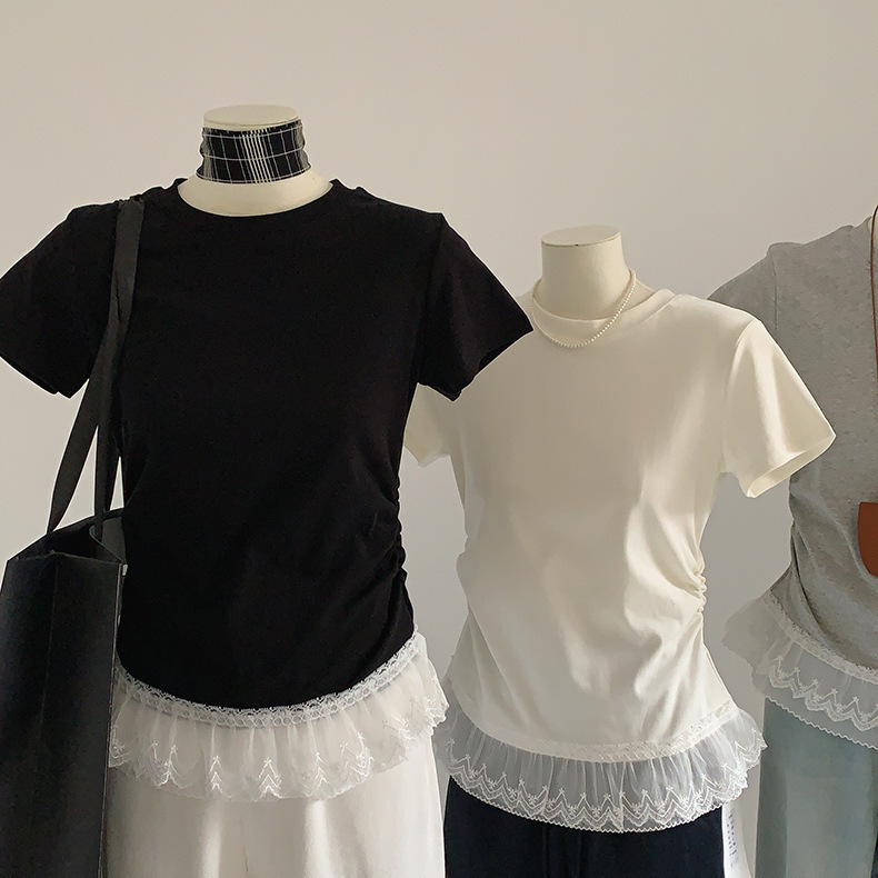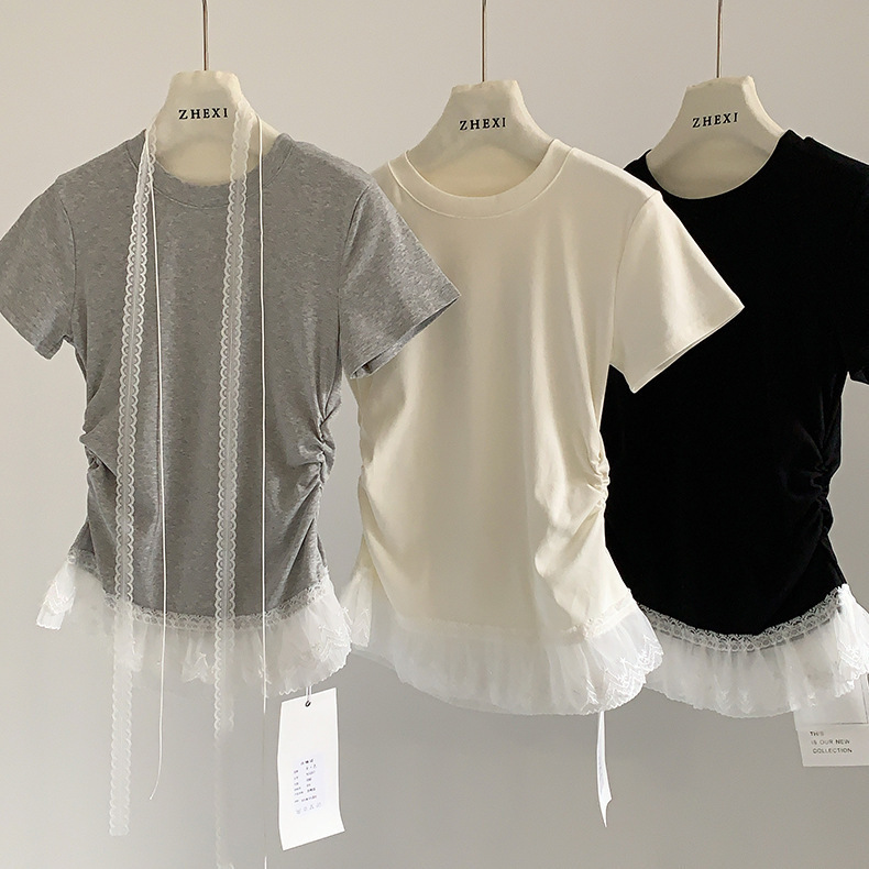이판 타이 프렌치 스티칭 레이스 스커트 반팔 티셔츠 우아한 슬림 핏 발레 스타일베이스 반팔 프론트 숄더 티셔츠스토어 가기
