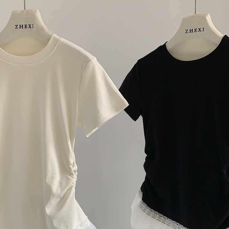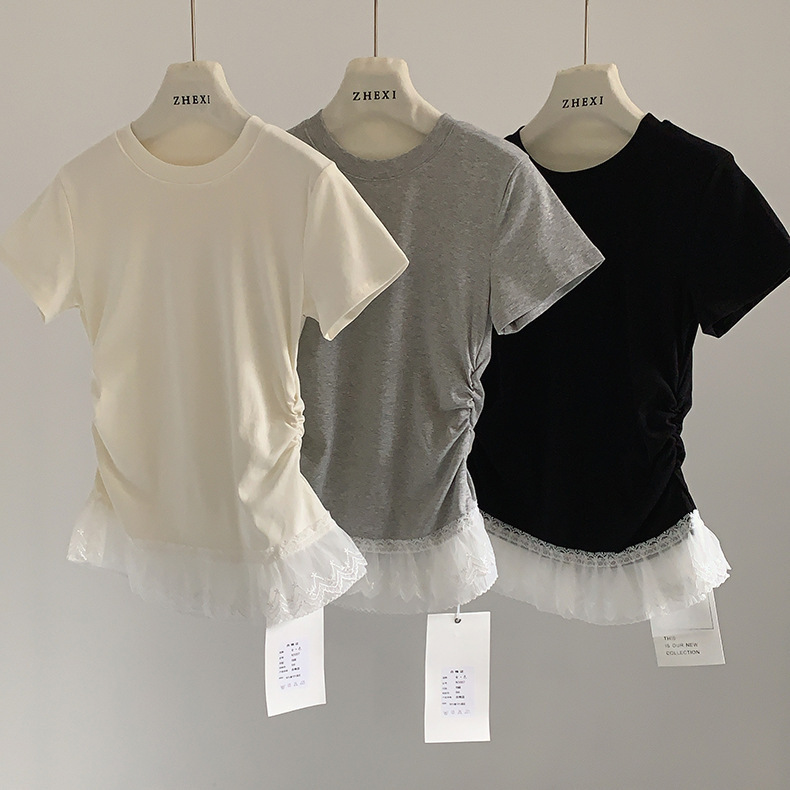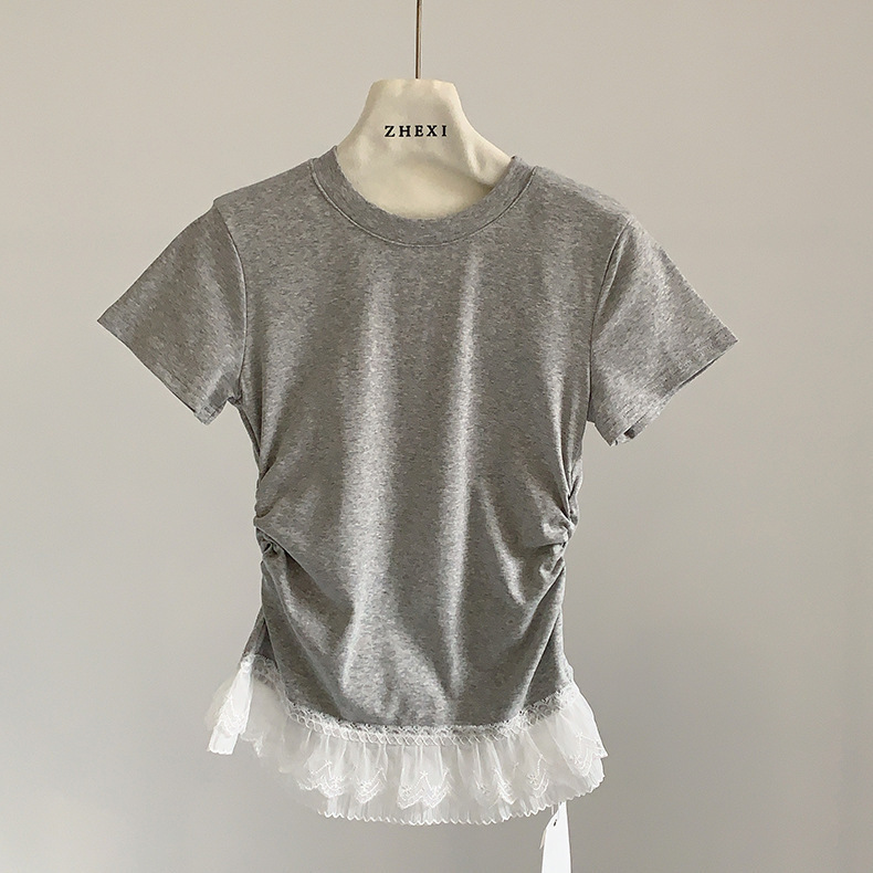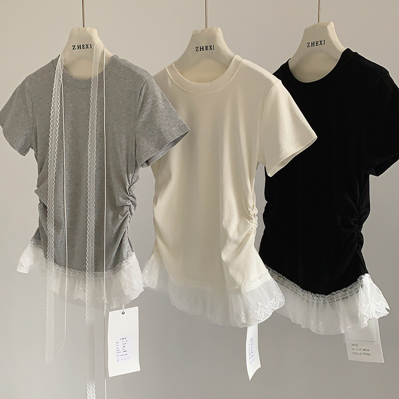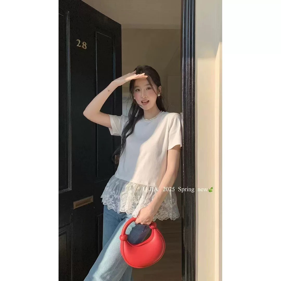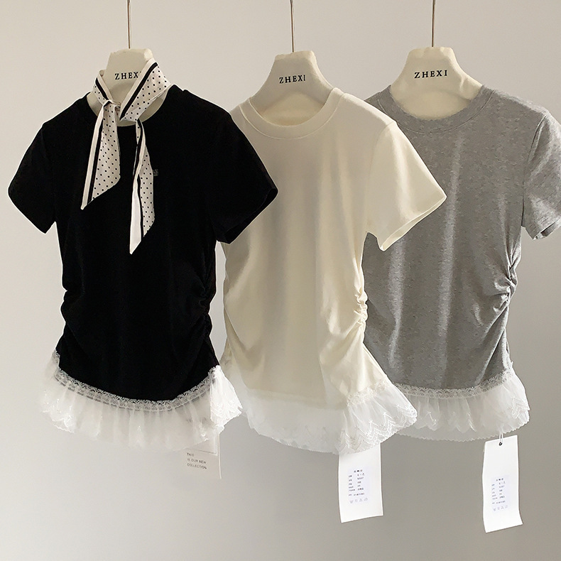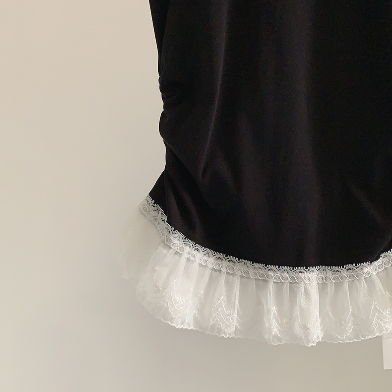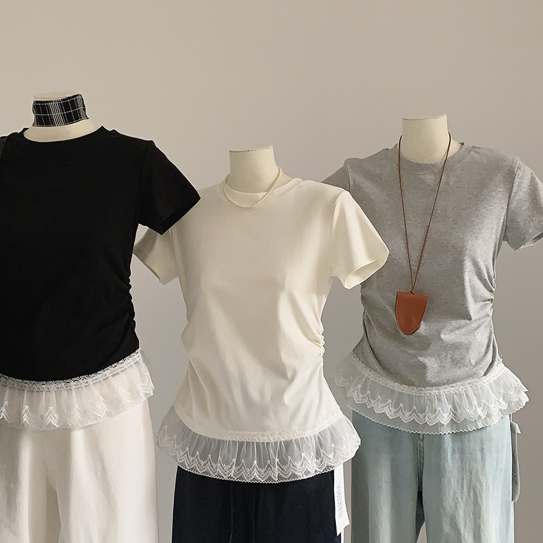 이판 타이 프렌치 스티칭 레이스 스커트 반팔 티셔츠 우아한 슬림 핏 발레 스타일베이스 반팔 프론트 숄더 티셔츠스토어 가기