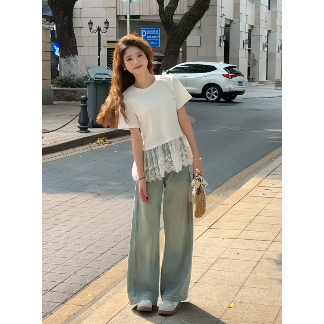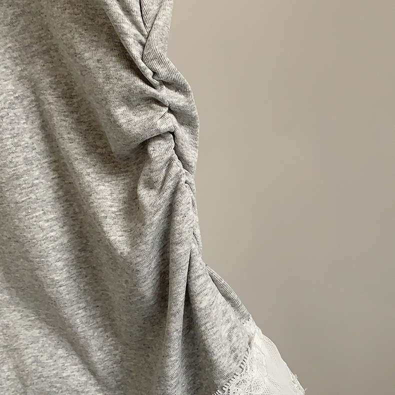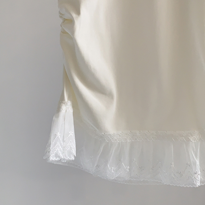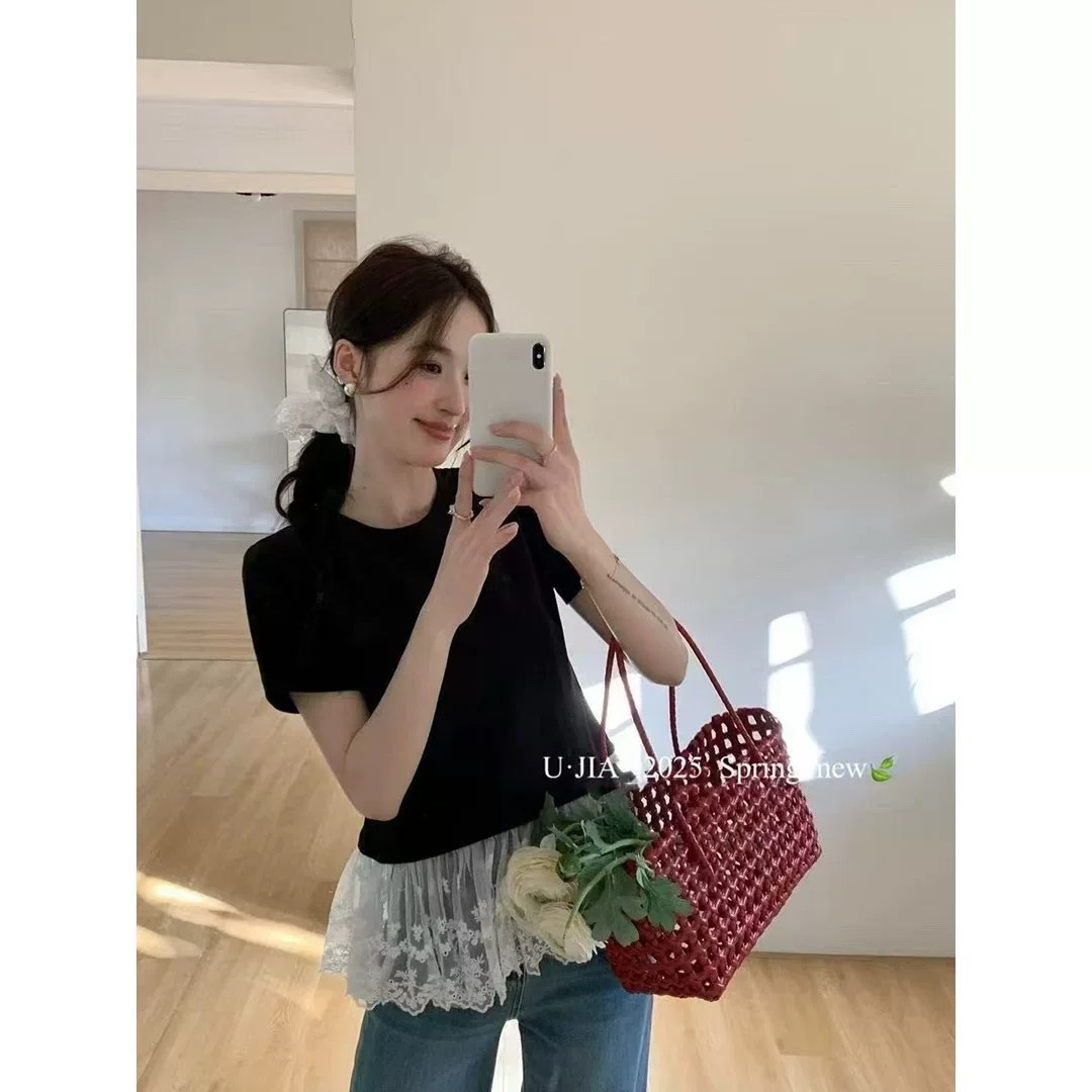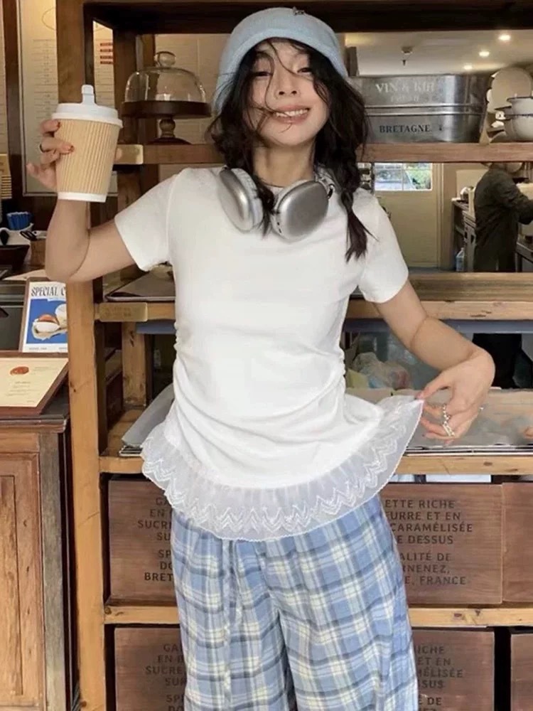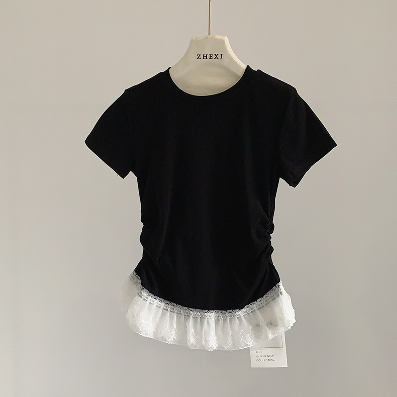 이판 타이 프렌치 스티칭 레이스 스커트 반팔 티셔츠 우아한 슬림 핏 발레 스타일베이스 반팔 프론트 숄더 티셔츠스토어 가기