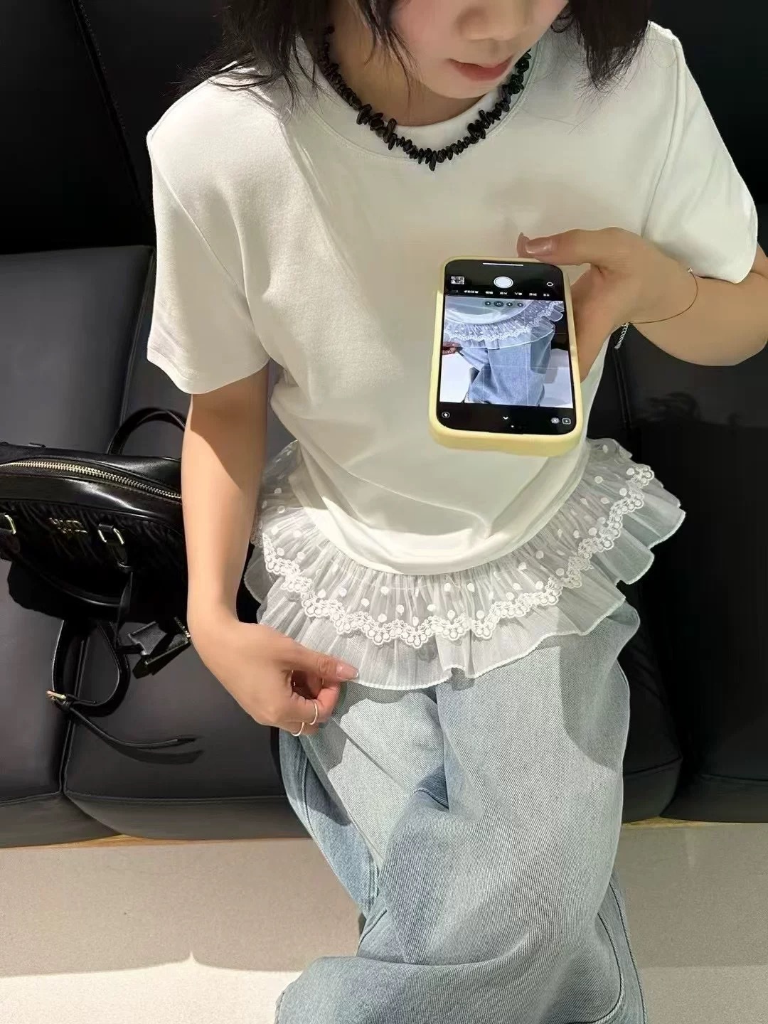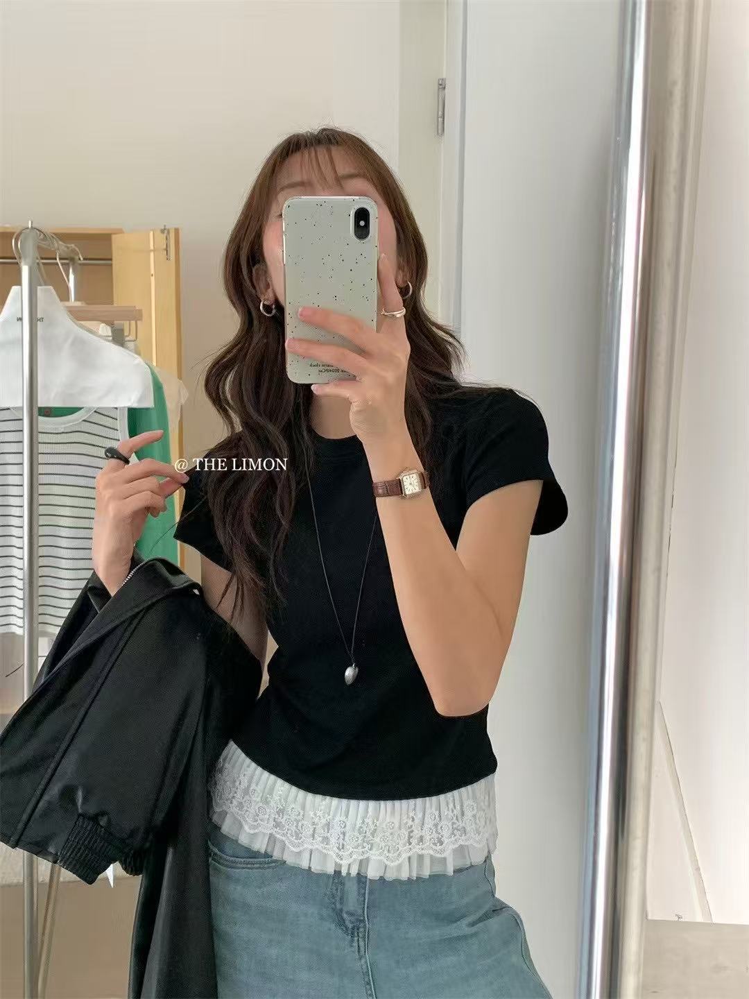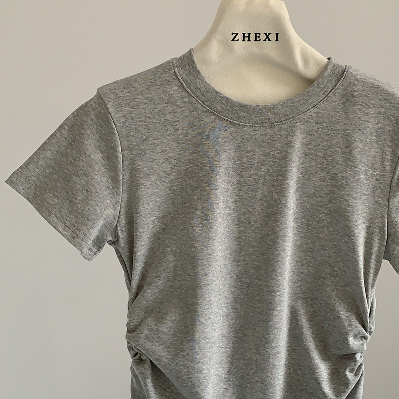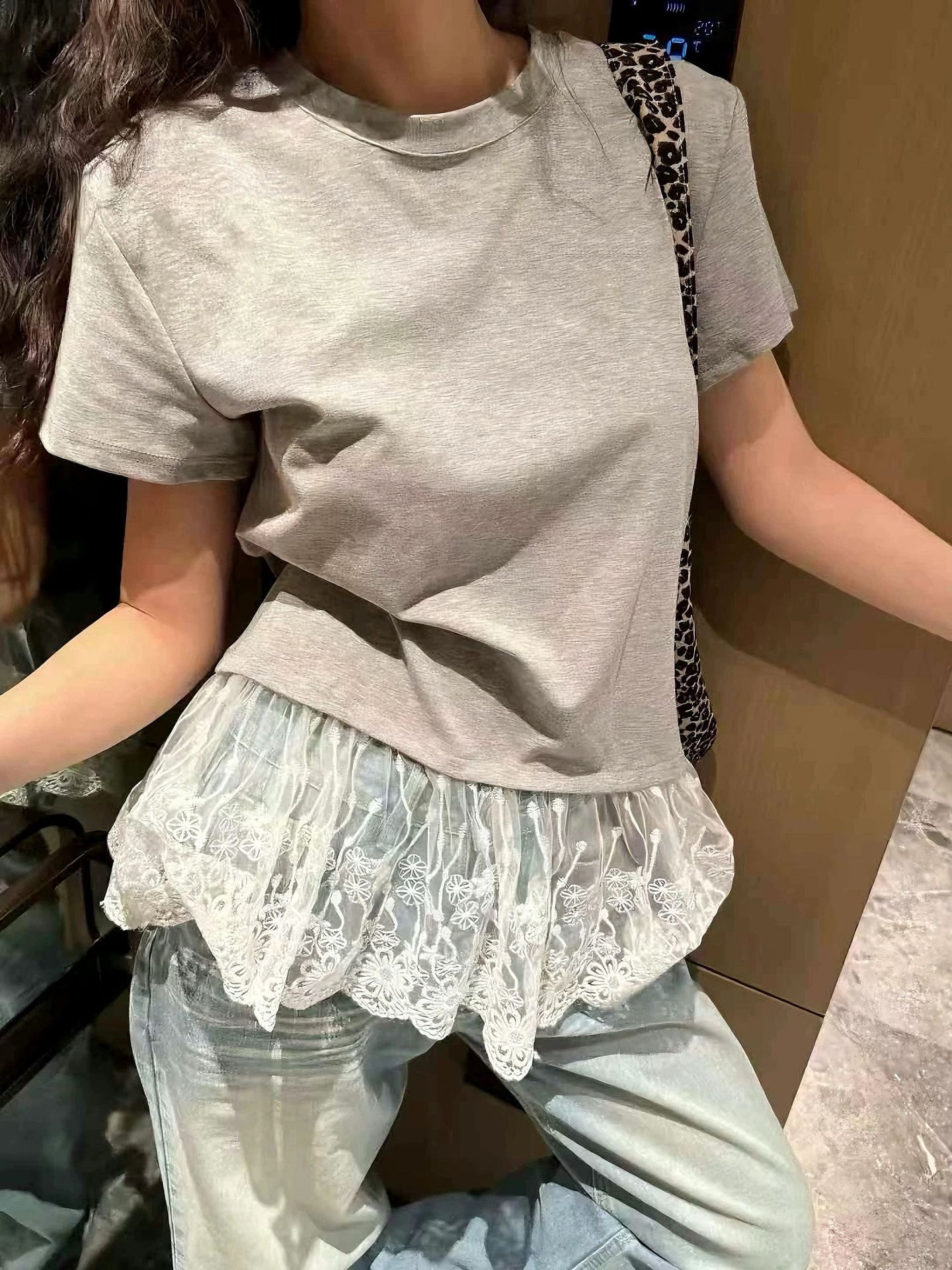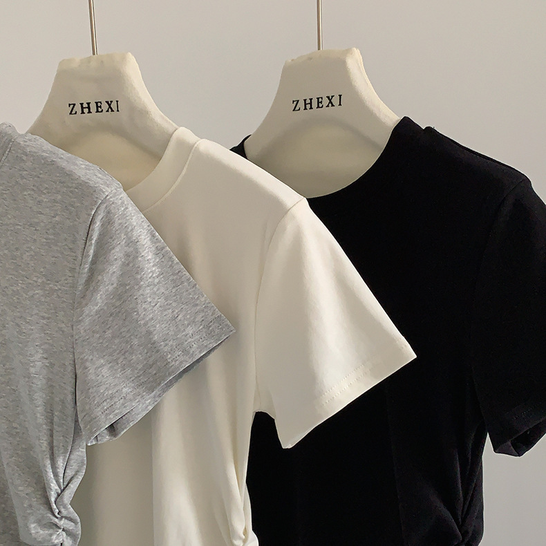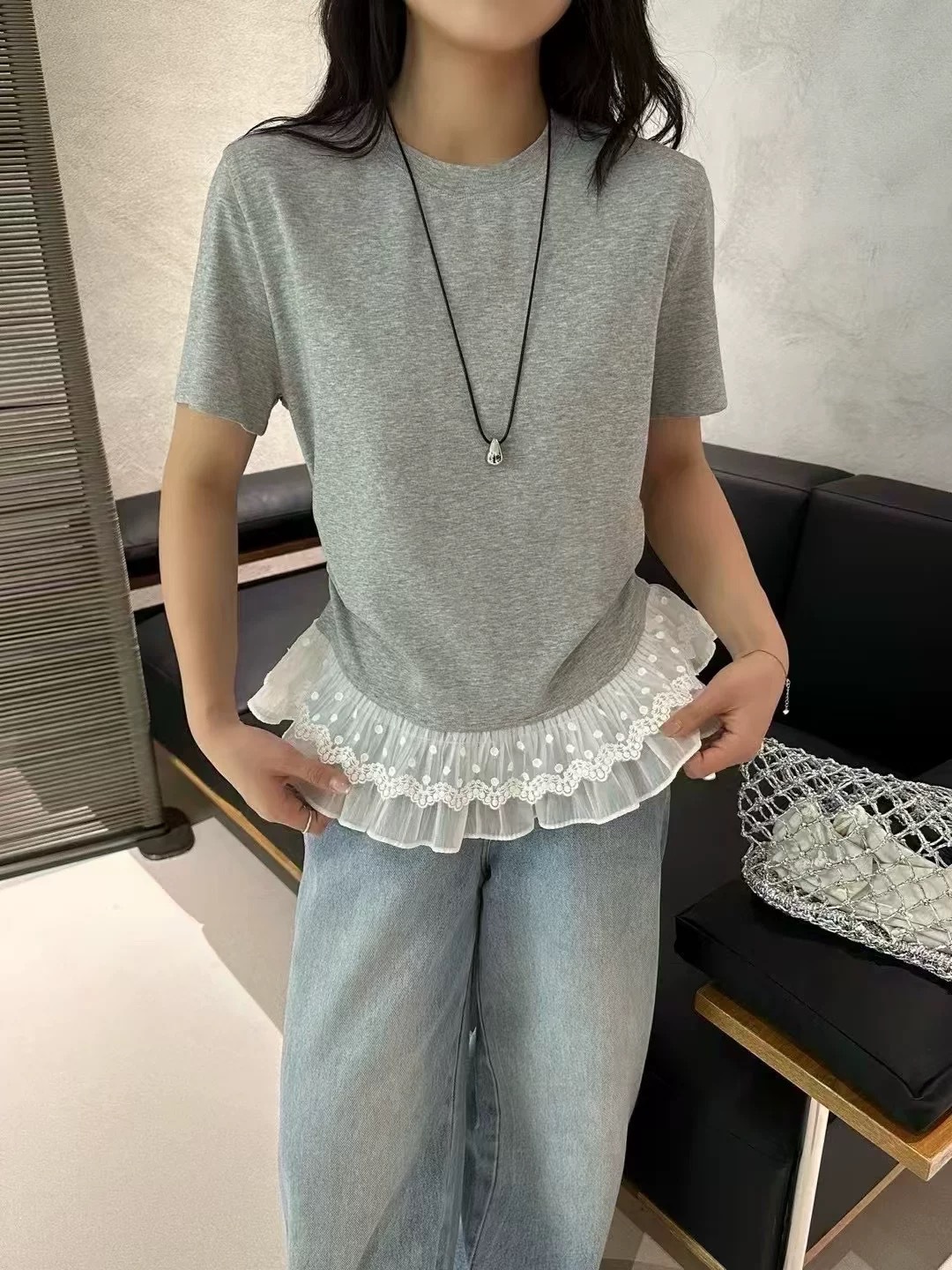 이판 타이 프렌치 스티칭 레이스 스커트 반팔 티셔츠 우아한 슬림 핏 발레 스타일베이스 반팔 프론트 숄더 티셔츠스토어 가기