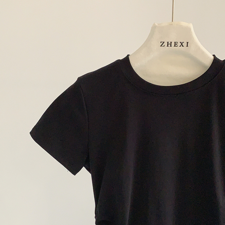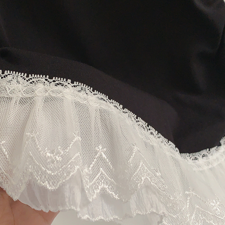 이판 타이 프렌치 스티칭 레이스 스커트 반팔 티셔츠 우아한 슬림 핏 발레 스타일베이스 반팔 프론트 숄더 티셔츠