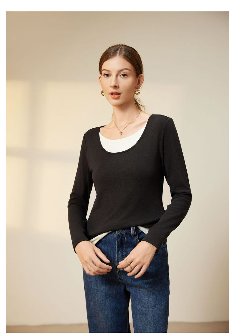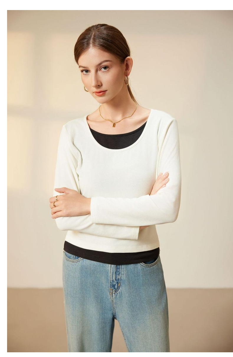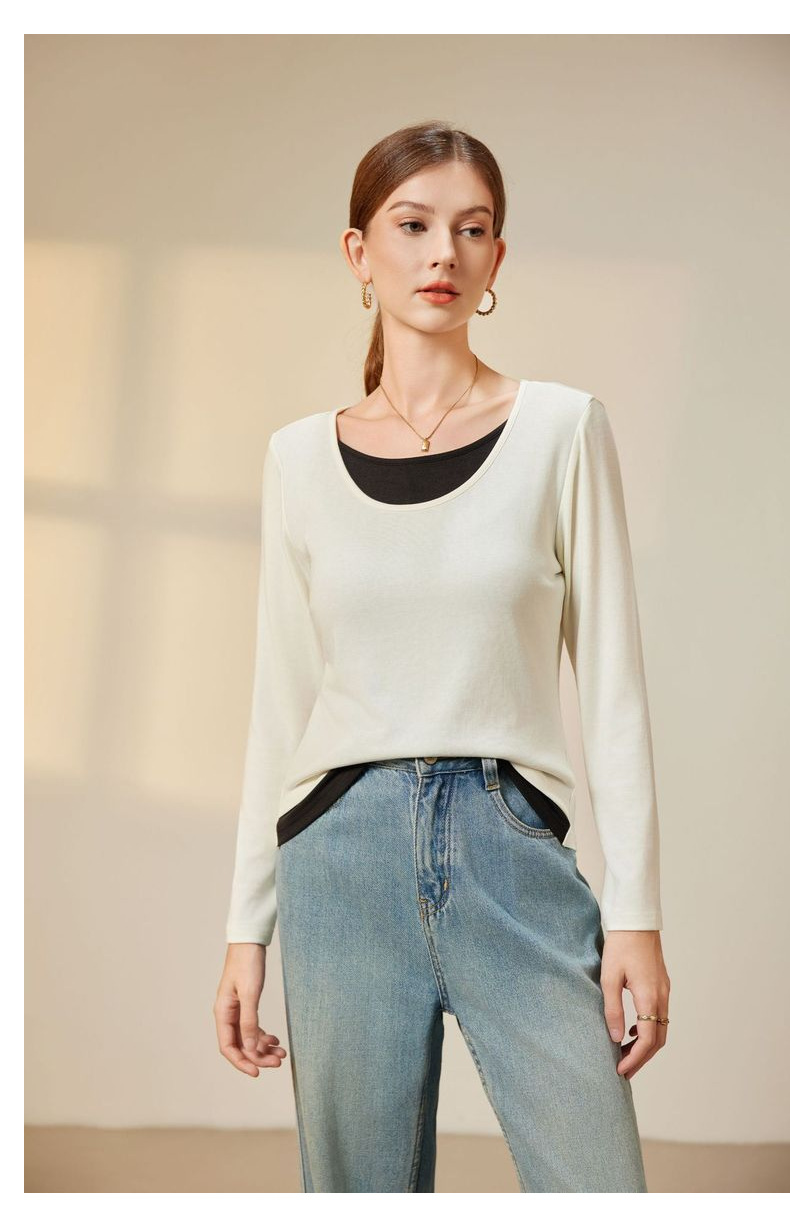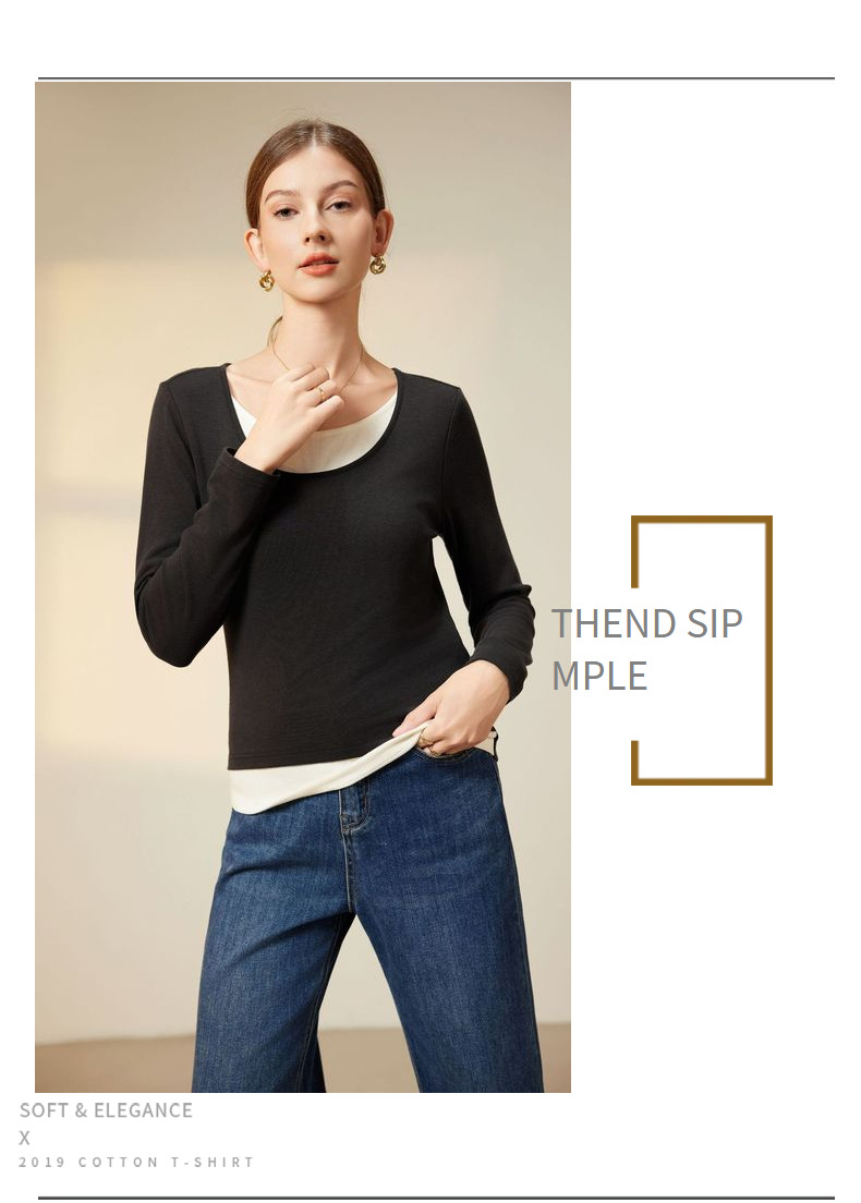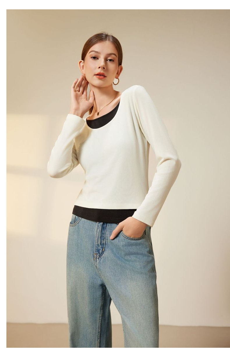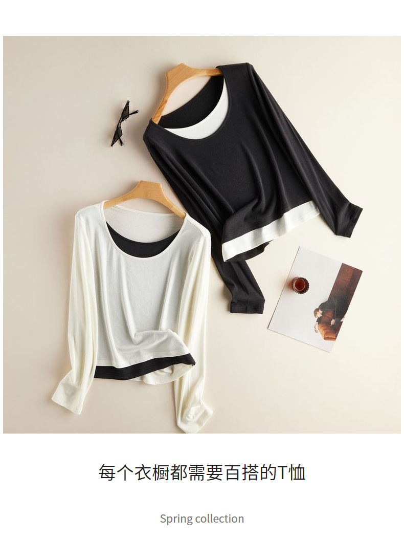콘트라스트 컬러 디자인 라운드 넥 롱 슬리브 티셔츠 여성용 아세테이트 울 텐셀 페이크 투피스 디자인 센스 톱 25 스프링 뉴
