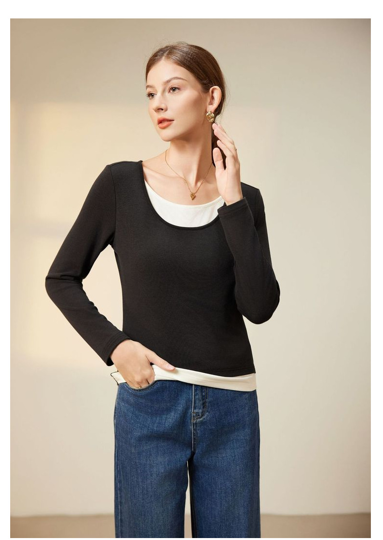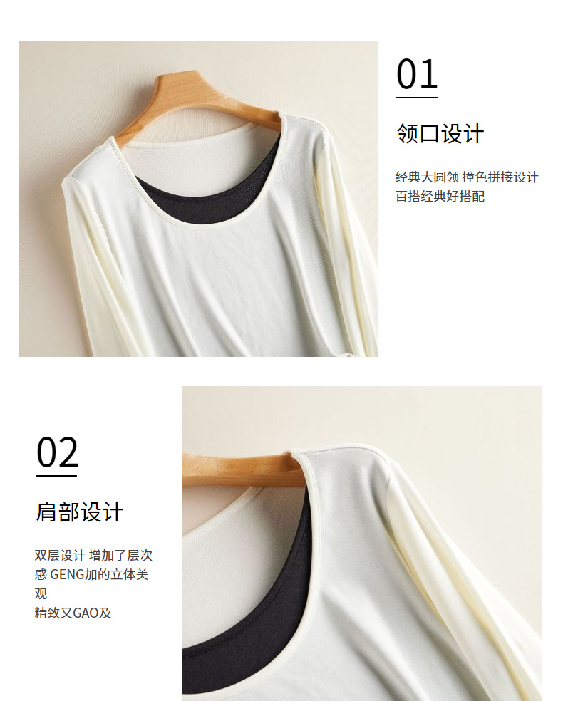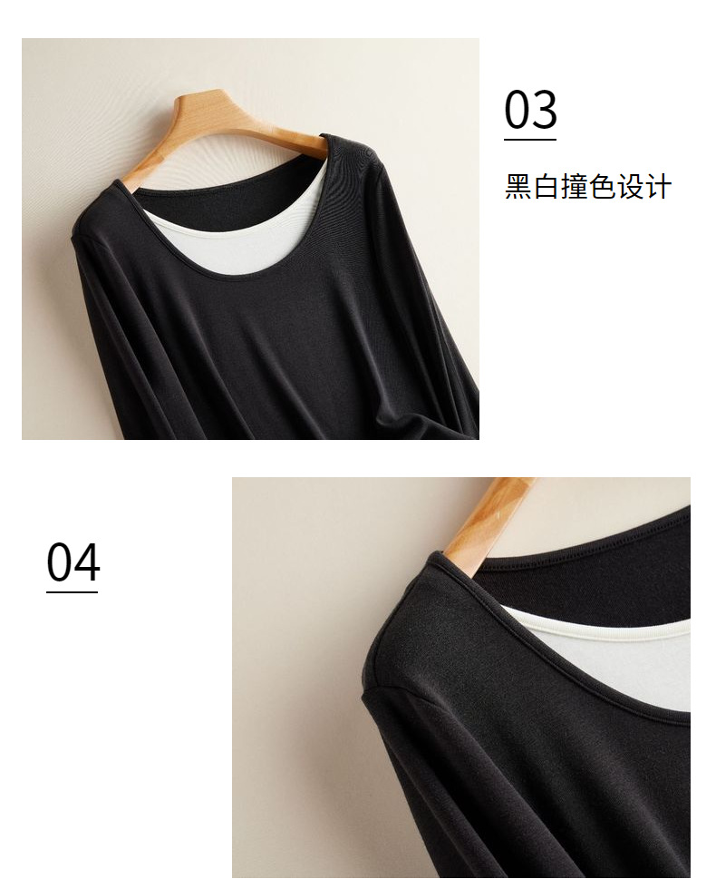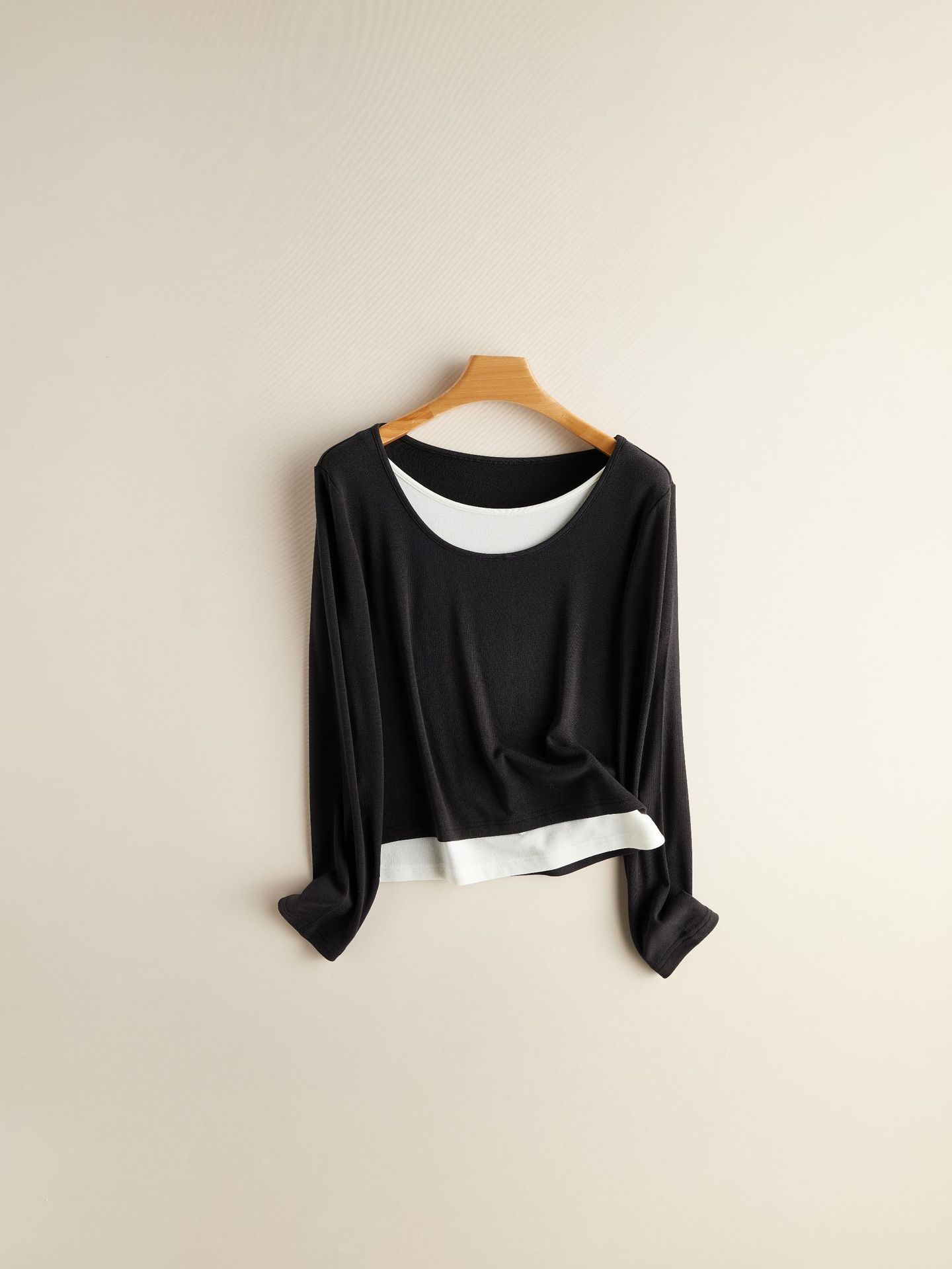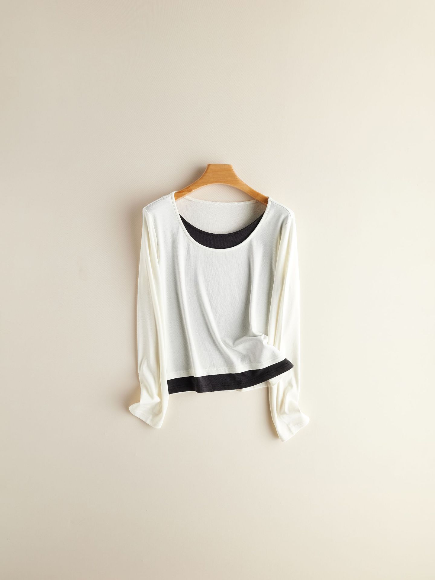 콘트라스트 컬러 디자인 라운드 넥 롱 슬리브 티셔츠 여성용 아세테이트 울 텐셀 페이크 투피스 디자인 센스 톱 25 스프링 뉴스토어 가기