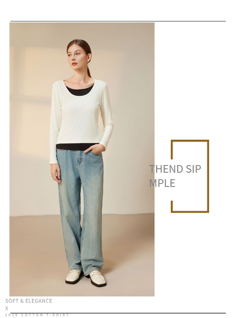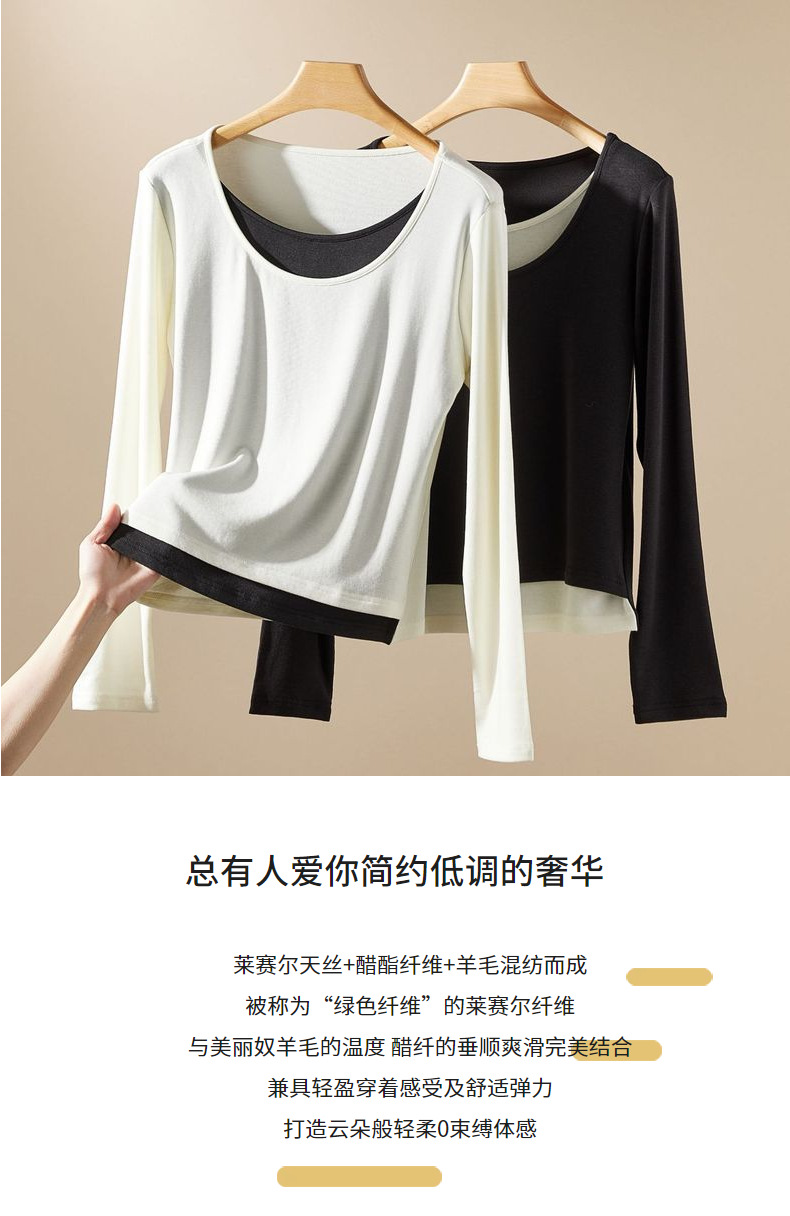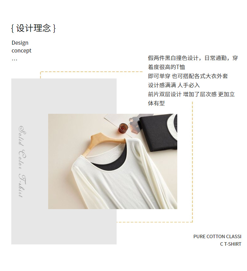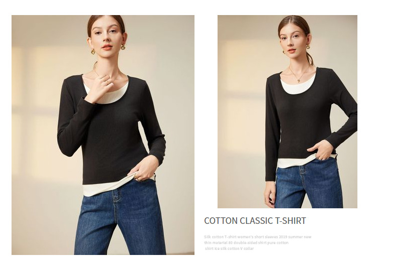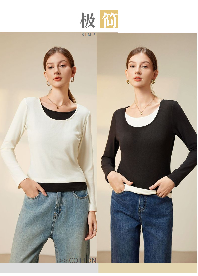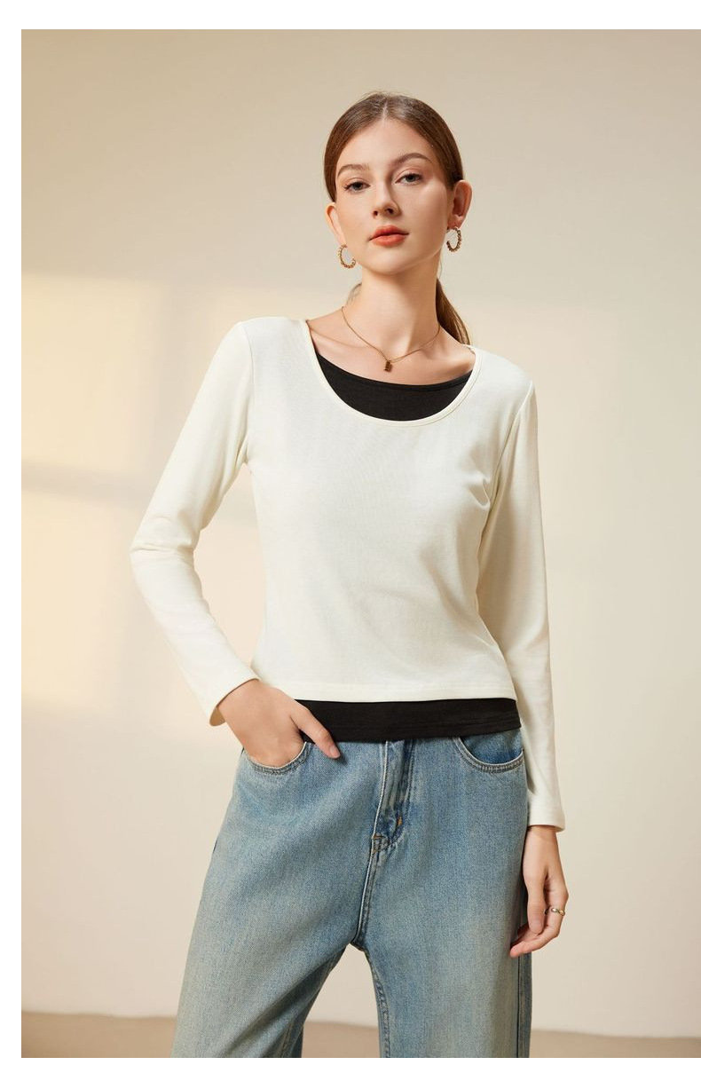 콘트라스트 컬러 디자인 라운드 넥 롱 슬리브 티셔츠 여성용 아세테이트 울 텐셀 페이크 투피스 디자인 센스 톱 25 스프링 뉴스토어 가기
