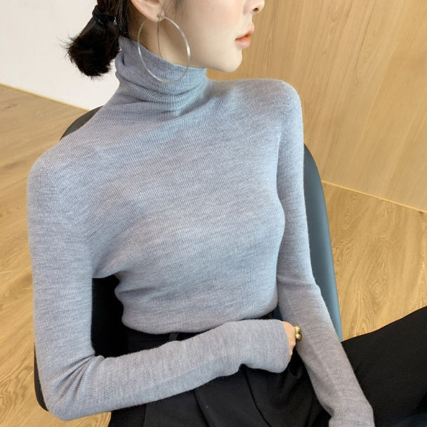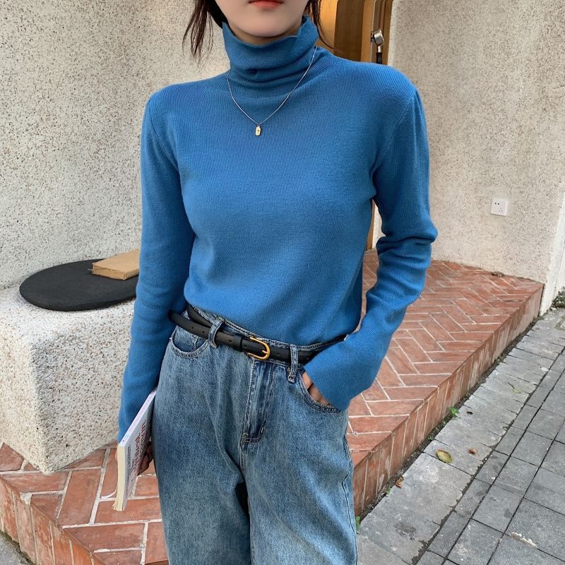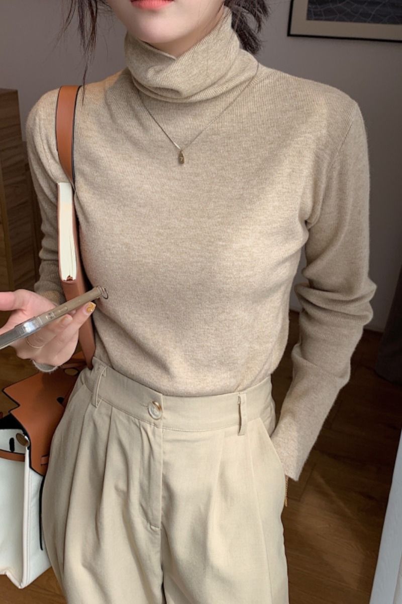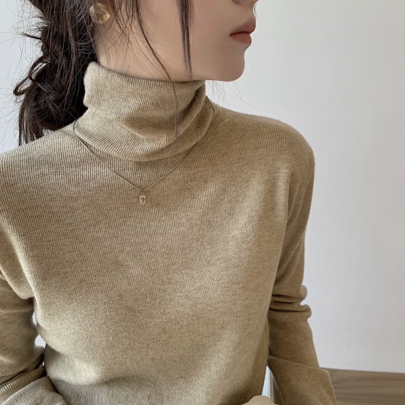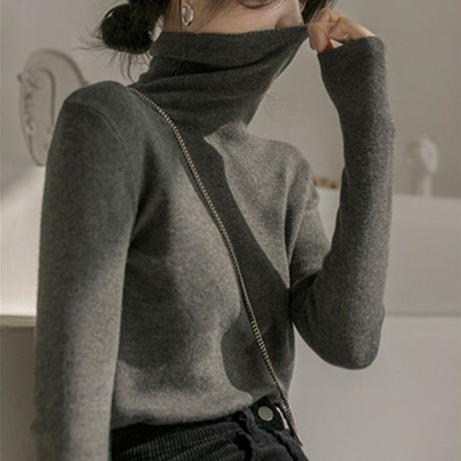 오트밀 힙 니트 터틀넥 새로운 스타일 아우터 착용 풀오버 스웨터 탑 가을 및 겨울 솔리드 컬러베이스 여성용 슬림 핏 스웨터