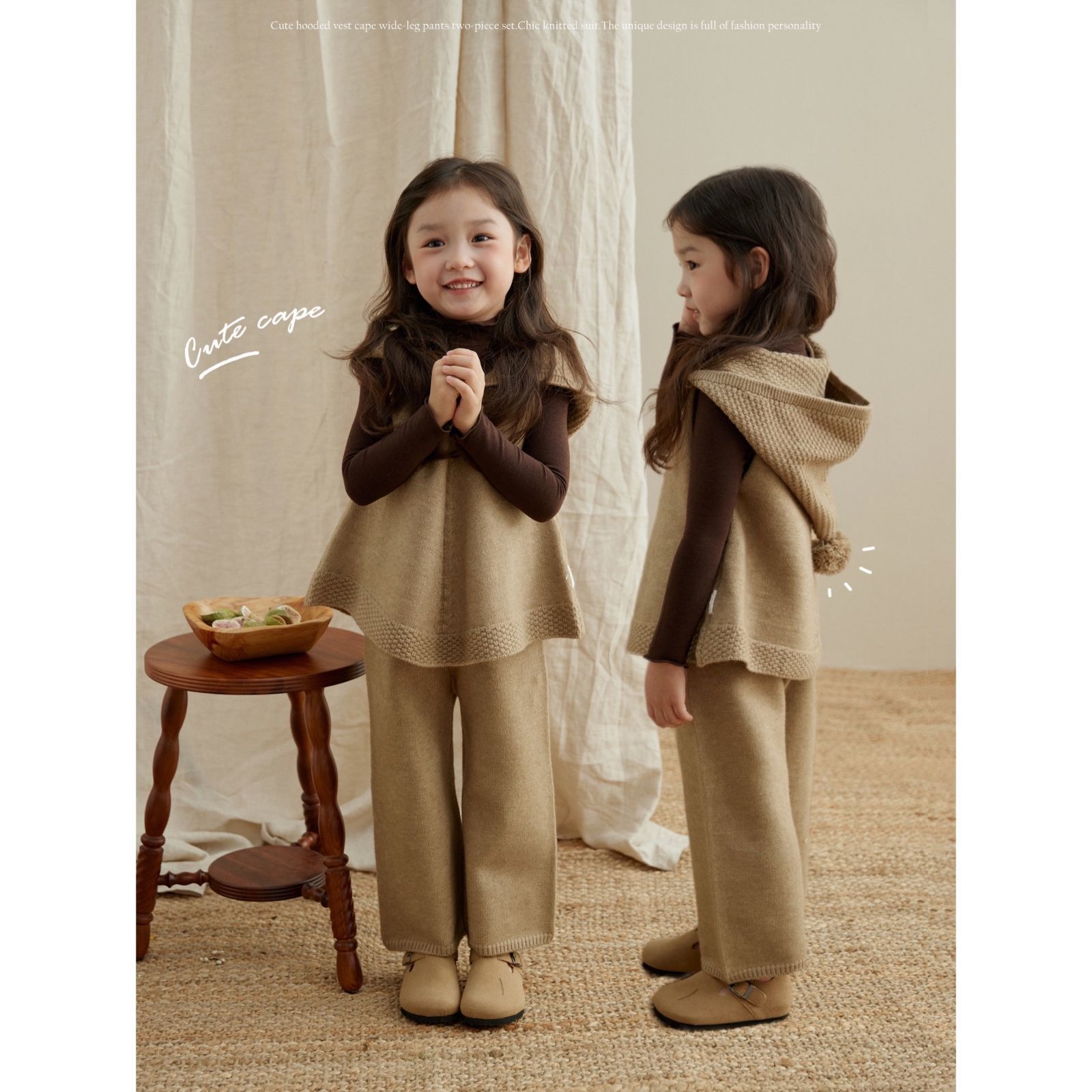 여자 스웨터 세트 2025 봄 새로운 어린이 한국식 후드 니트웨어 조끼 와이드 레그 바지 3 피스 세트