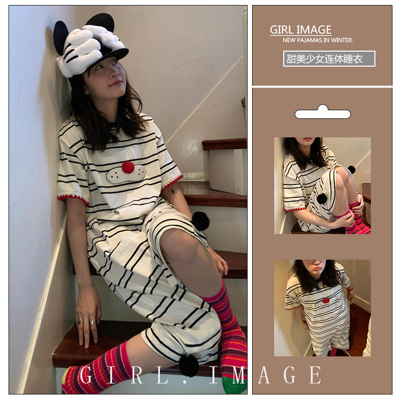 만화 멋진 고양이 줄무늬 나이트 드레스 여름 여성의 한 몸 반팔 면화 잠옷 느슨한 플러스 사이즈 홈 웨어