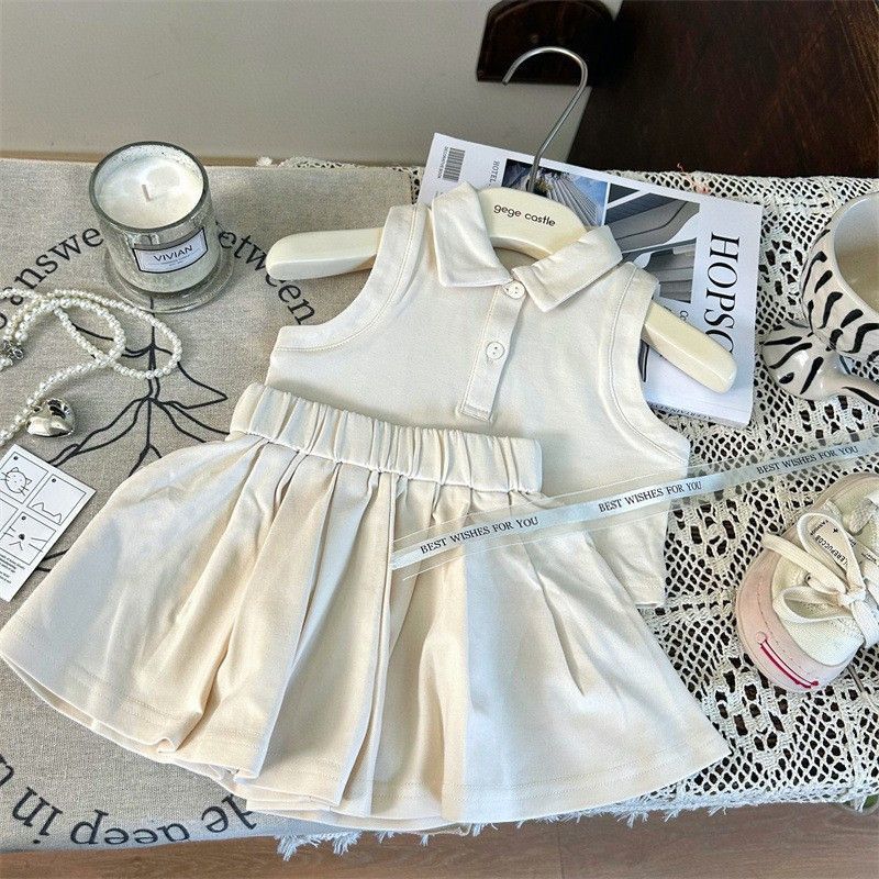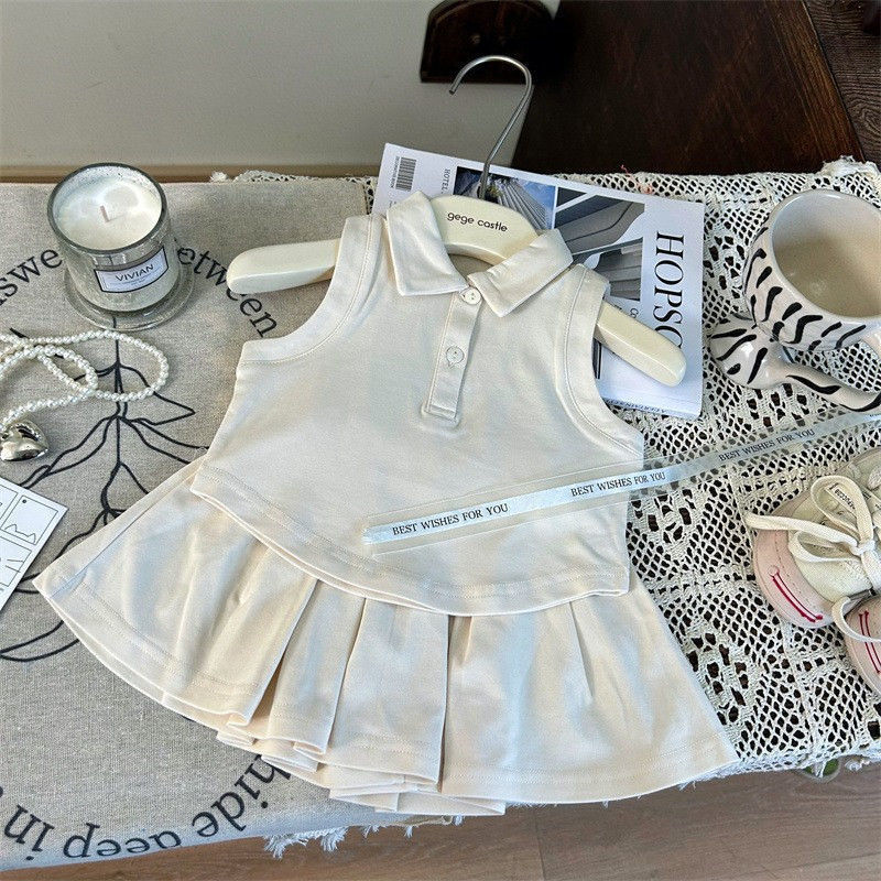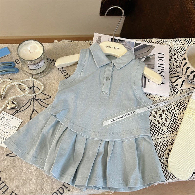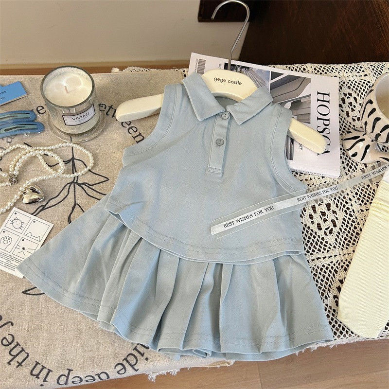 2025 새로운 소녀 솔리드 컬러 조끼 스커트 투피스 세트 아기 한국 스타일 여름 세트 트렌디 한 주름 치마