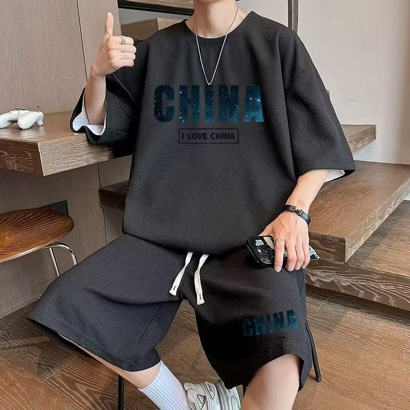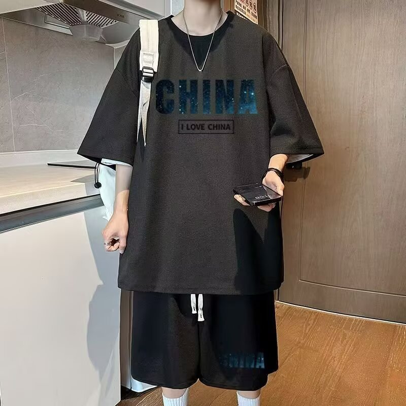 Guochao Waffe 캐주얼 세트 소년 여름 홍콩 스타일 플러스 사이즈 느슨한 반팔 티셔츠 반바지 스포츠 투피스 세트