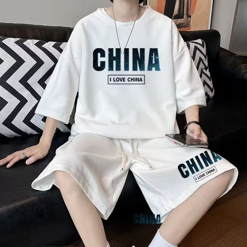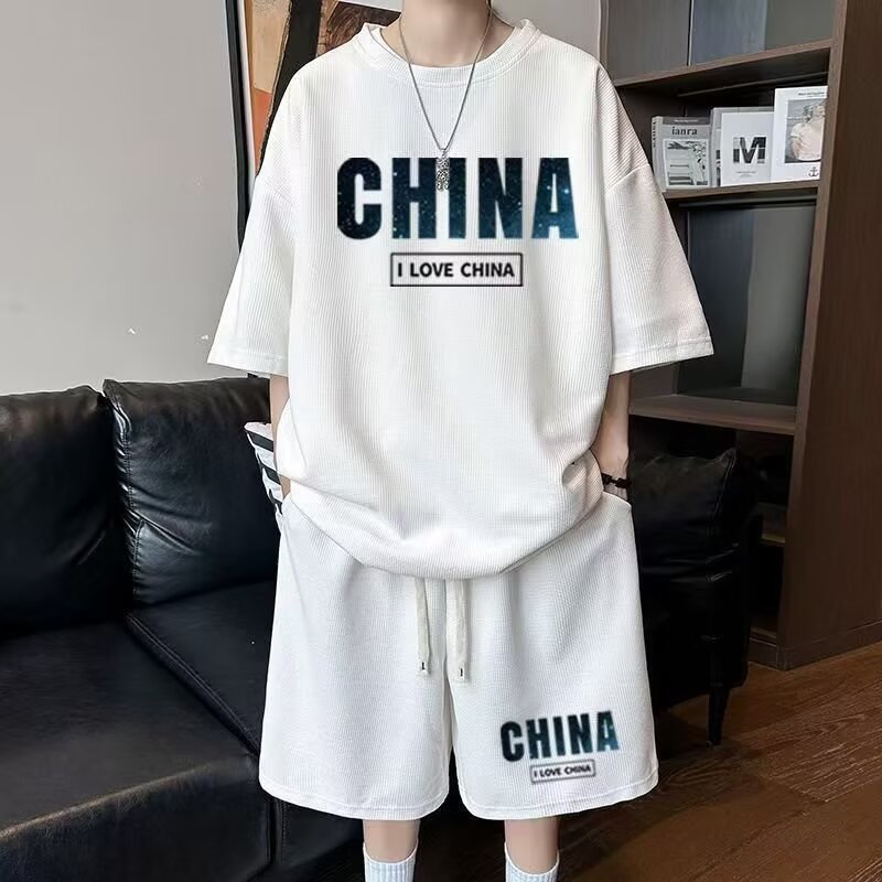 Guochao Waffe 캐주얼 세트 소년 여름 홍콩 스타일 플러스 사이즈 느슨한 반팔 티셔츠 반바지 스포츠 투피스 세트스토어 가기