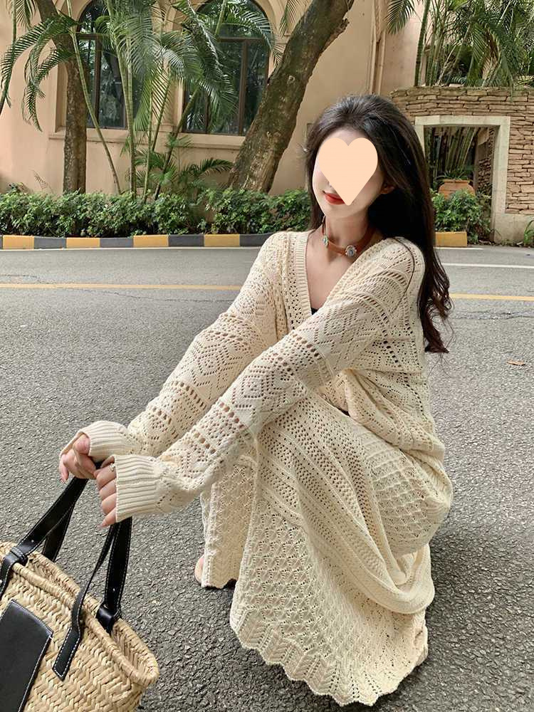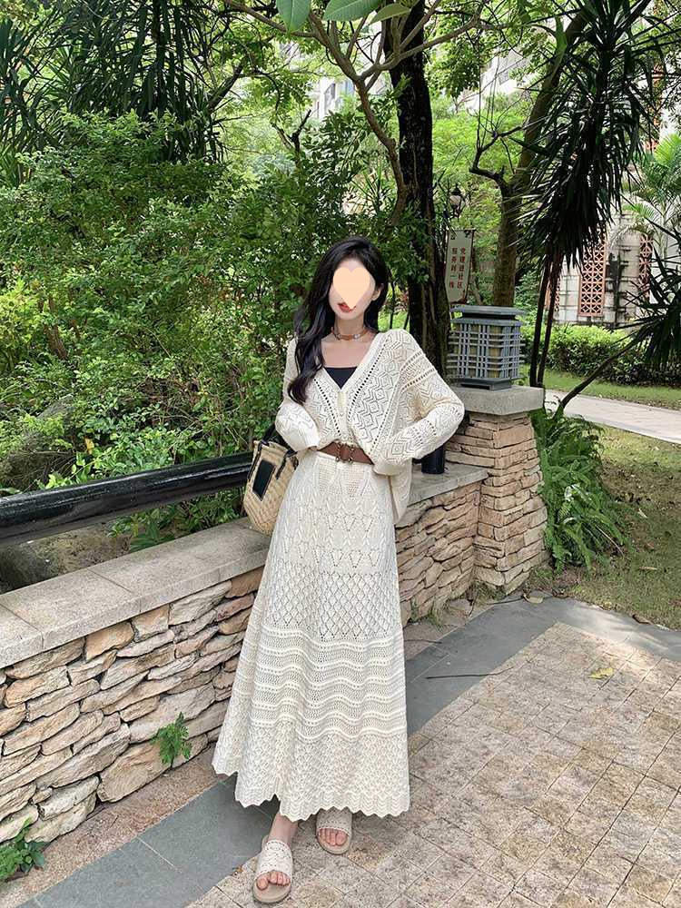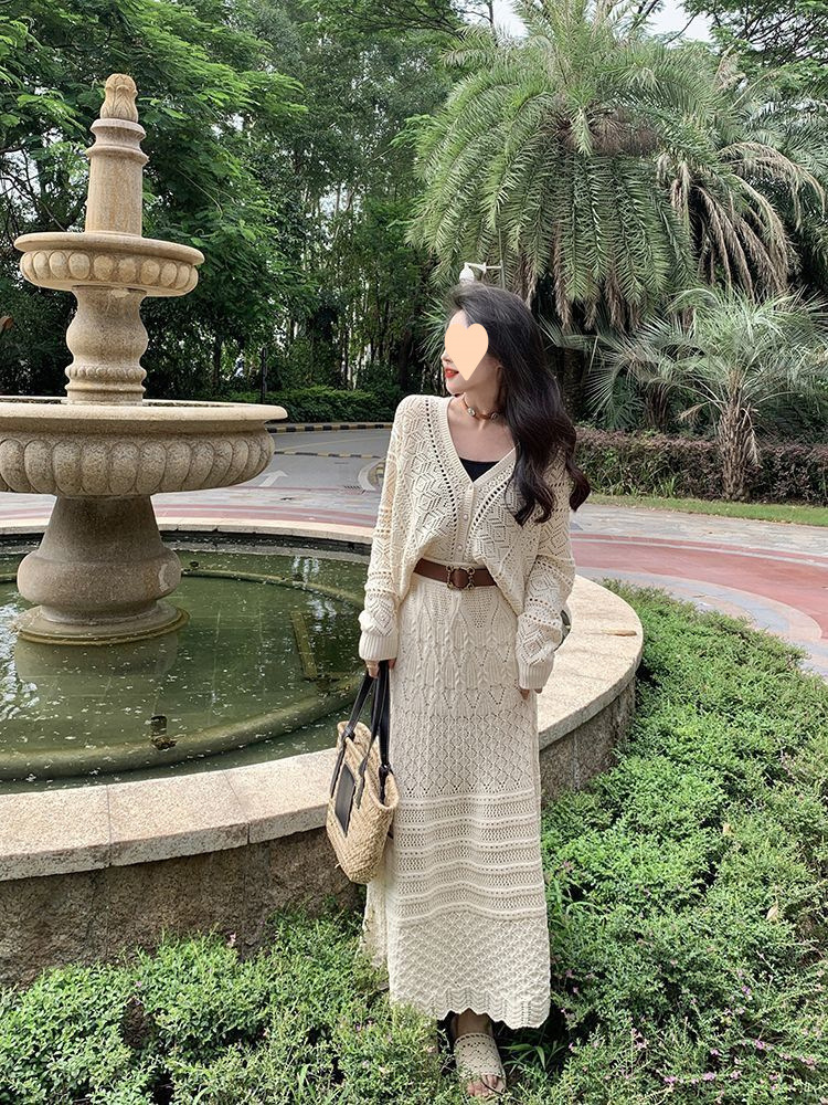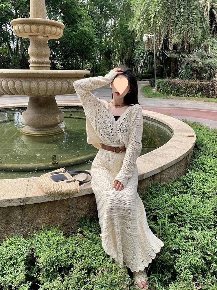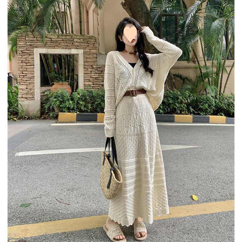 프랑스 스타일 게으른 스타일 고급 할로우 니트 카디건 여성 봄과 가을 높은 허리 스웨터 원피스 패션 투피스 세트스토어 가기
