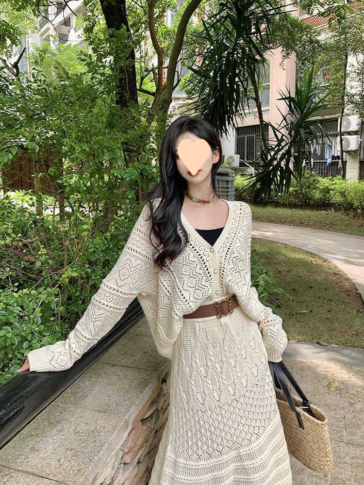 프랑스 스타일 게으른 스타일 고급 할로우 니트 카디건 여성 봄과 가을 높은 허리 스웨터 원피스 패션 투피스 세트