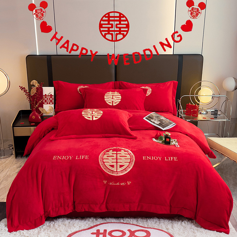 2024 새로운 우유 벨벳 웨딩 자수 4 피스 세트 1.5m 침대 시트 4 피스 세트 사랑스토어 가기