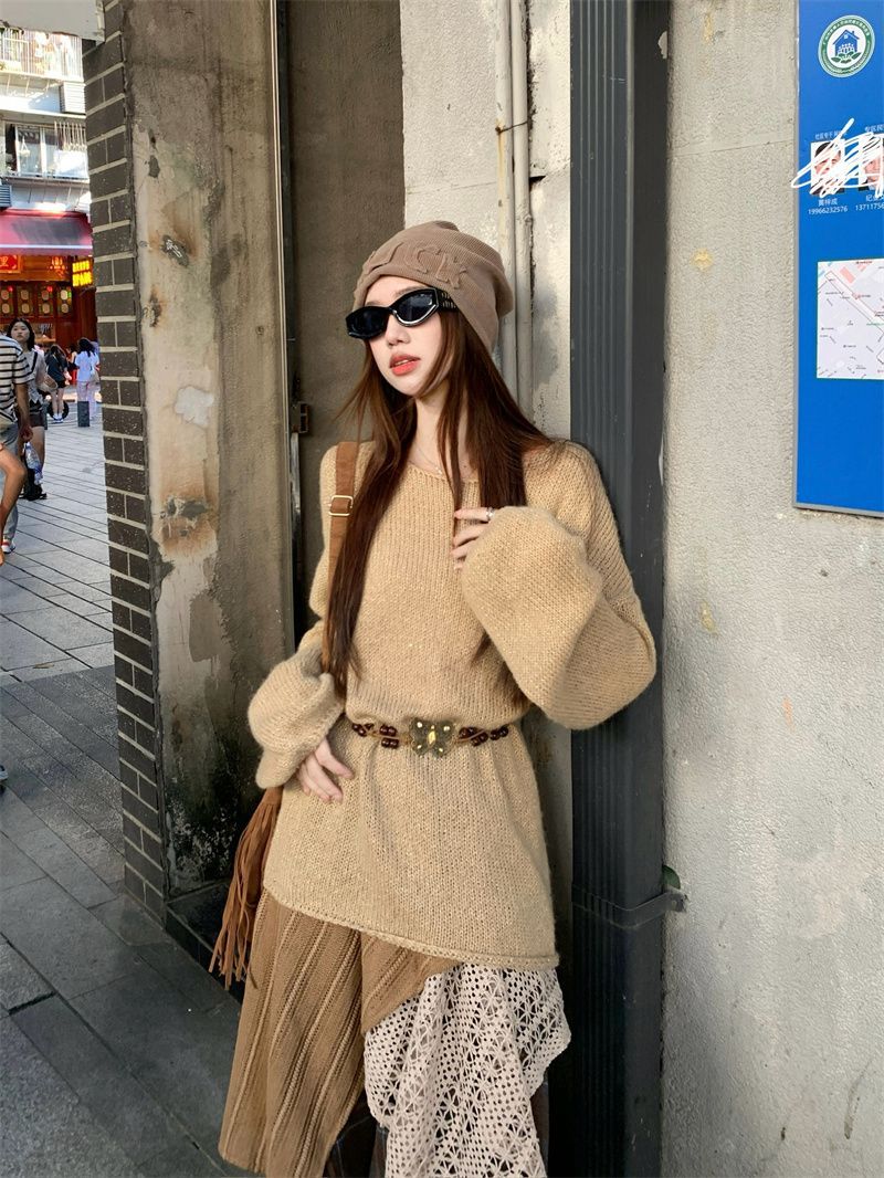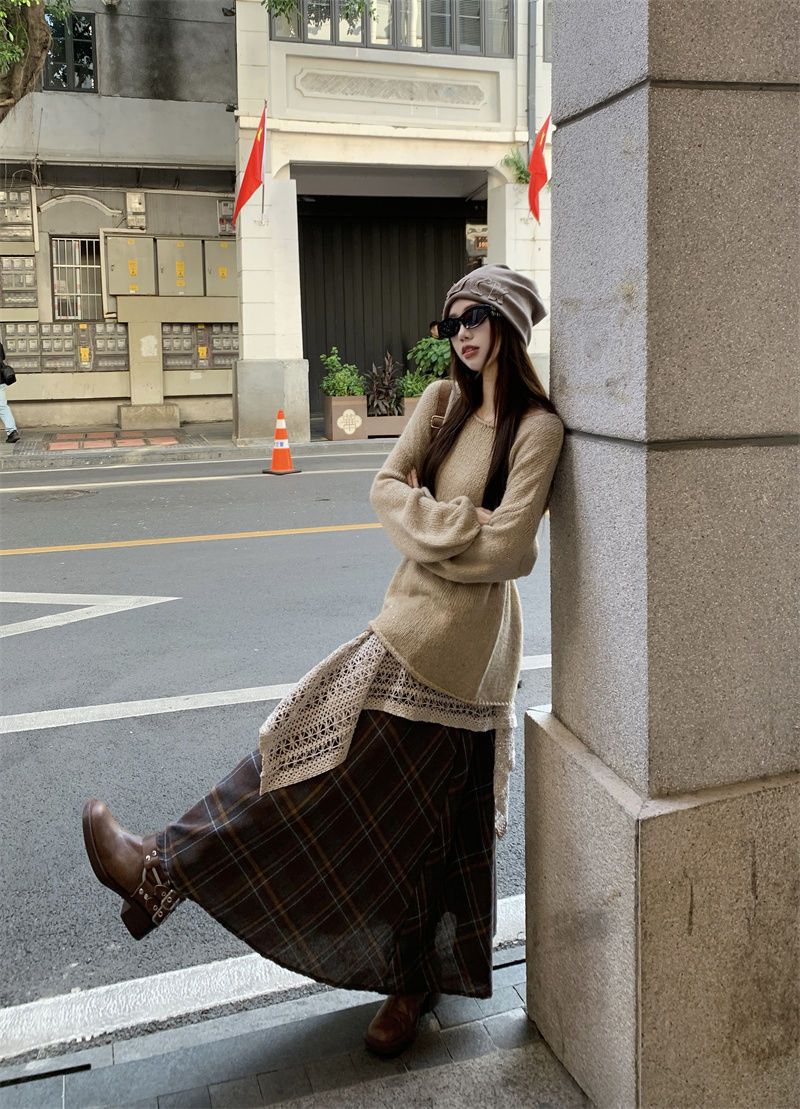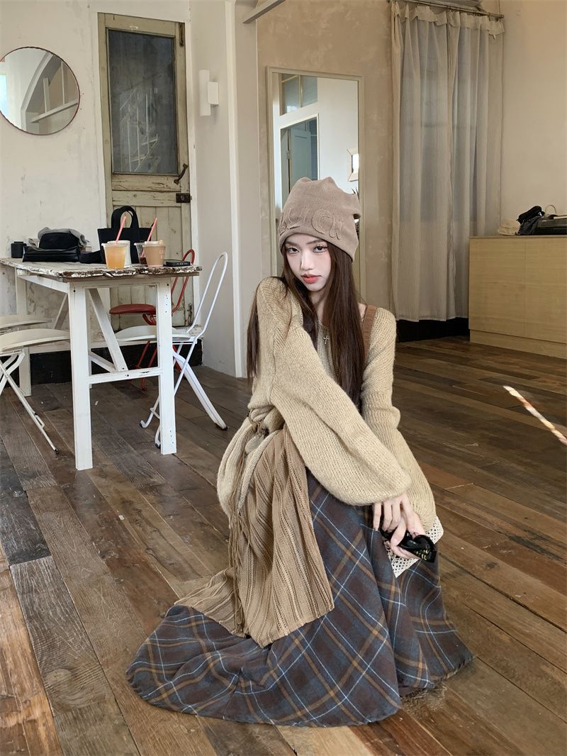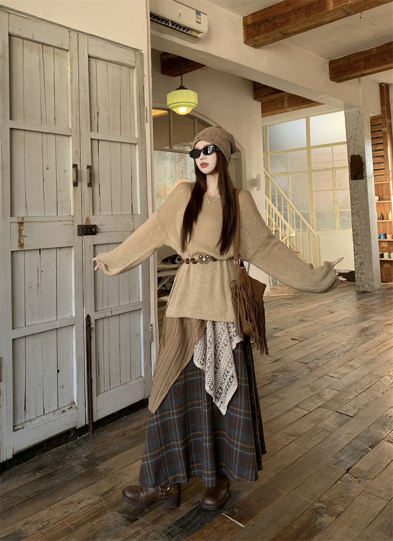 3 피스 세트 게으른 느슨한 니트웨어 스웨터 불규칙한 격자 무늬 바느질 치마 여성의 이른 봄 패션스토어 가기
