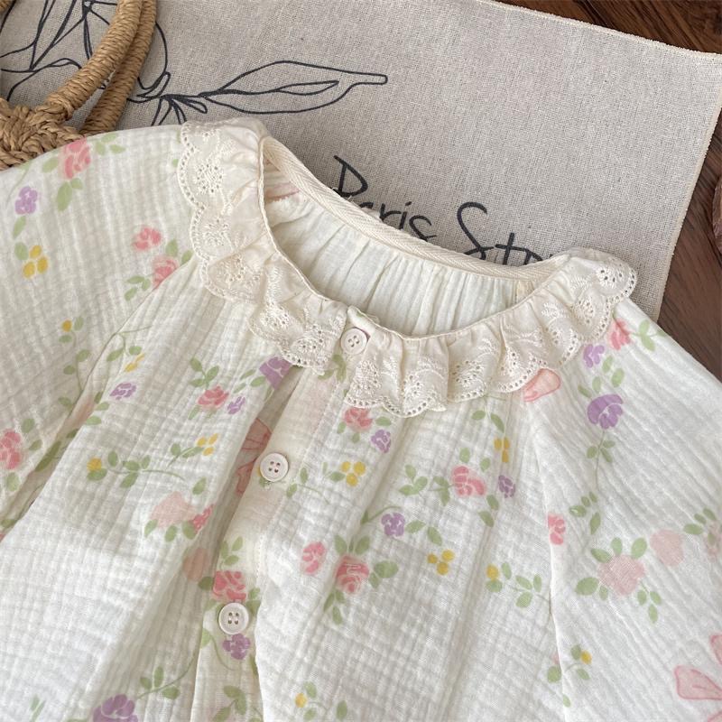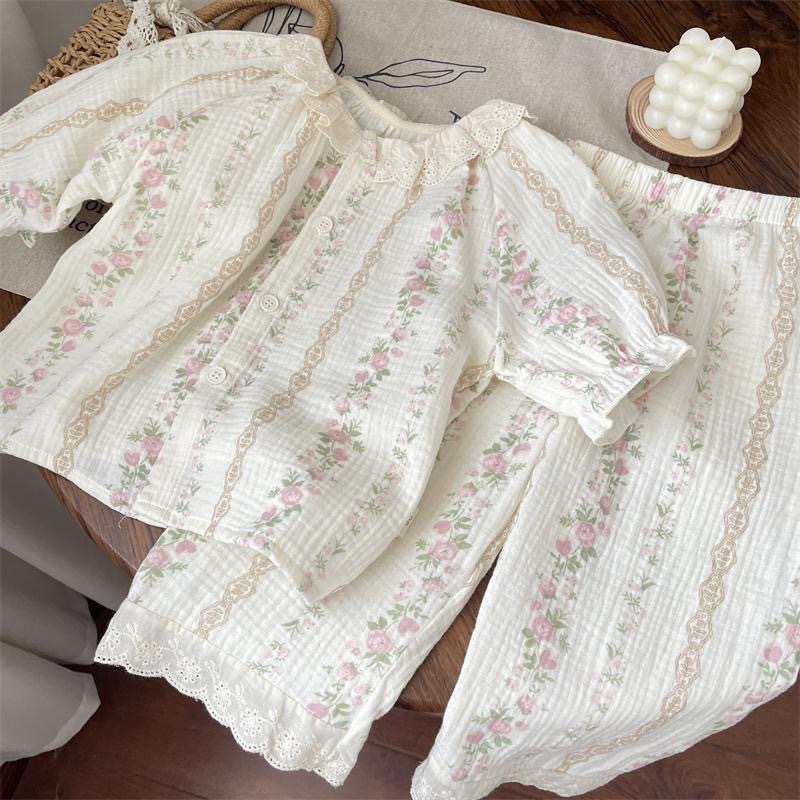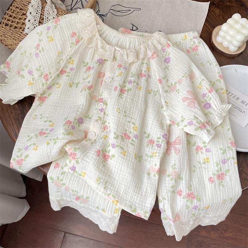 여자 잠옷 여름 한국 스타일 빈티지 꽃 반팔 바지 홈 의류 세트