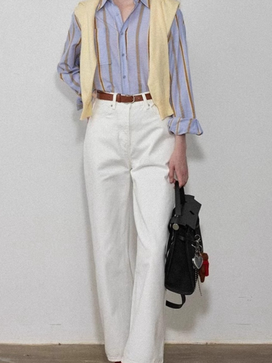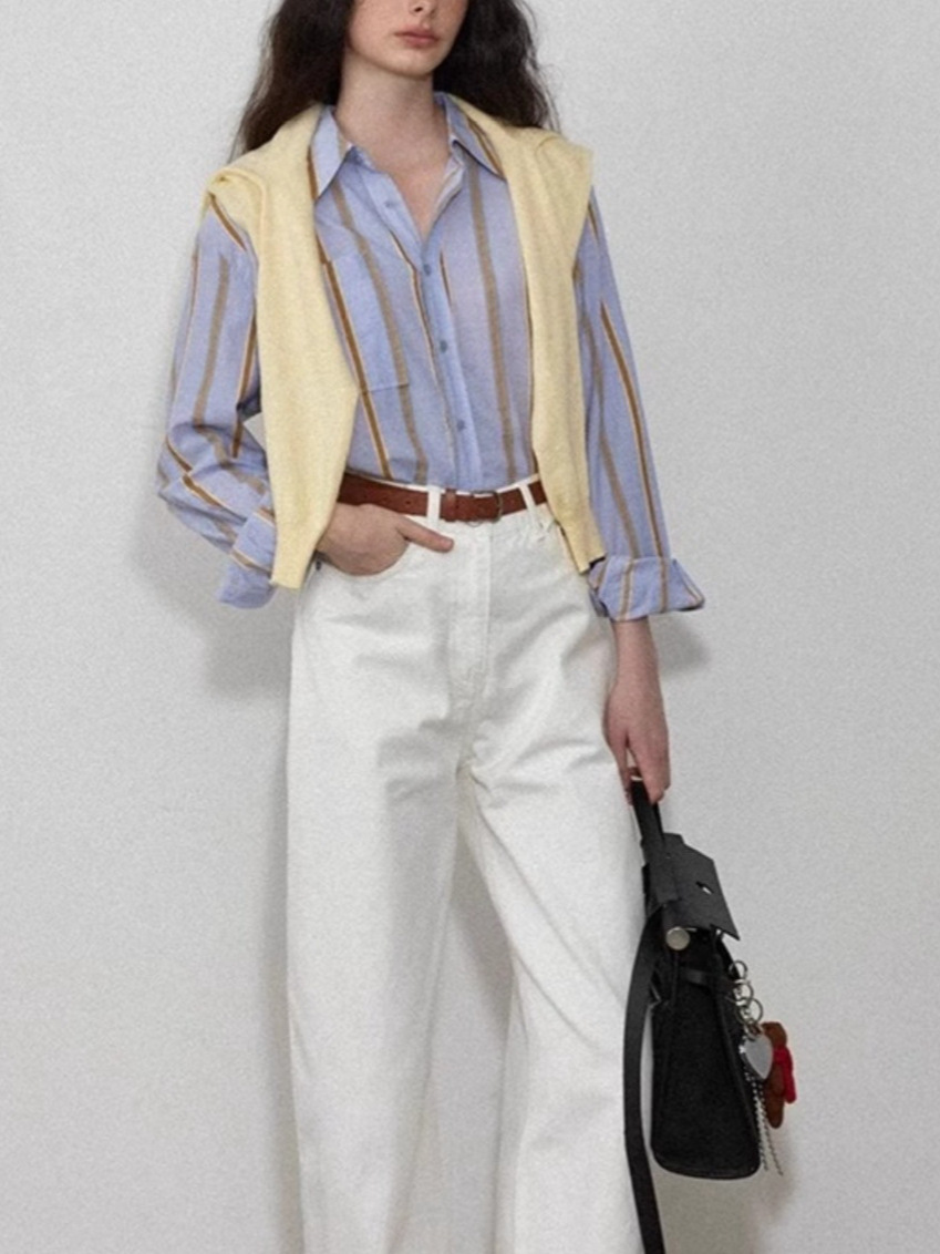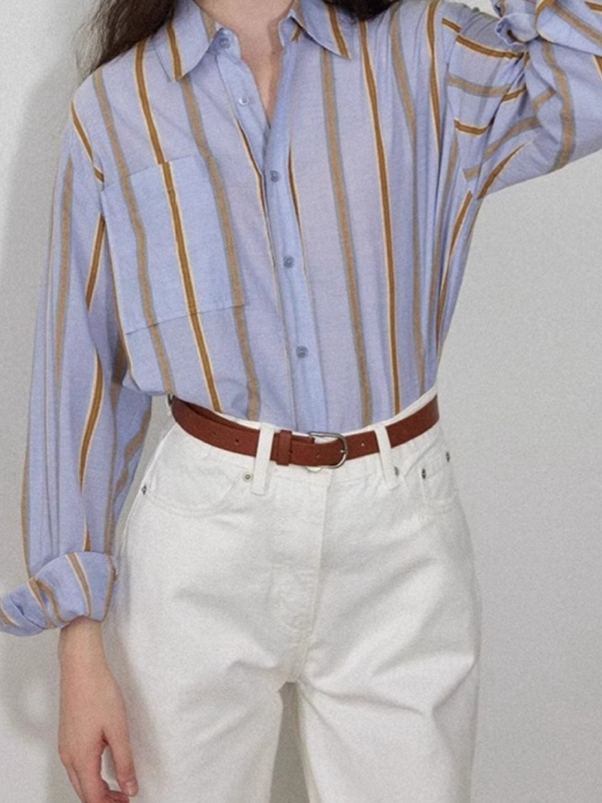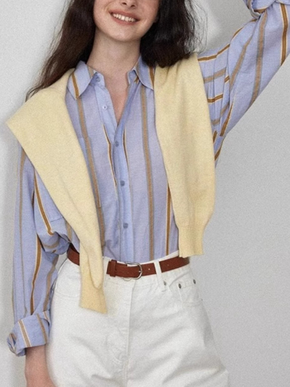 Haiyan 달콤한 오렌지 파이 프랑스 우아한 느슨한 파란색 노란색 줄무늬 셔츠 여성의 이른 봄 2025 옷깃 캐주얼 셔츠스토어 가기