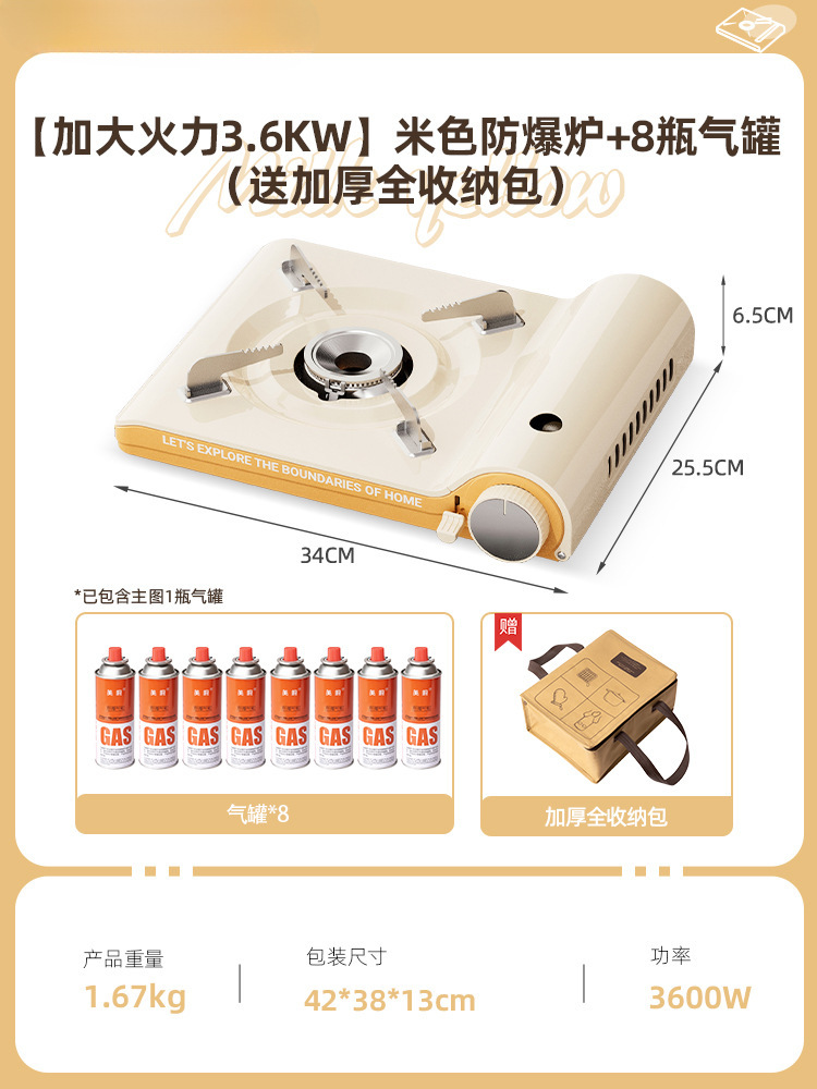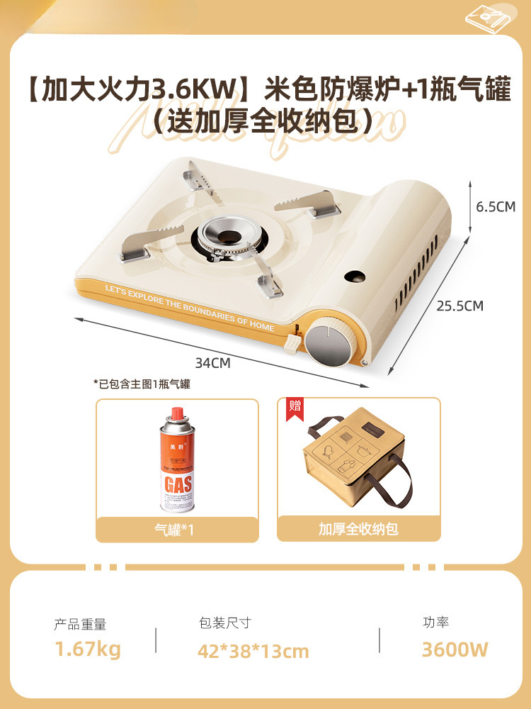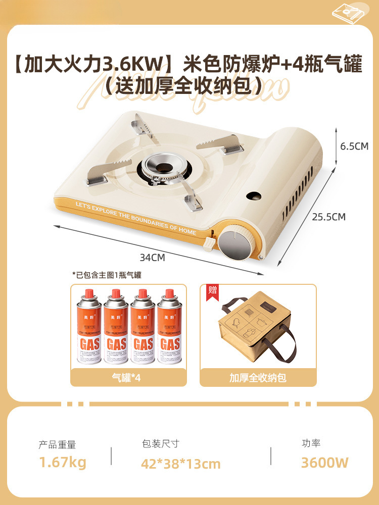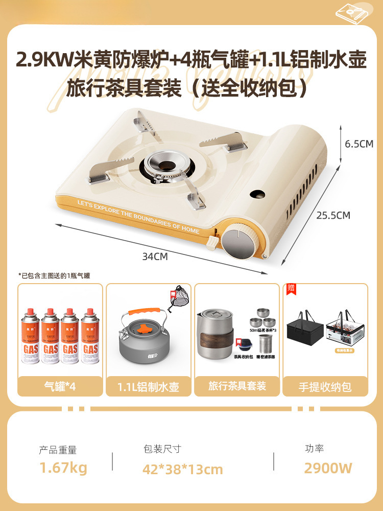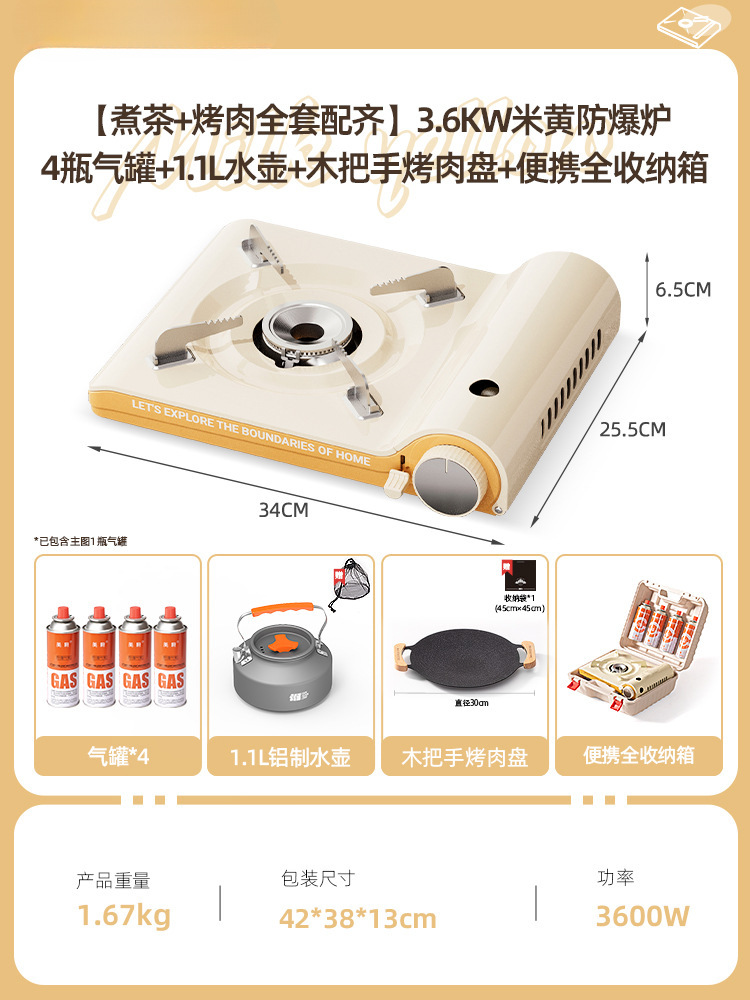 • [차 만들기 + 바비큐 방풍 완전 세트] 3.6KW 베이지 방폭 스토브 + 가스 탱크 4개 + 1.1L 주전자 + 나무 손잡이 바비큐 플레이트 + 앞 유리 + 휴대용 전체